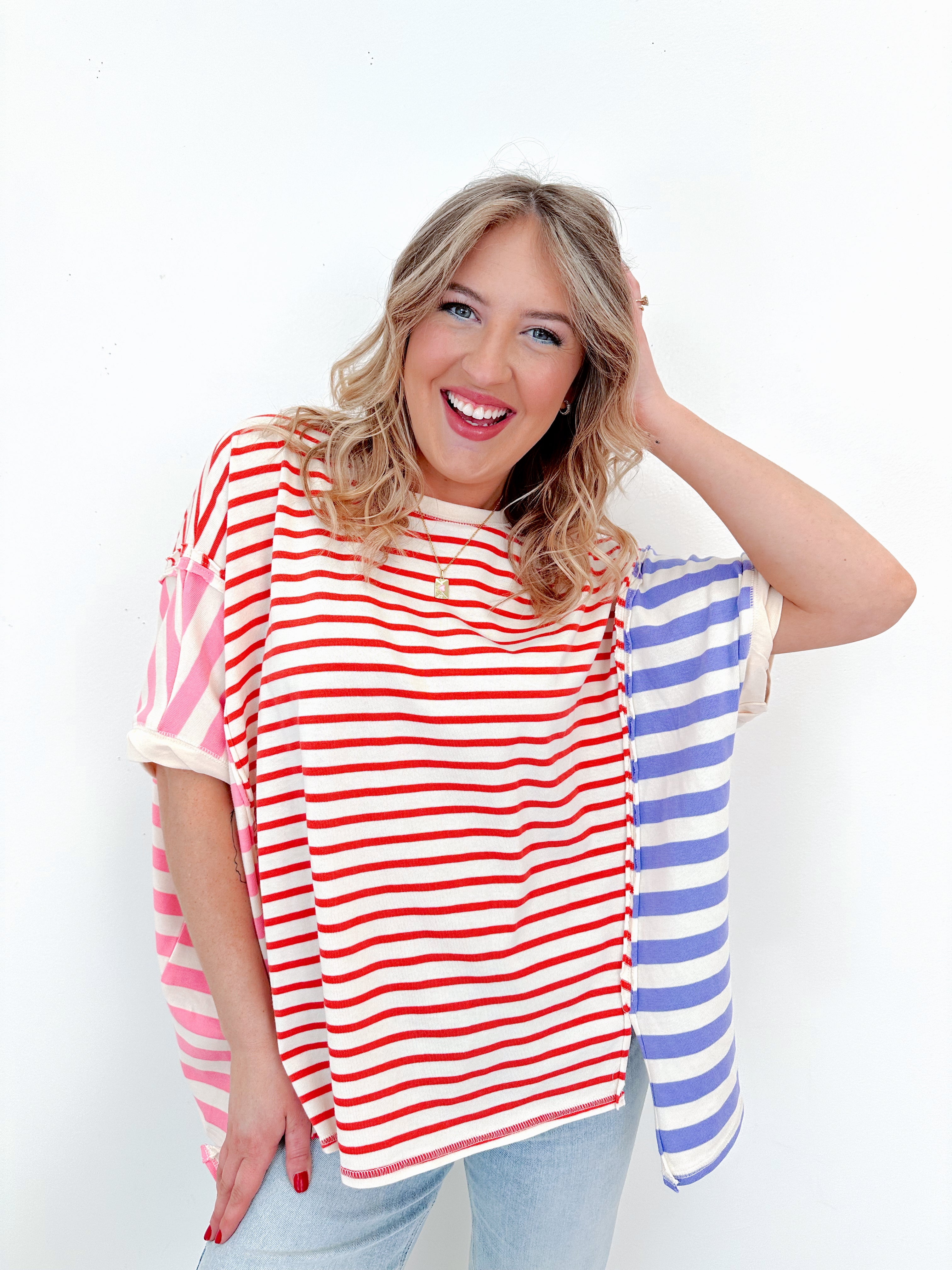 - Featuring a super soft striped fabric, a round neck, a drop shoulder short sleeve, a side slit contrasting hi-low hem, reverse seam detailing throughout, and is completed with a colorblock design of both a bold pink and purple horizontal striped pattern and a thinner red and white striped pattern.