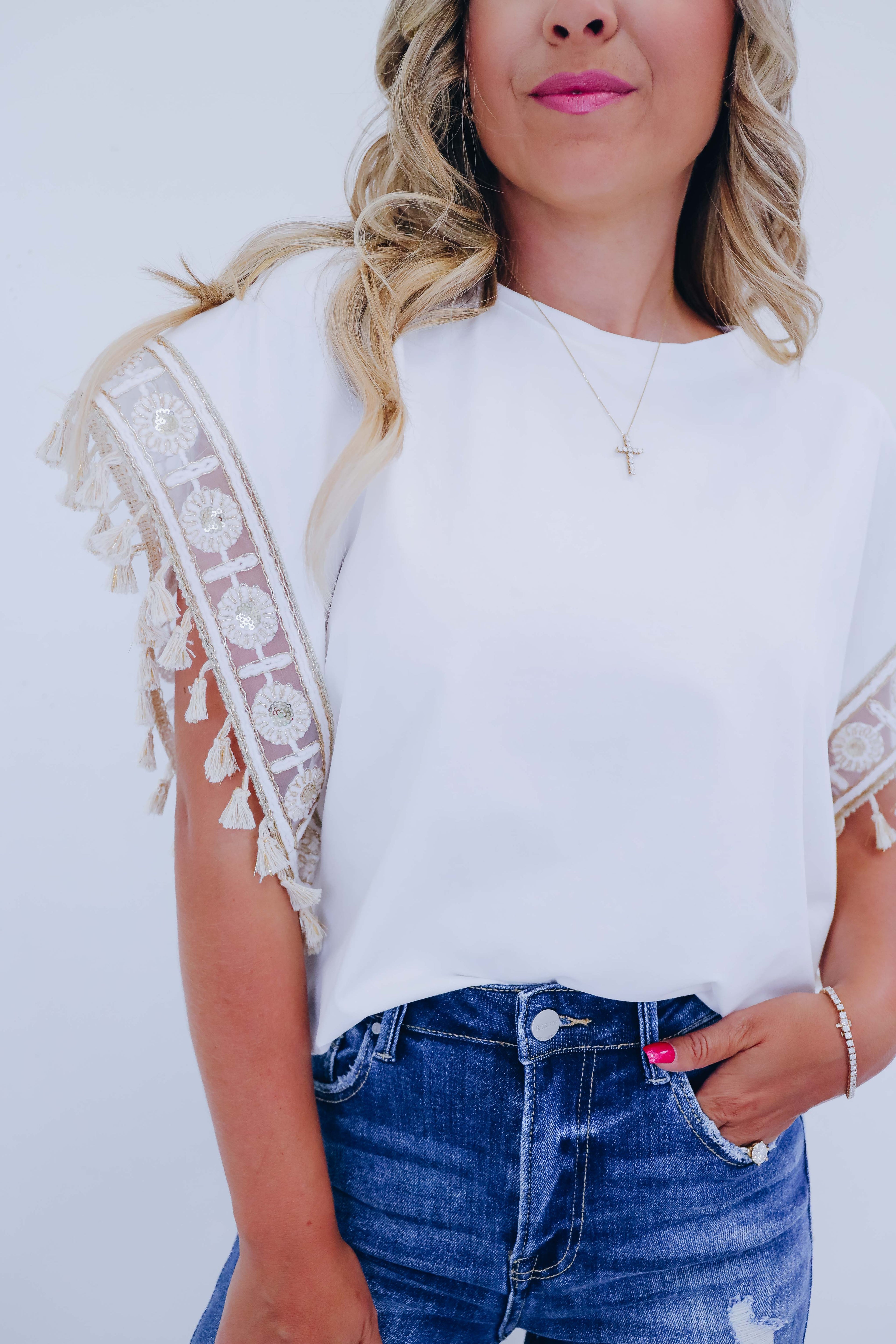 Our Amelia Embroidered Tassel Trim Top exudes a chic classy vibe that can be effortlessly styled for any occasion. Its comfy boxy design pairs perfectly with your favorite bottoms, creating a stylish option for a trendy OOTD.