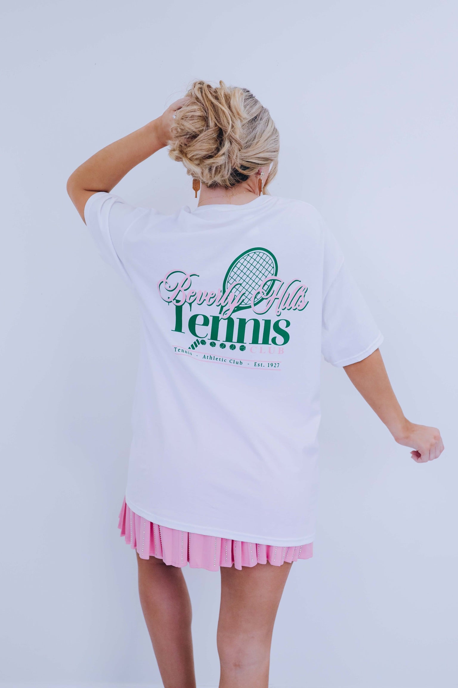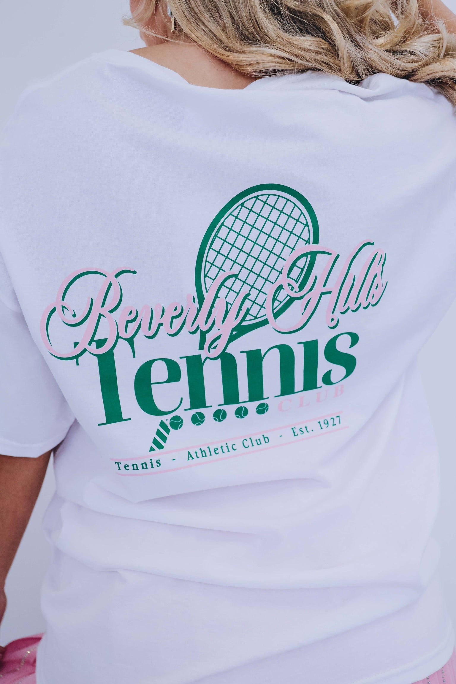 - Features a white base, crew neck, short sleeves, with pink and green graphics of "Beverly Hills Tennis Club" overlaying a tennis racket with a banner underneath with Tennis Athletic Club EST 1927 all on the back and a pink cursive font graphic of "Beverly Hills Club" on the front chest.