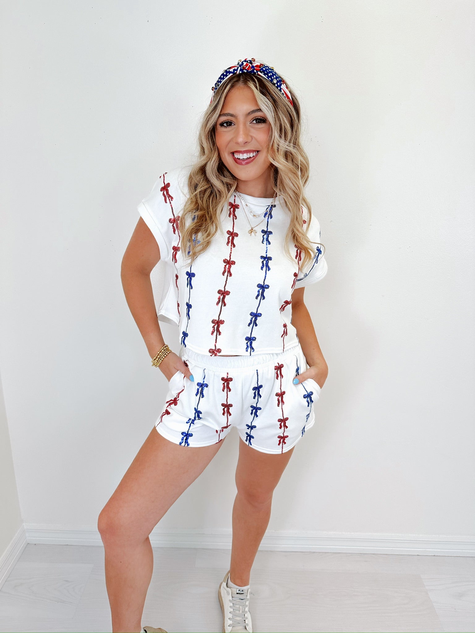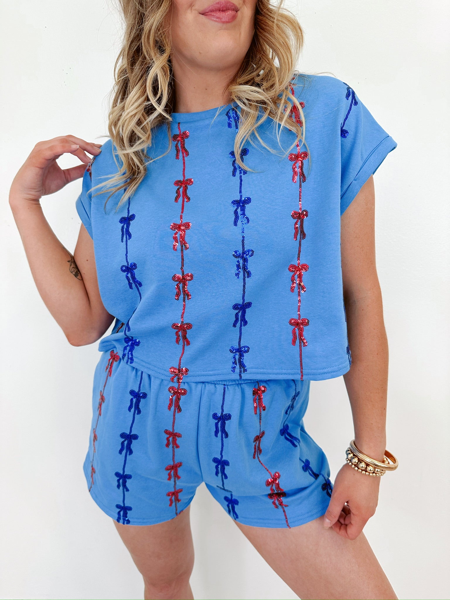 - This set features a jersey knit fabric, the crop top has a crew neck, short sleeves, and a vertical sequin bow streamer detail, while the shorts have a high elastic waist, with the same sequin bow detail, and side slit pockets.