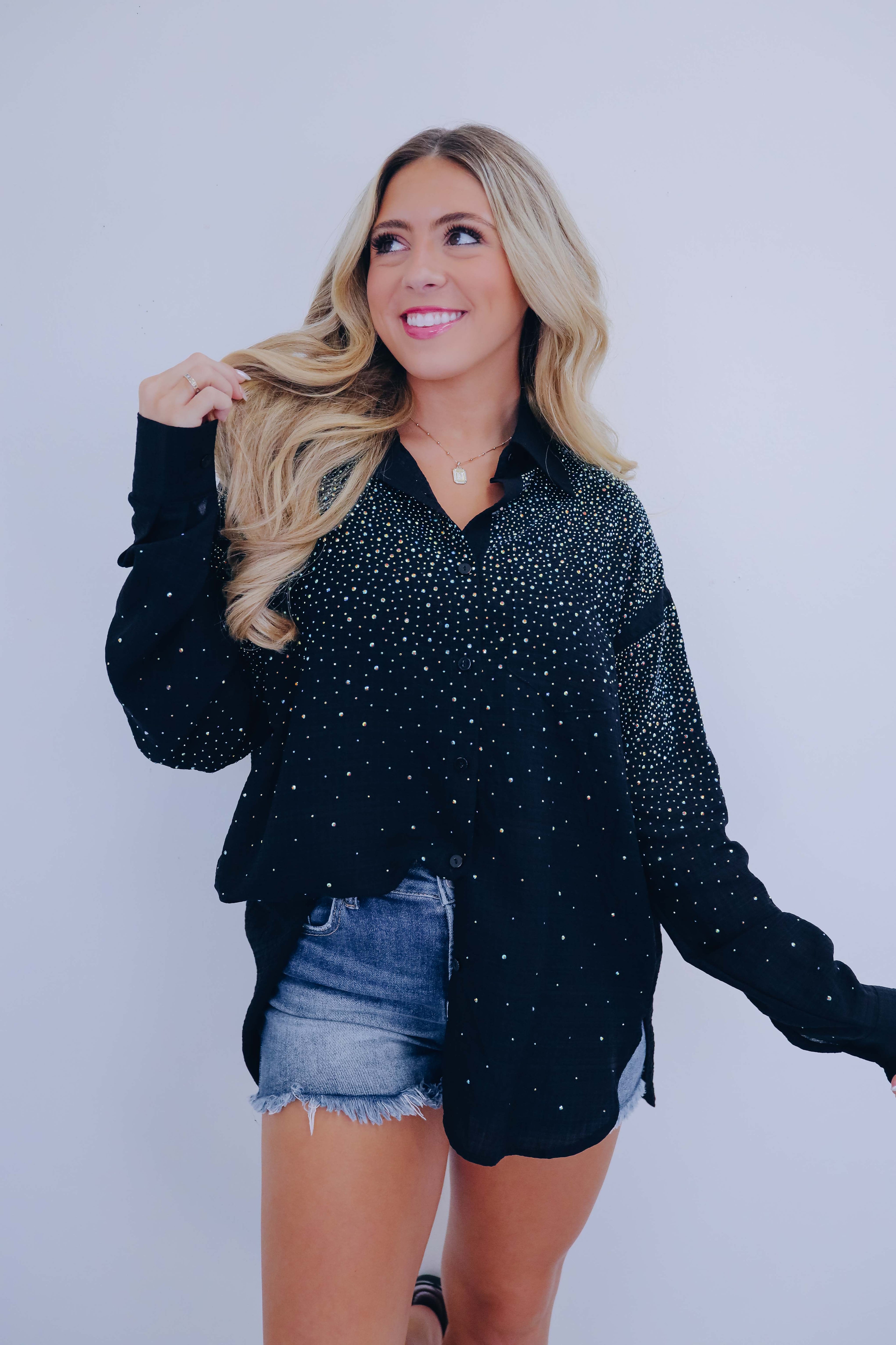• Our new versatile Cascading Rhinestone Button Up Shirt is a must-have addition to any wardrobe. This cutie can easily be styled for various occasions throughout the season, whether worn on its own with your favorite denim or paired with a cute crop, shorts, and boots for a trendy concert fit.