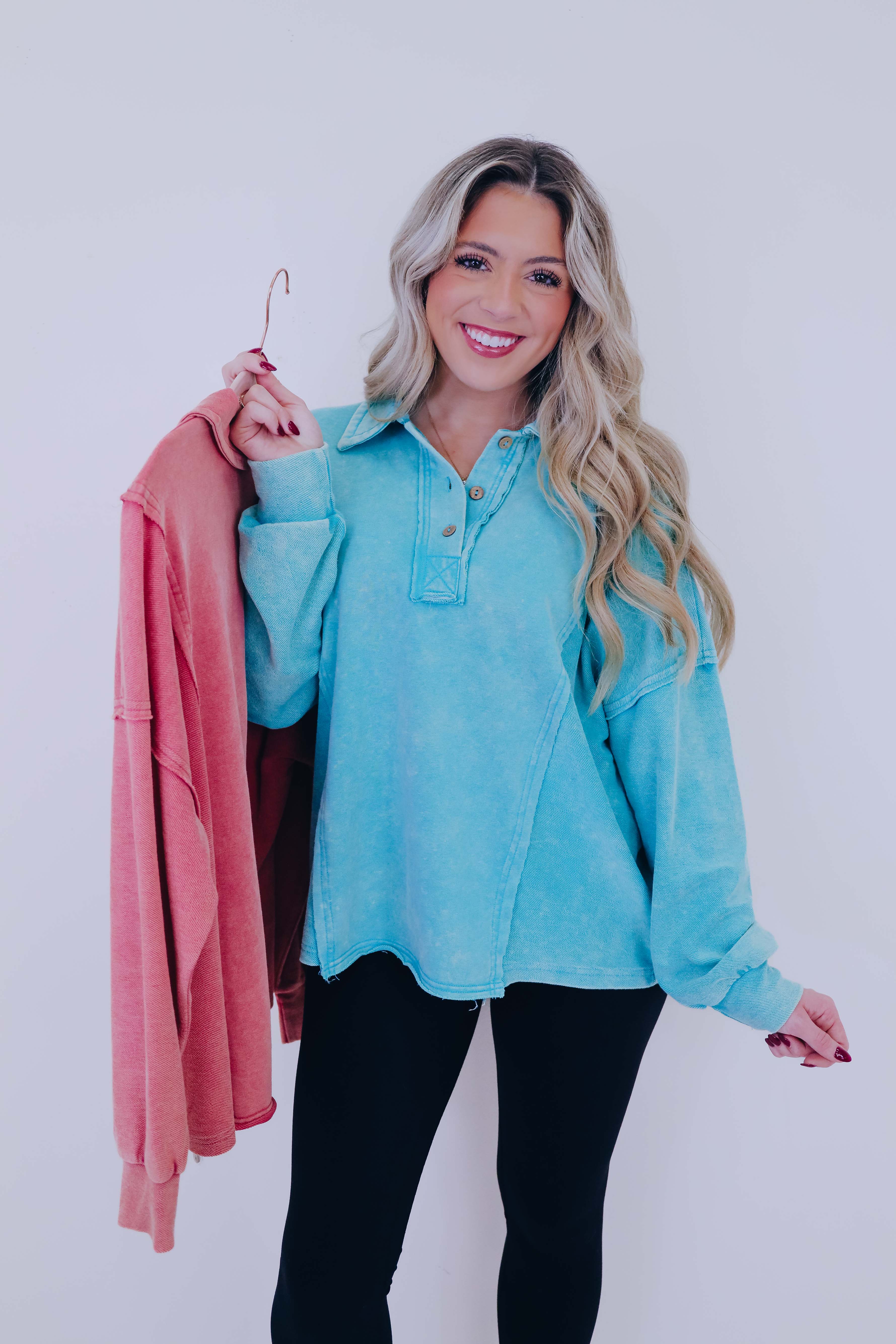 - Oversized, roomy, and oh so soft, our Caleb Collared Washed Henley Top is a trendy yet casual must have. This cutie can be styled a variety of ways for a comfy errand day fit, or style with your fav denim and booties for an informal friends and family gathering.