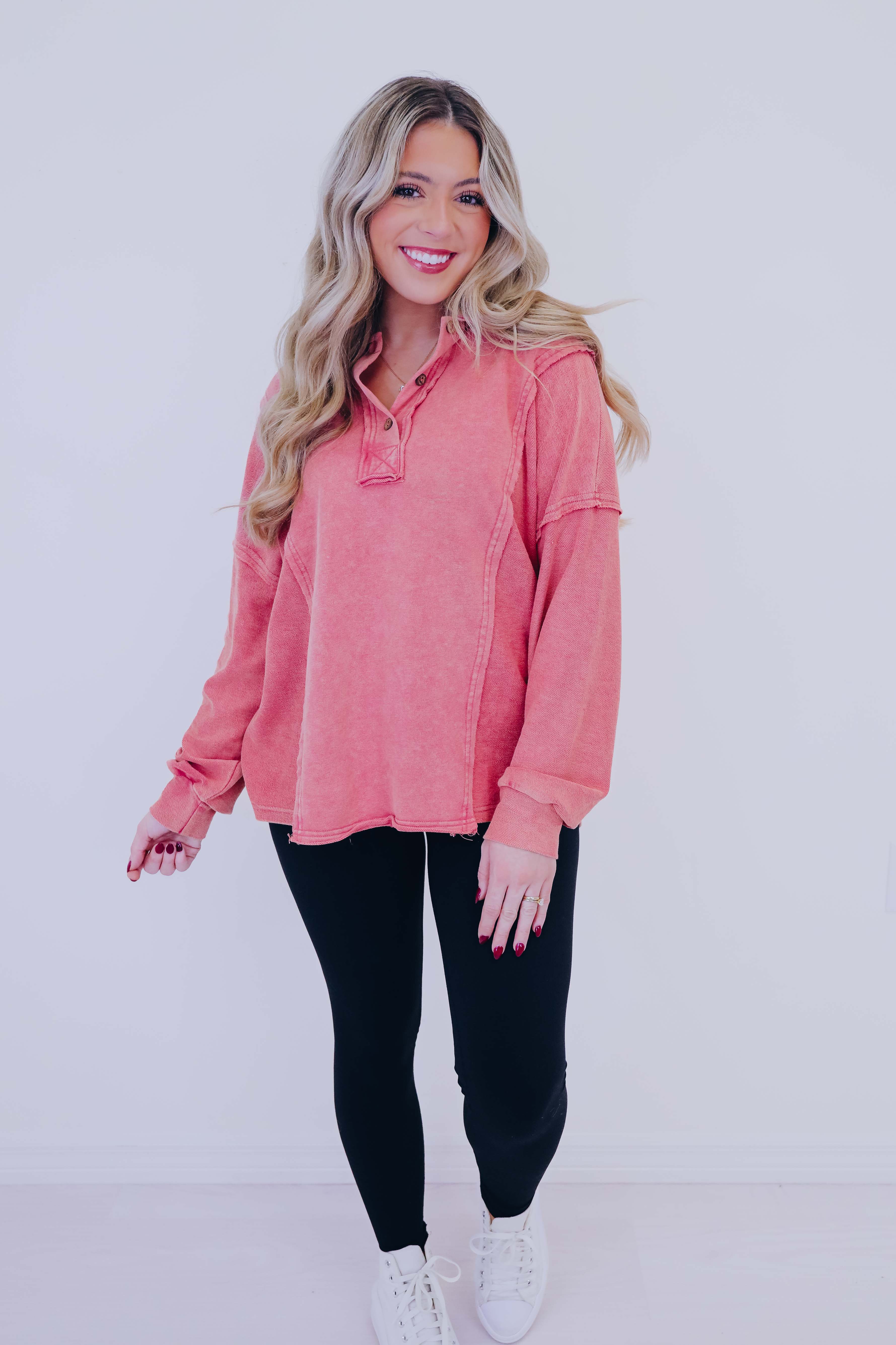 - Featuring a super soft acid washed jersey knit fabric, a collared 3/4 button front, a drop shoulder with banded cuff, reverse seam raw edge blocking detail, and a raw edge hem.