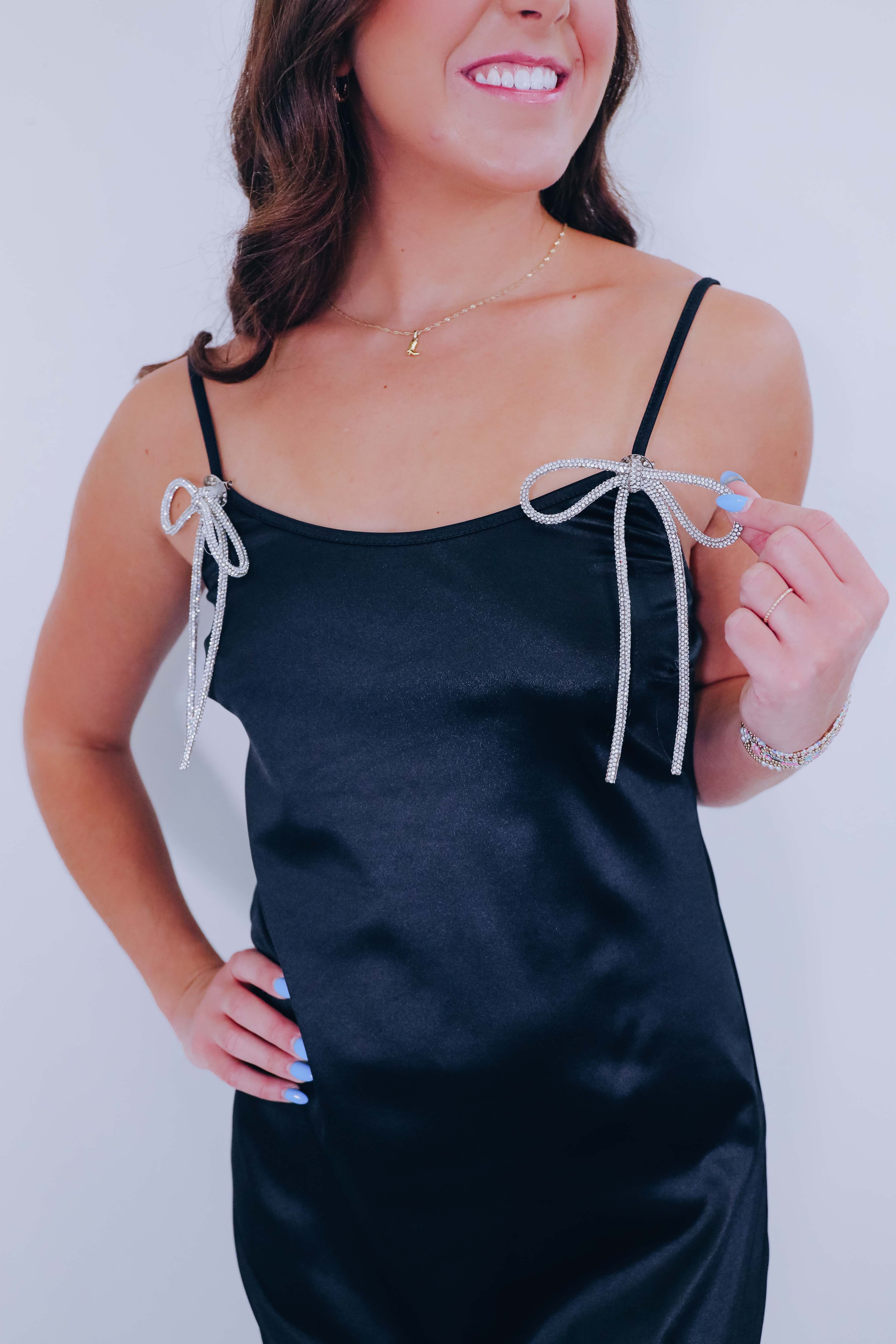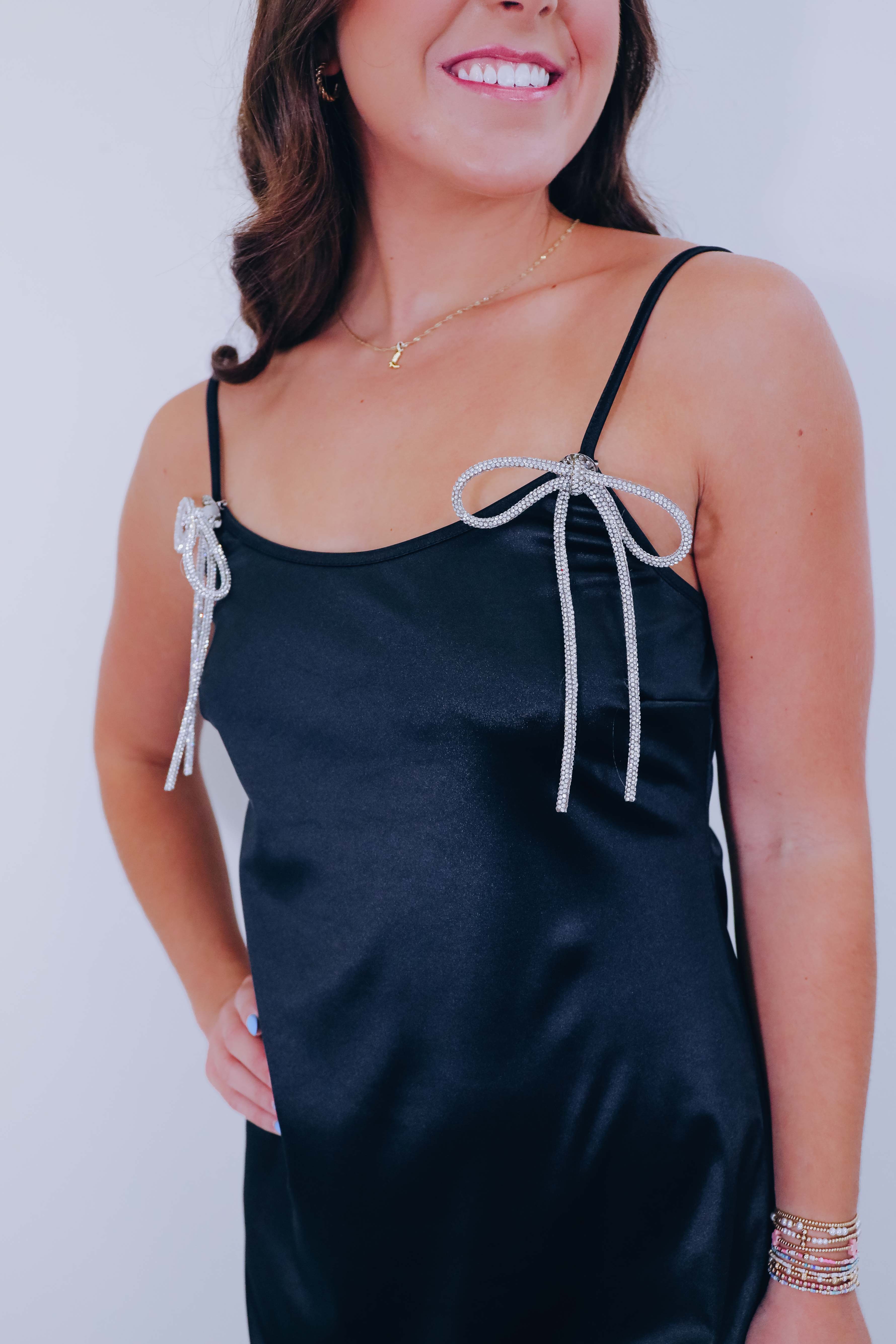 - Our Cutie Bow Rhinestone Dress is a super unique must have. Summer is here and this cami will be perfect as a versatile piece in your wardrobe. Easily style with a variety of bottoms for your next special event.