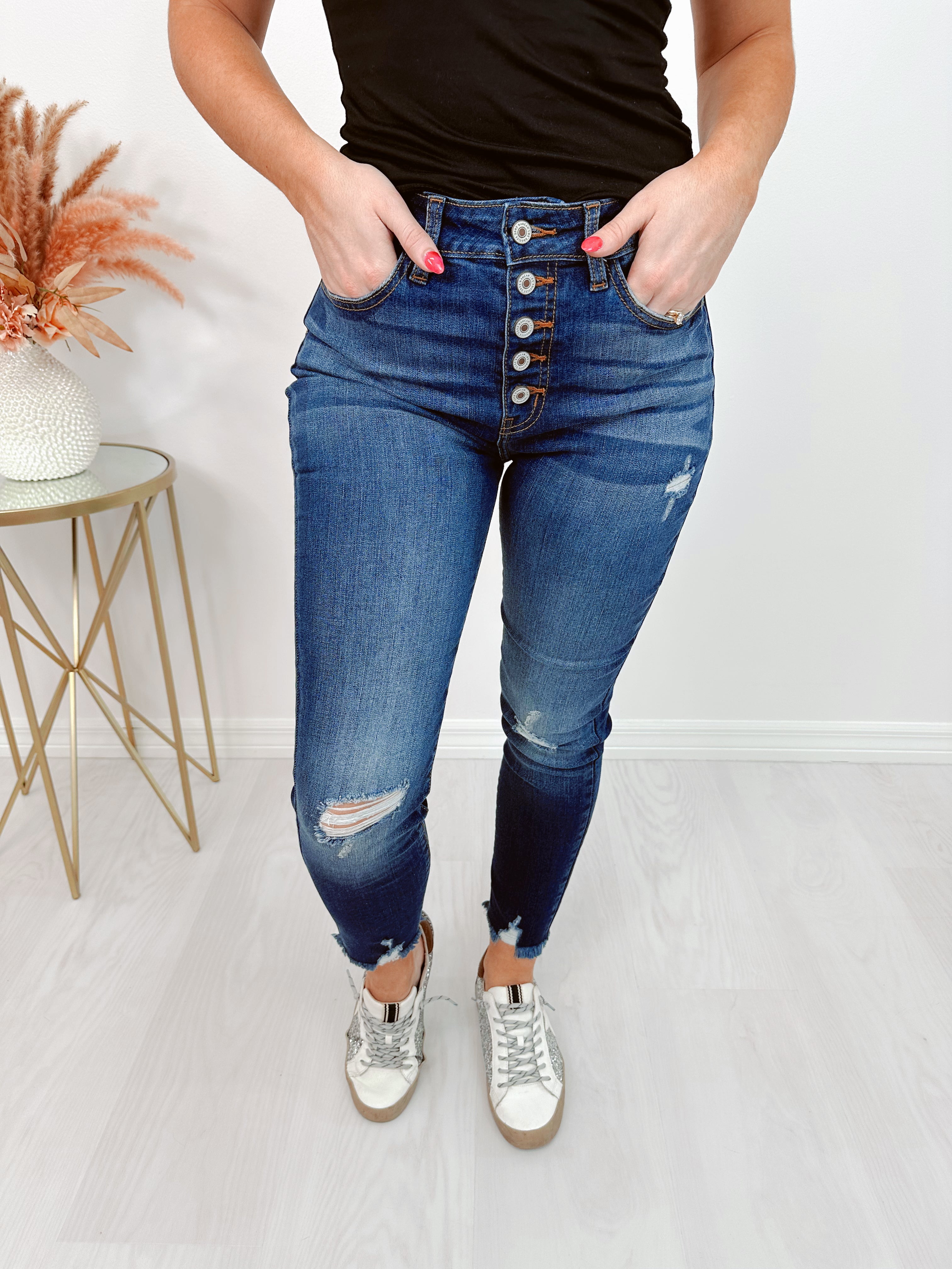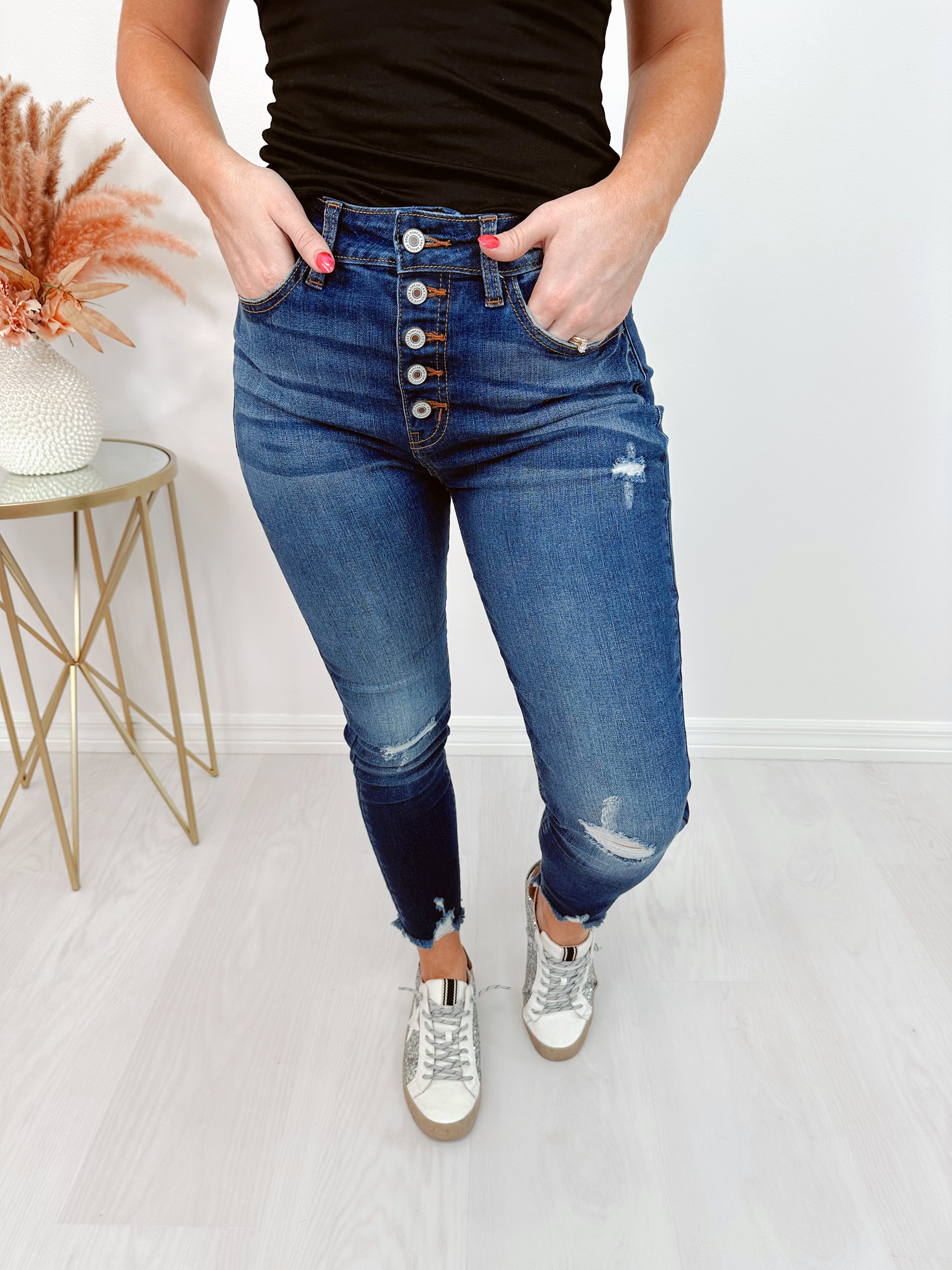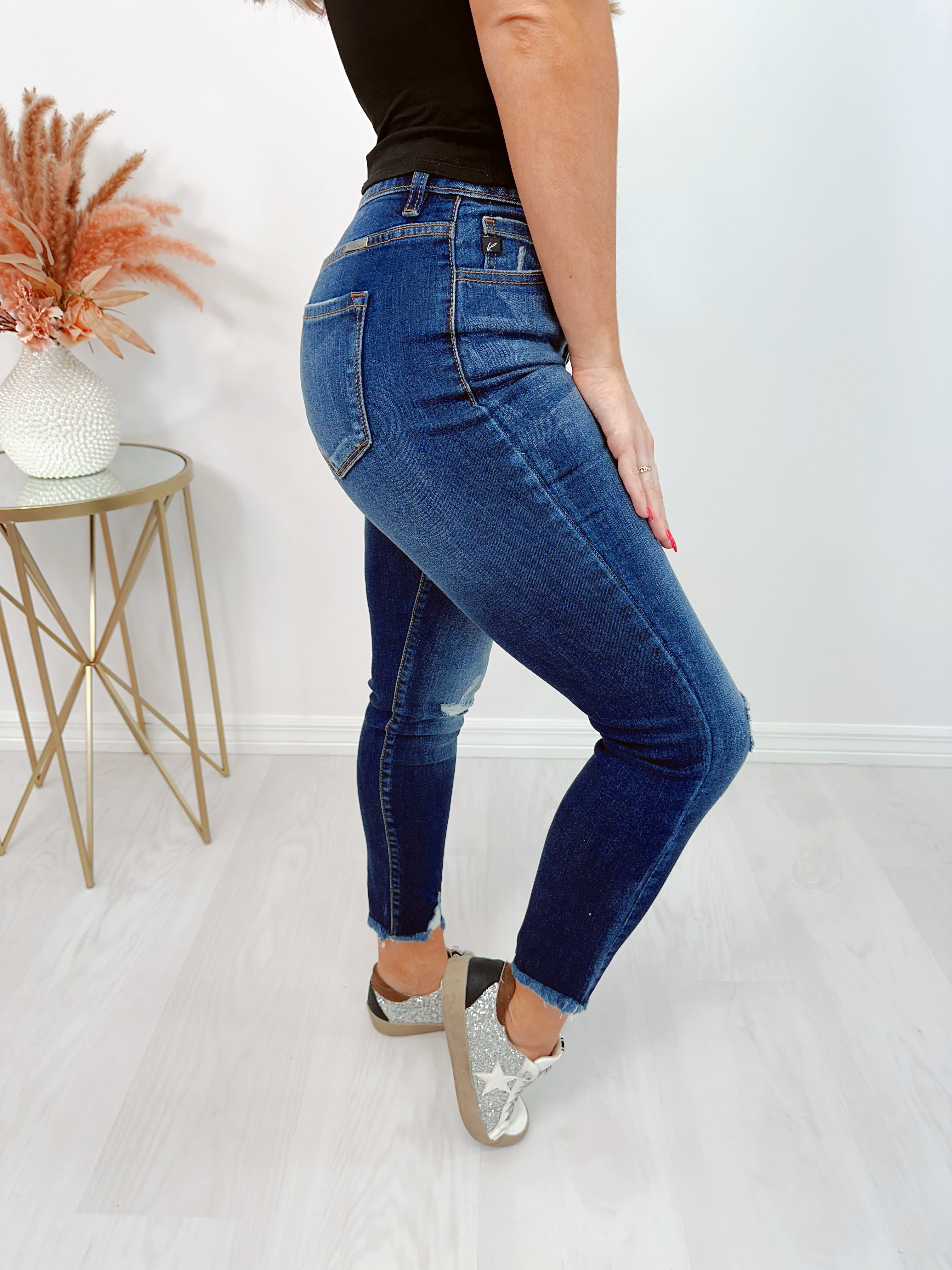 - Features include a dark wash blue denim, 5 pocket design, high waist, a five button fly closure, distressing detail on knees and thighs, and a frayed ankle length hem.