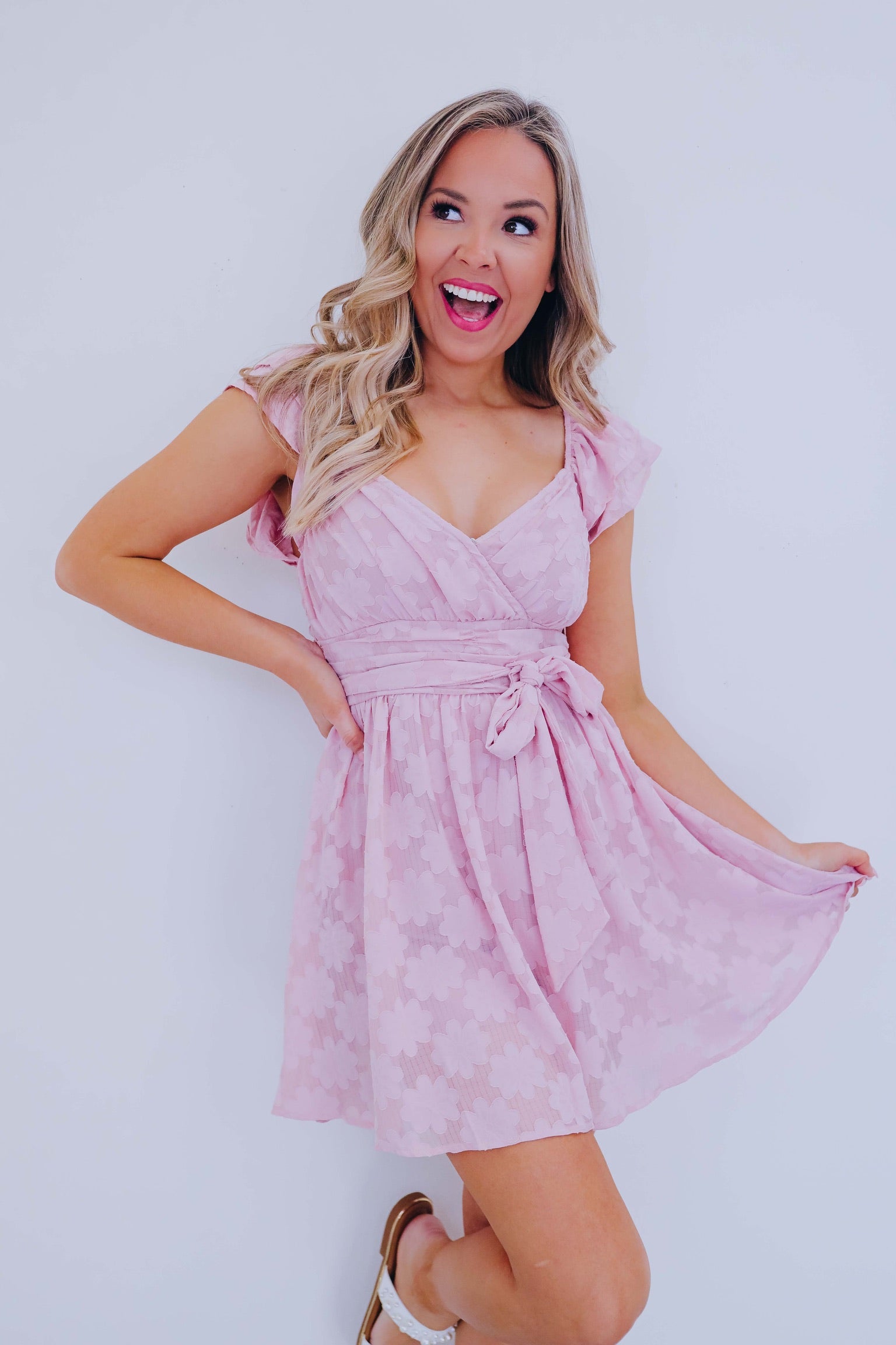 - Elevate your look with our Everly Embossed Floral Mini Dress Romper, a feminine and chic choice that is perfect for any occasion. Achieve an effortlessly sophisticated vibe, by pairing this mini dress romper with simple jewelry, kitten heels, and a timeless clutch.
