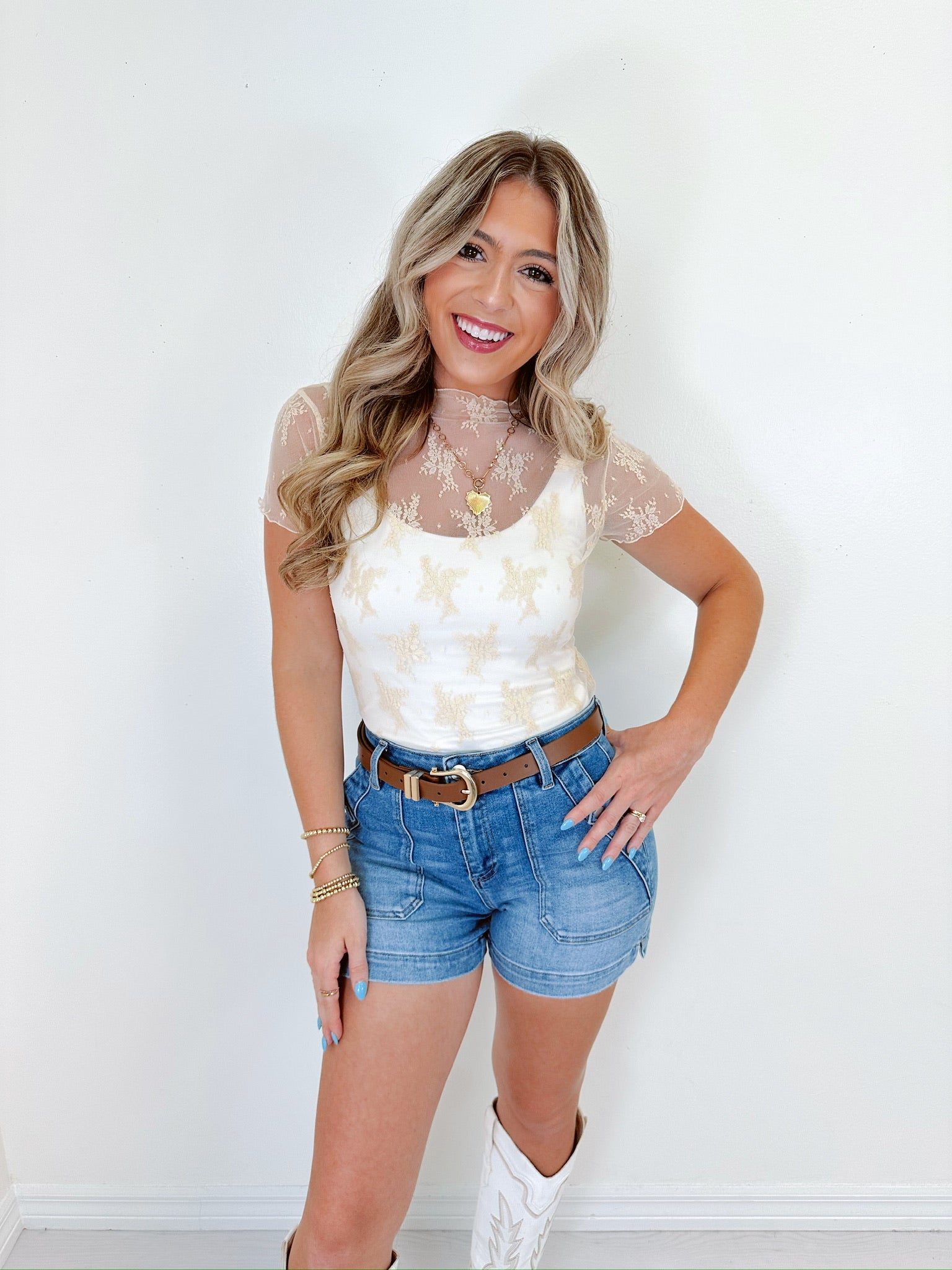 Soft, sheer, and super trendy, our Flora Finesse Mock Neck Mesh Top features a mesh floral design, delicate lettuce trim, and a flattering fit. Style over a bralette and your fav denim, or under a romper for an effortlessly chic OOTD.