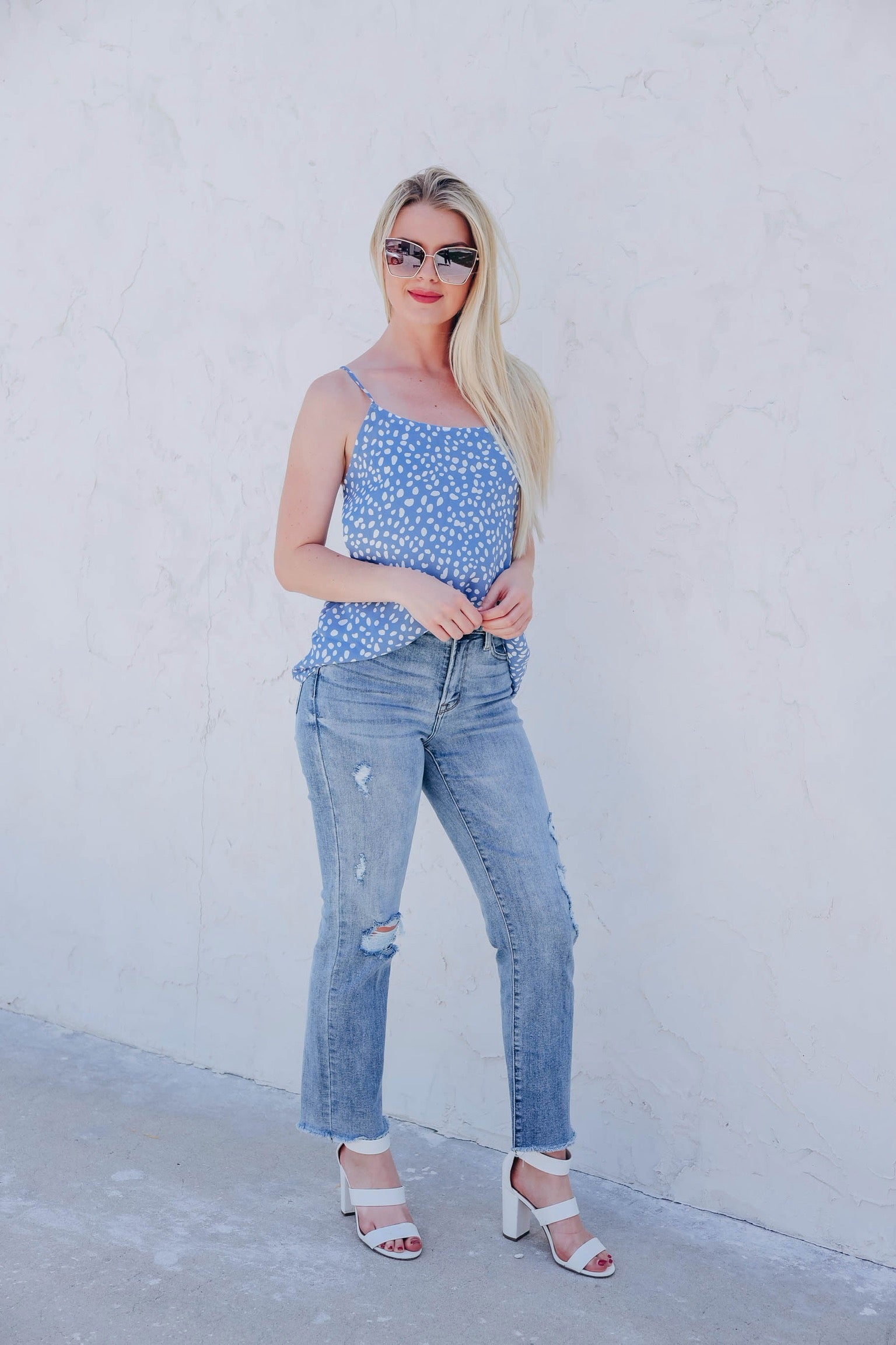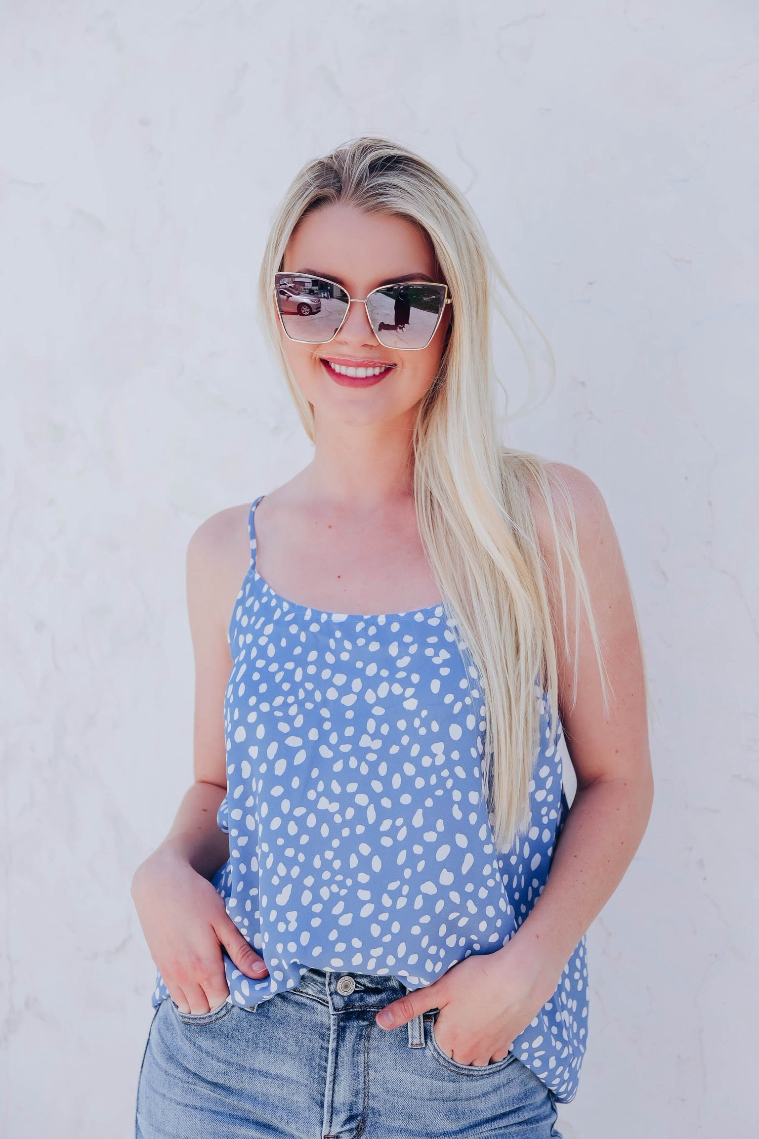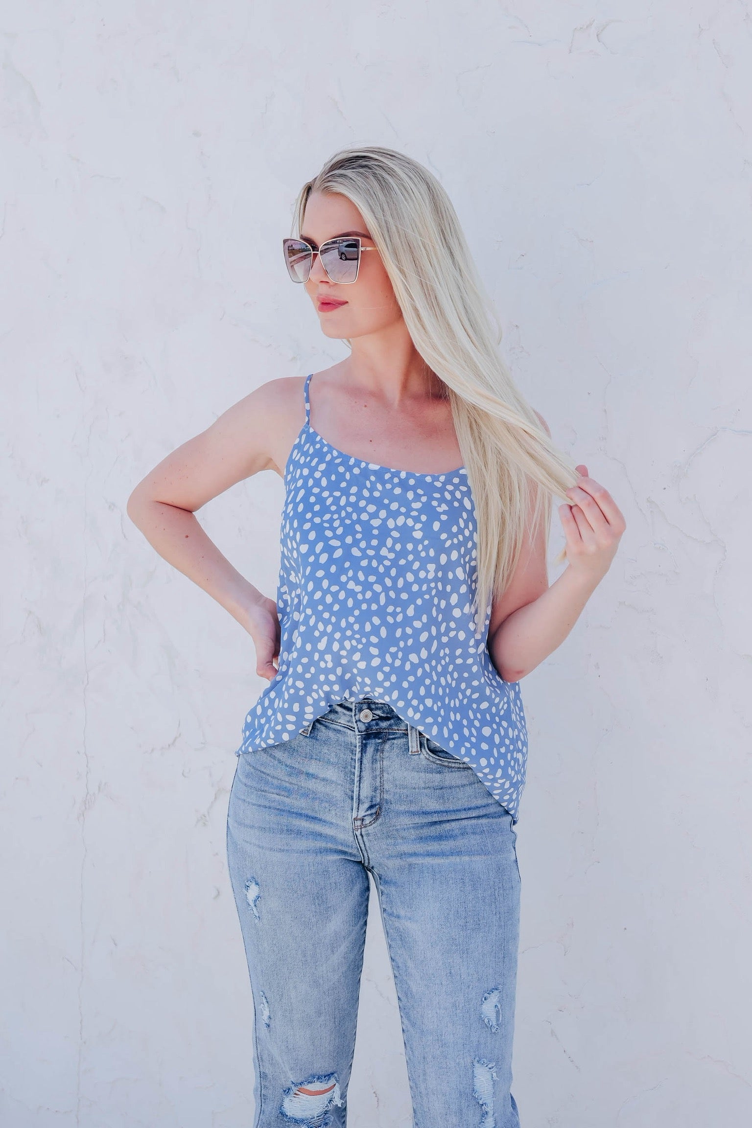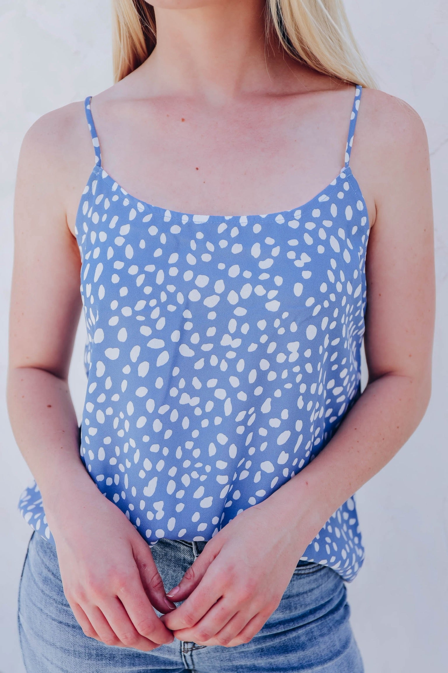 - This spaghetti strap cami is the prettiest shade of blue with a white polka dot pattern! Features a multi criss-cross back detail with a round neckline and round hem.