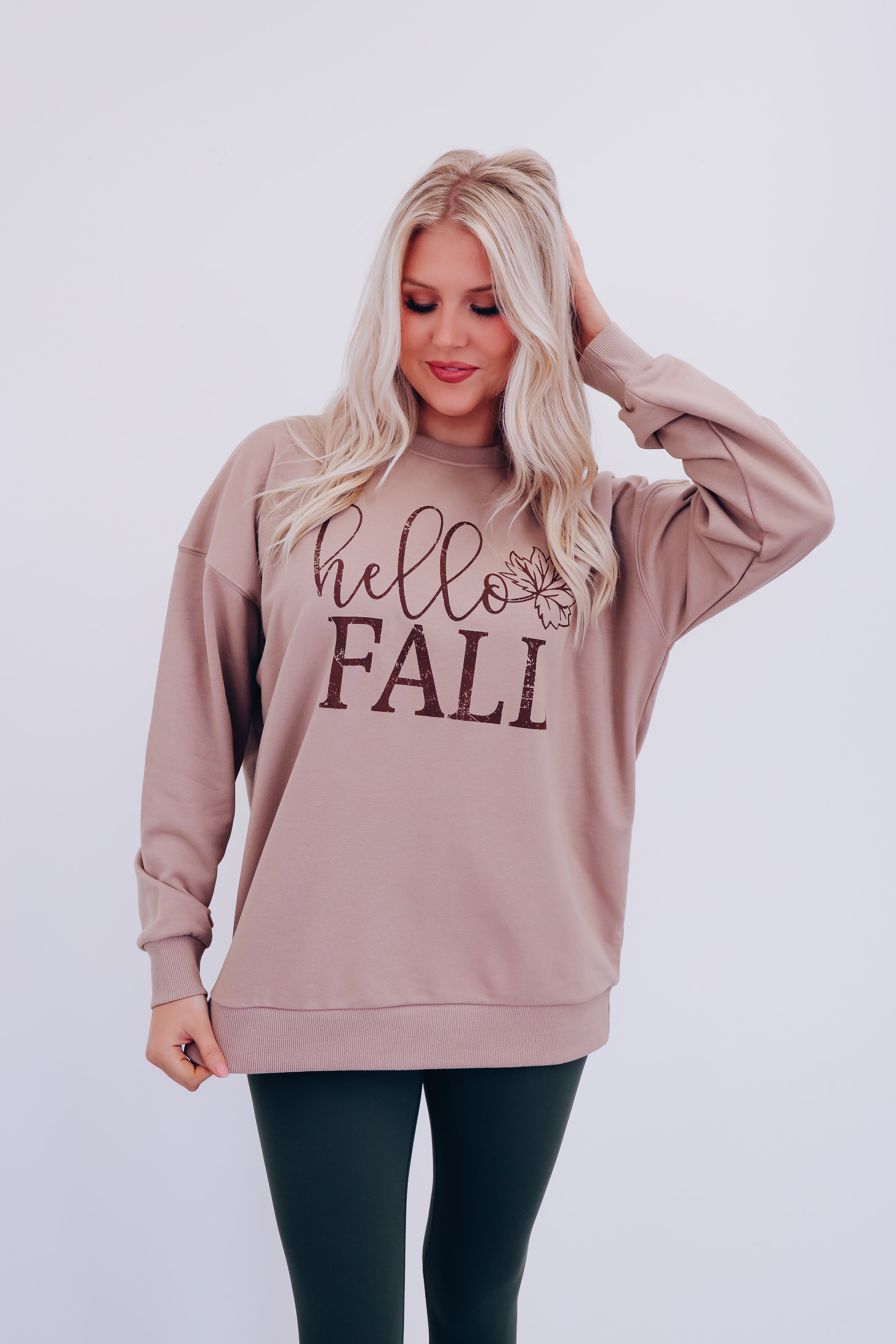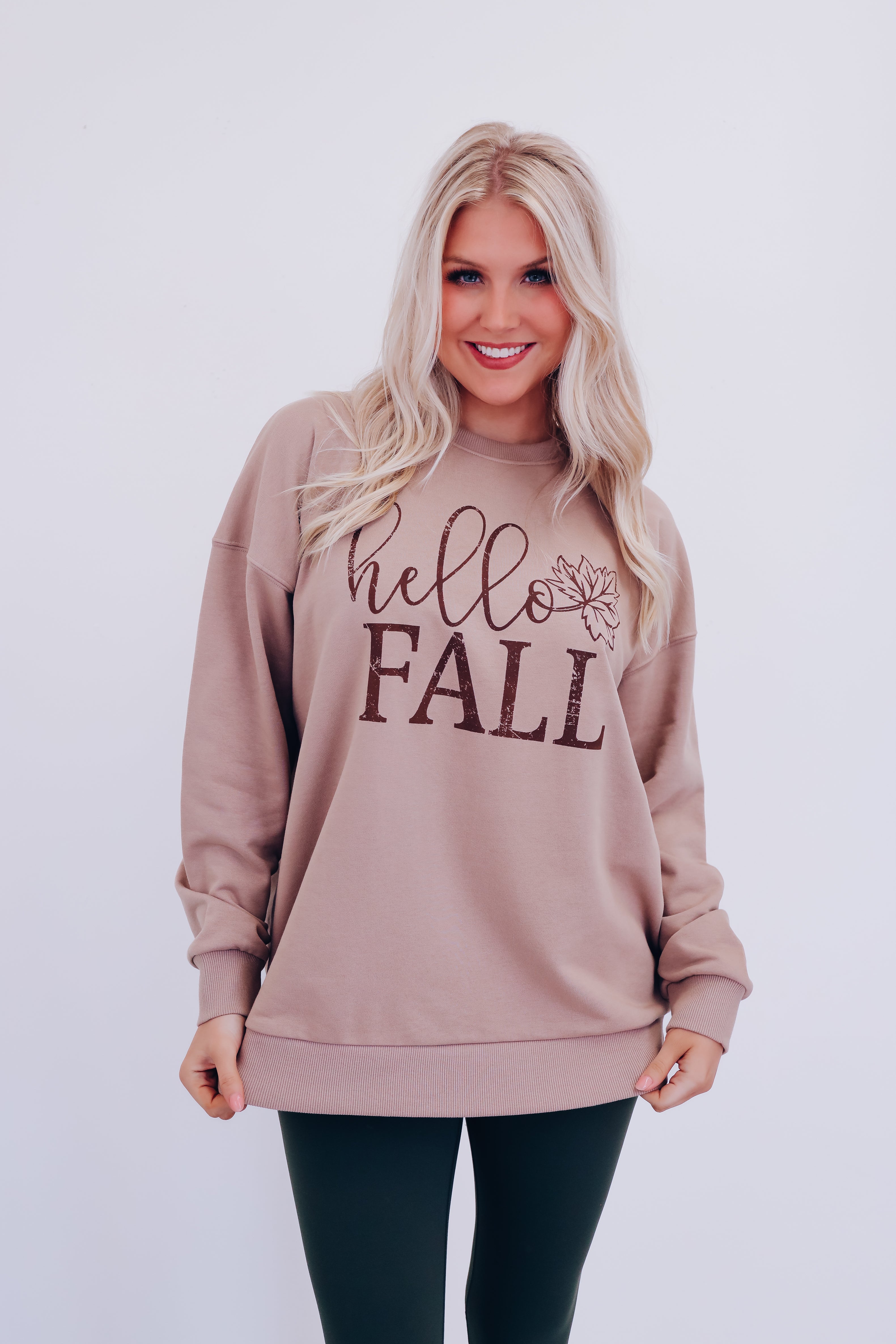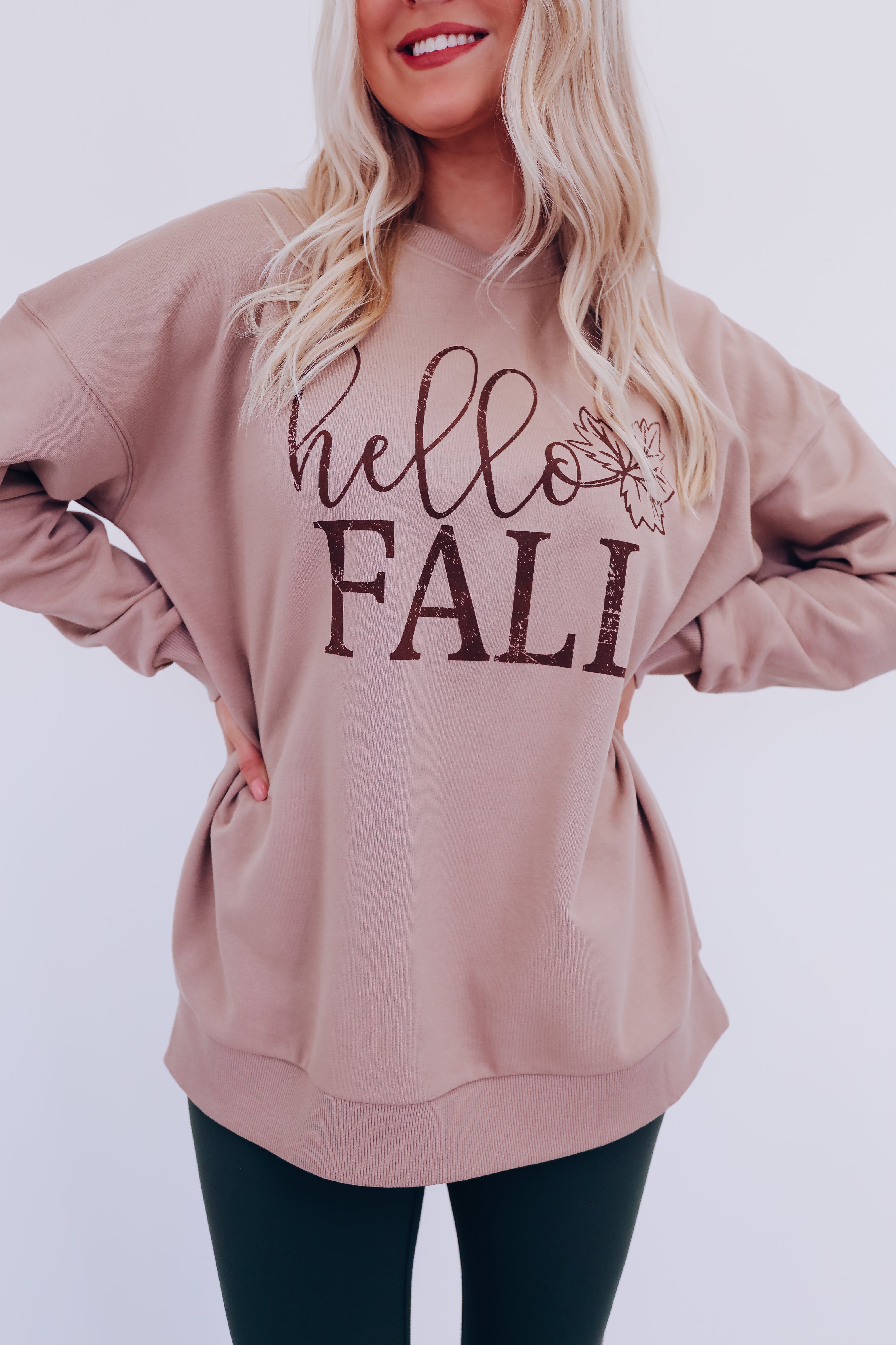 Hello Fall Oversized Graphic Sweatshirt - Tan