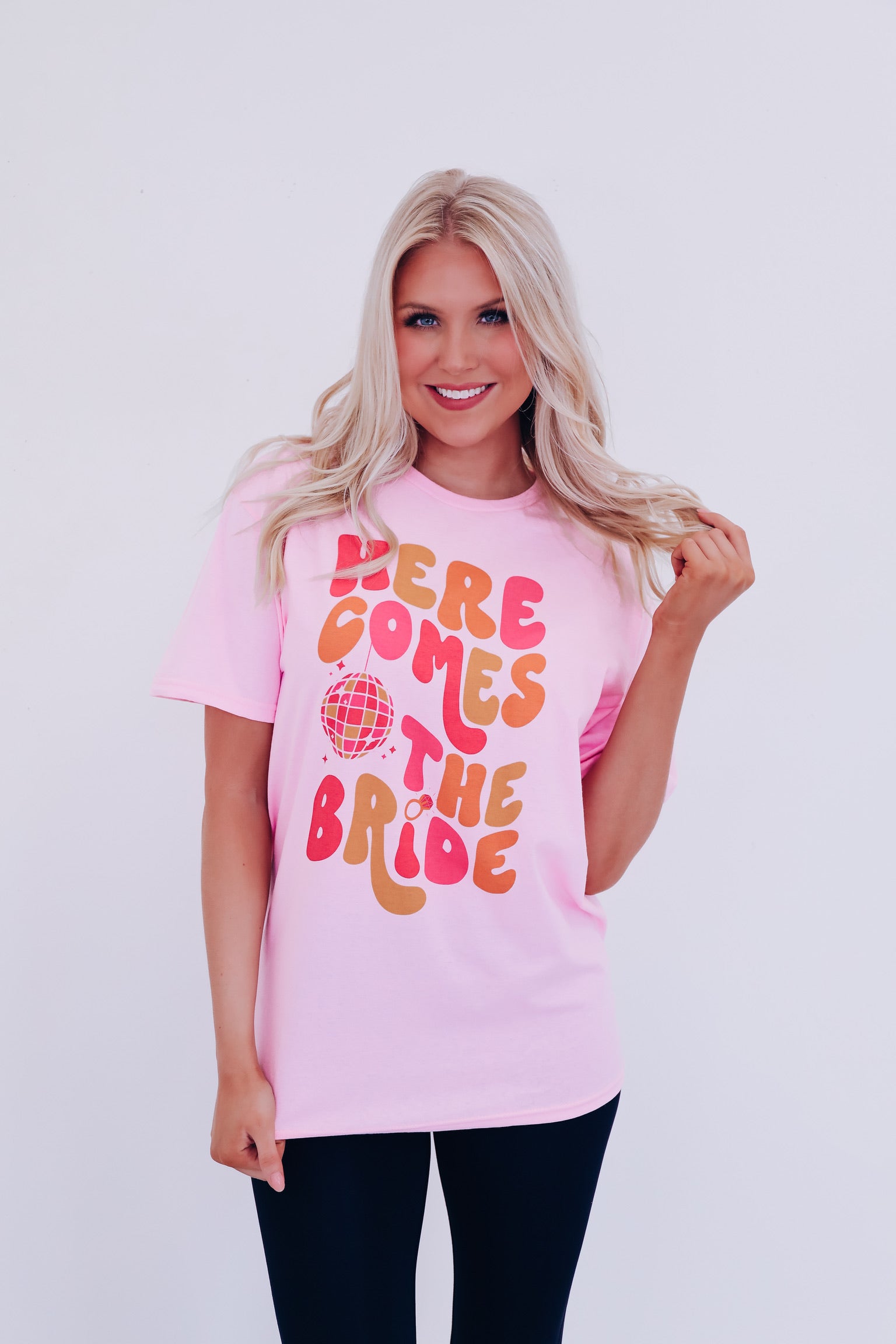 - Features a soft cotton pink base, short sleeves, crew neck, with a multi colored graphic stack reading "Here Comes The Bride" in a pink gold and orange color scheme with a diso ball.