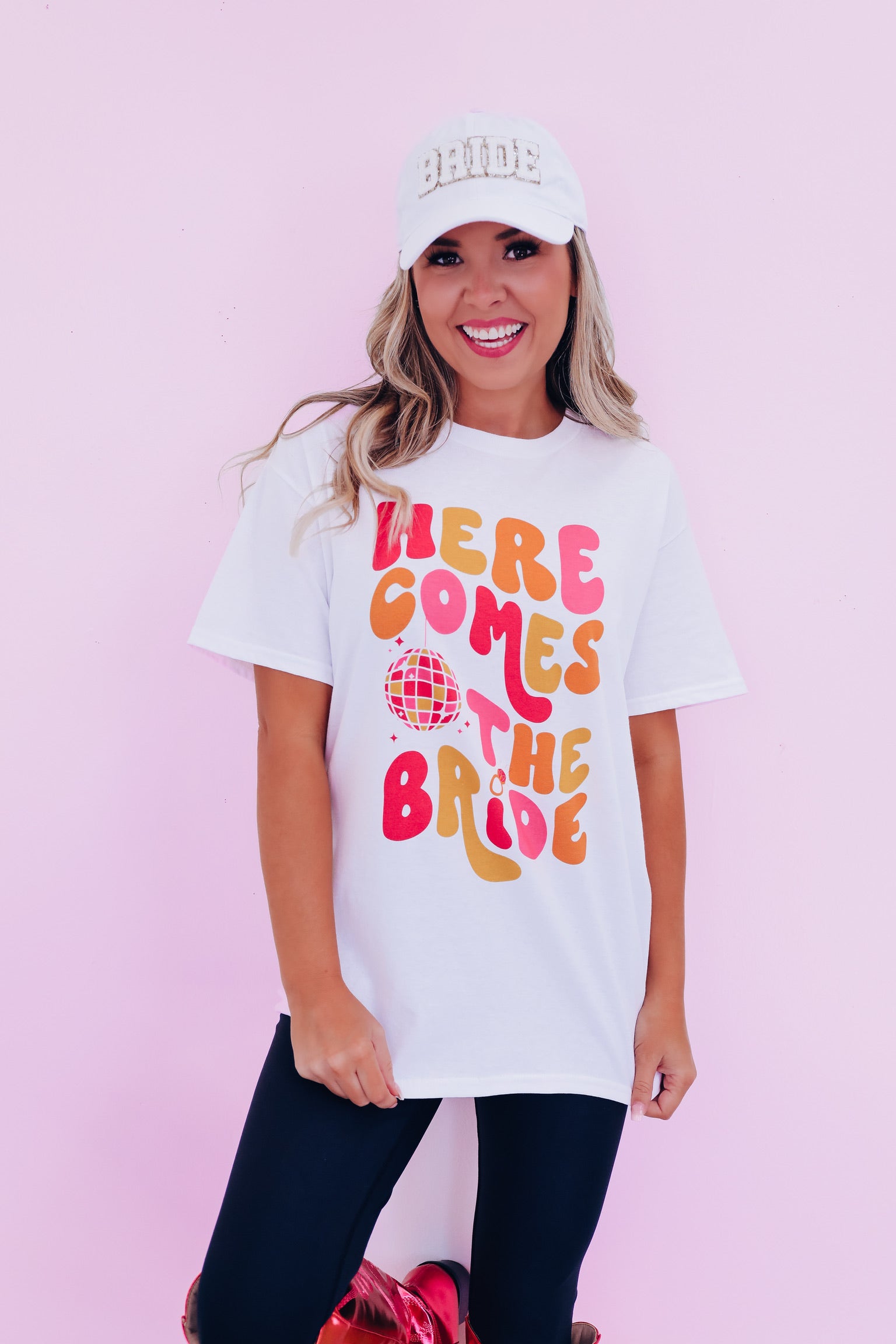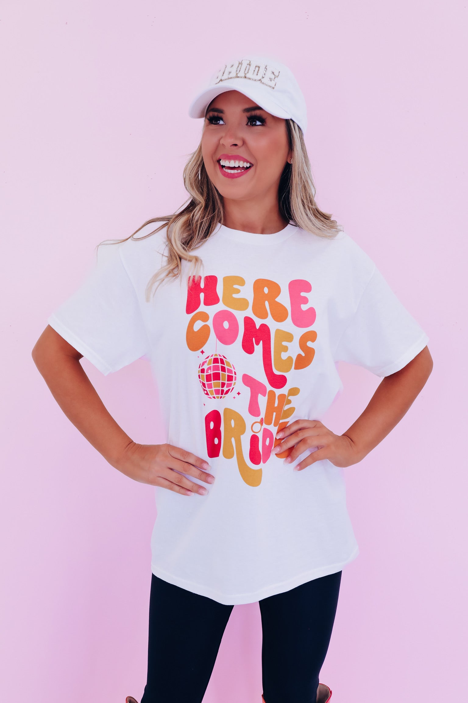 - Stand out on your bach weekend with our Here Comes The Bride Graphic Tee, style with flare jeans, boots, and a jean jacket for a super cute OOTD.