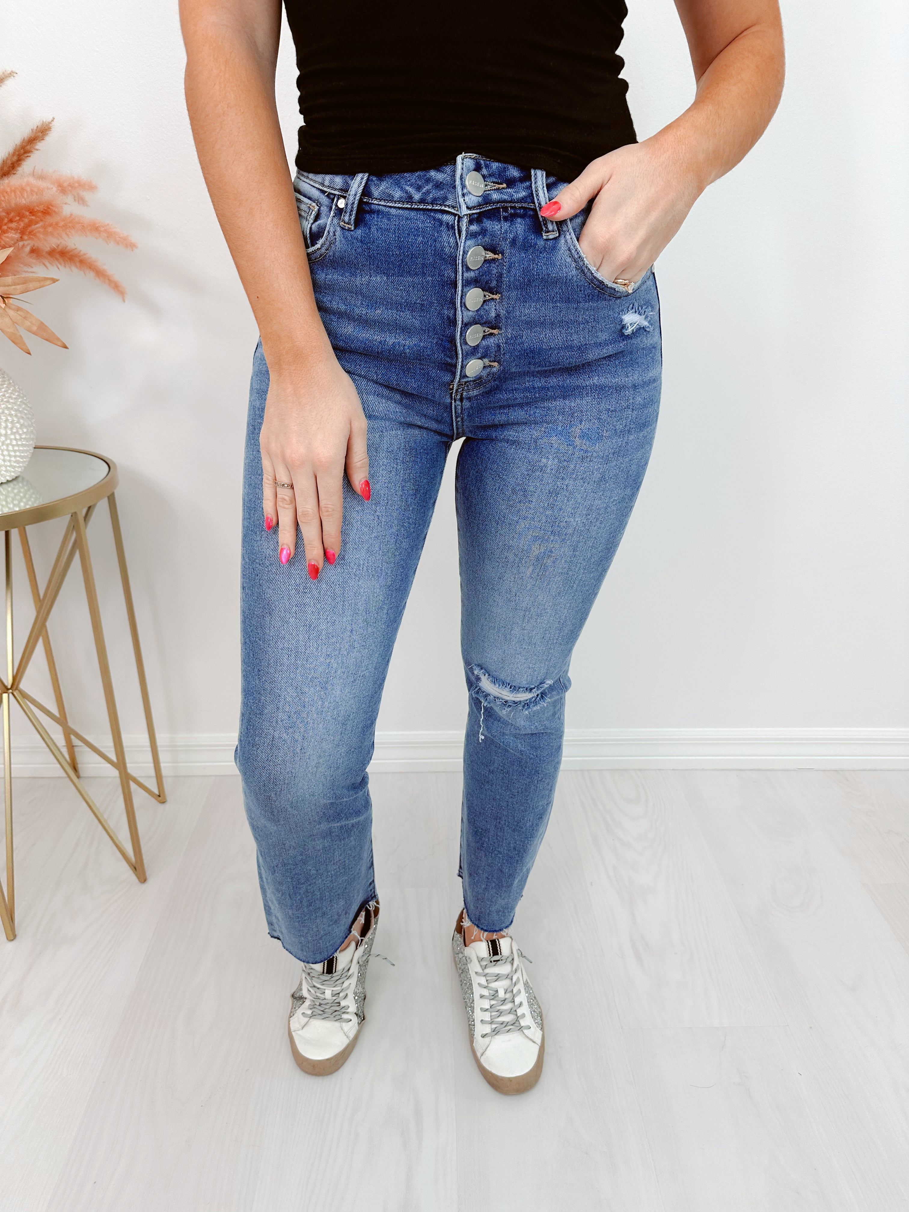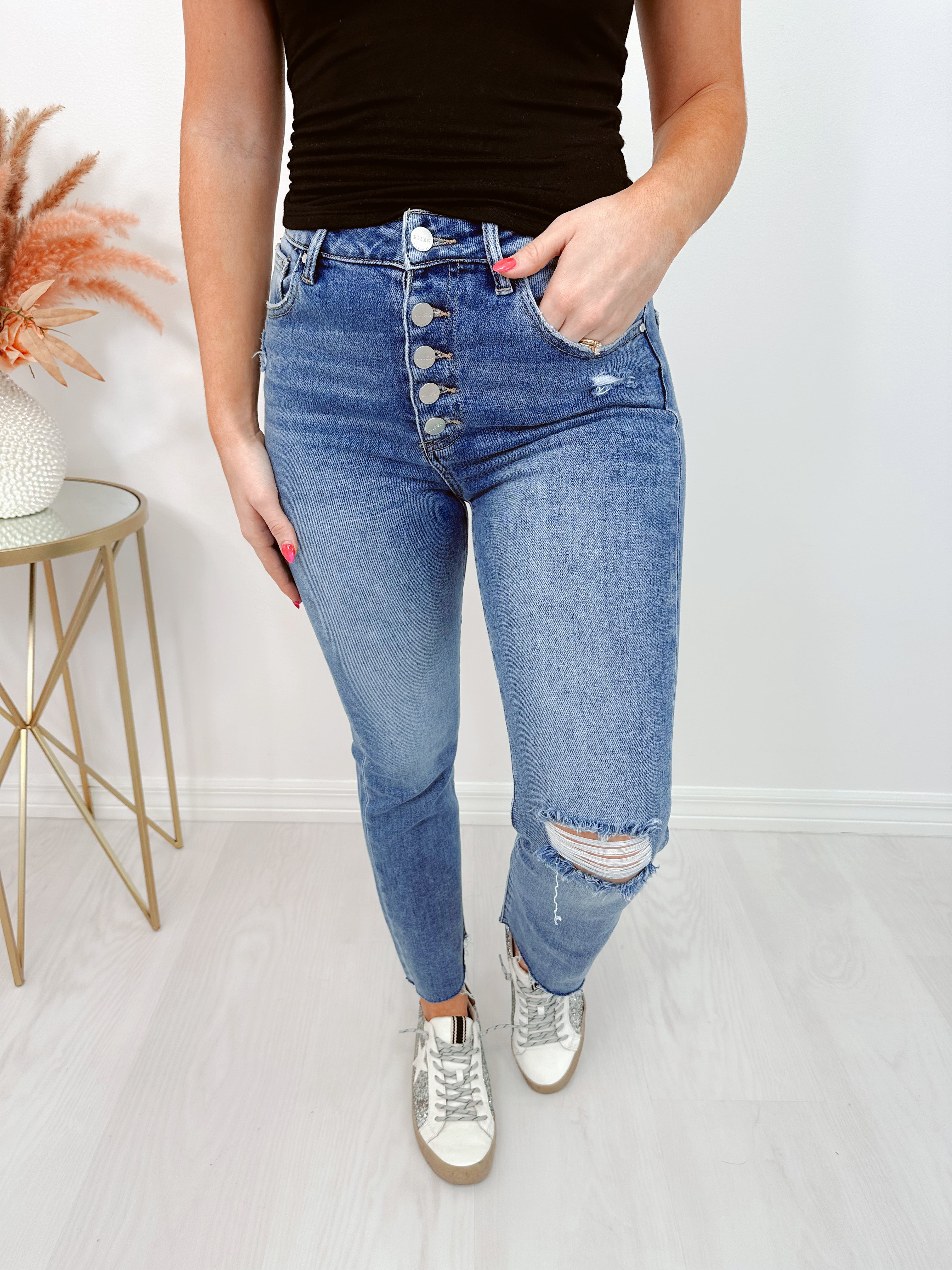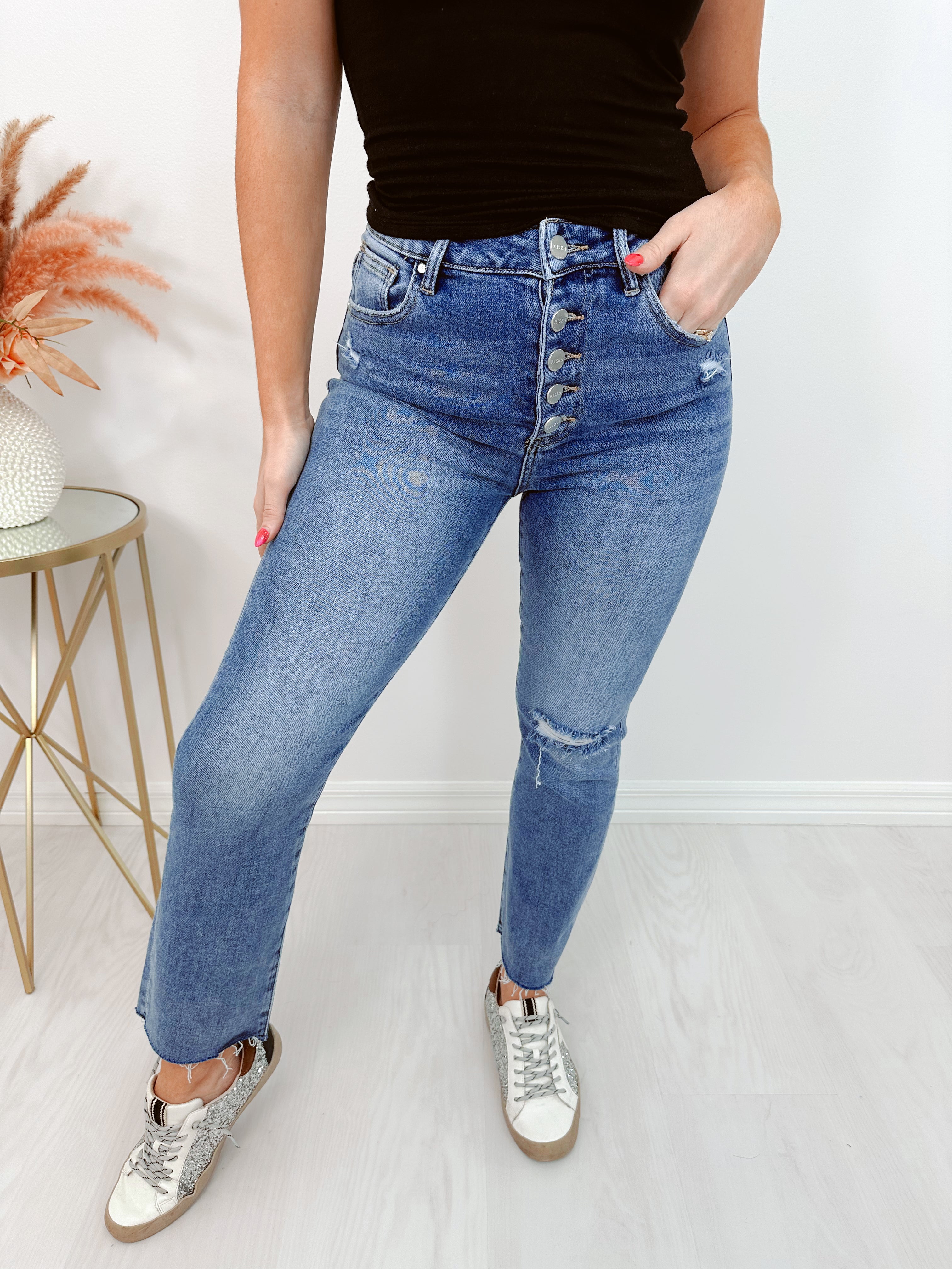 - Features include a medium wash tri-blend stretch denim fabric, a high waist, bootcut frayed cropped hem, a 5 button fly, a destroyed knee, and a classic 5 pocket design.