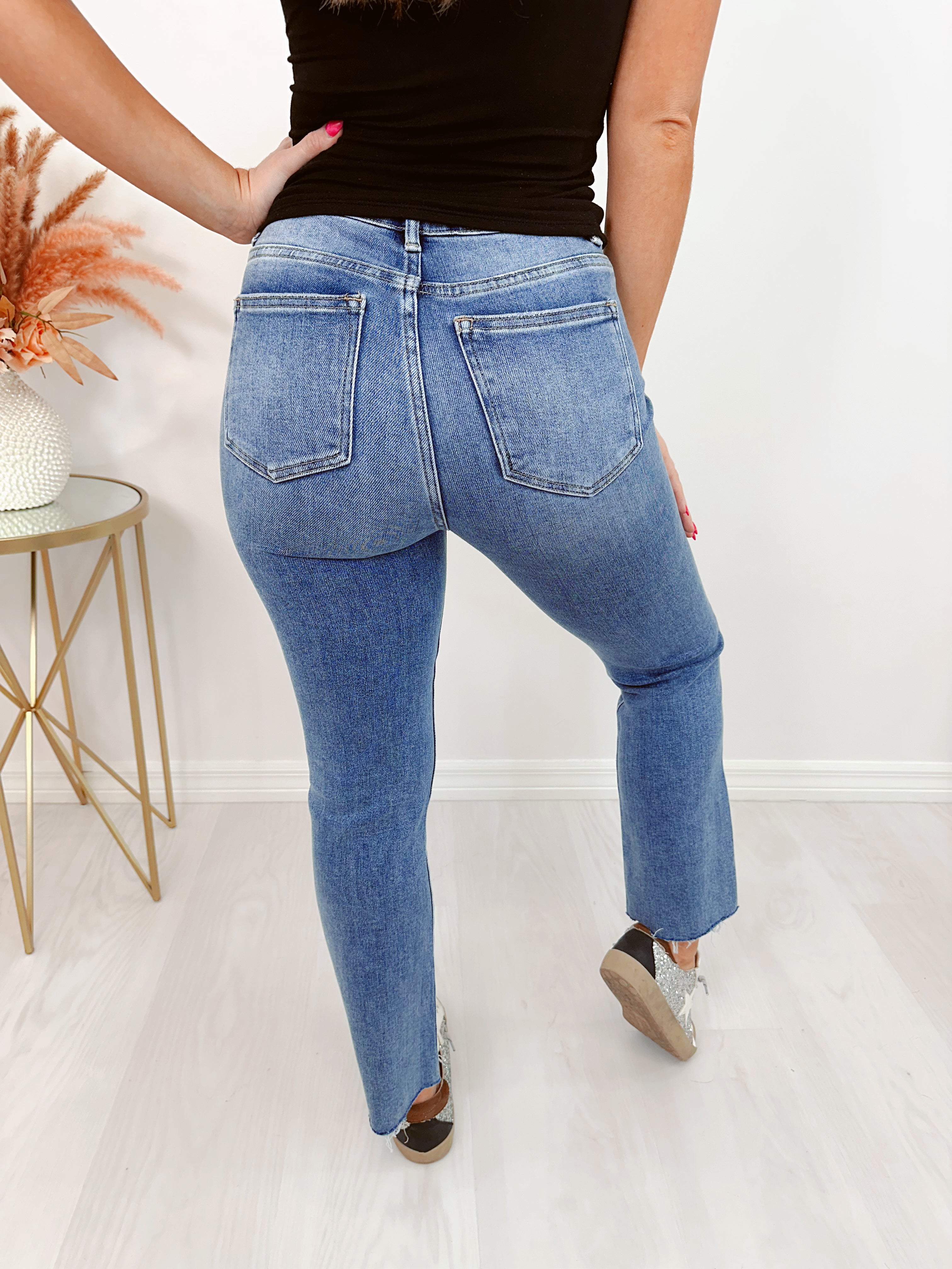 - Add a stylish and trendy piece to your wardrobe with our Destiny Distressed Crop Frayed Hem Jeans. These high rise crop bootcut jeans are perfect when paired with an oversized top and booties to create a trendy OOTD.