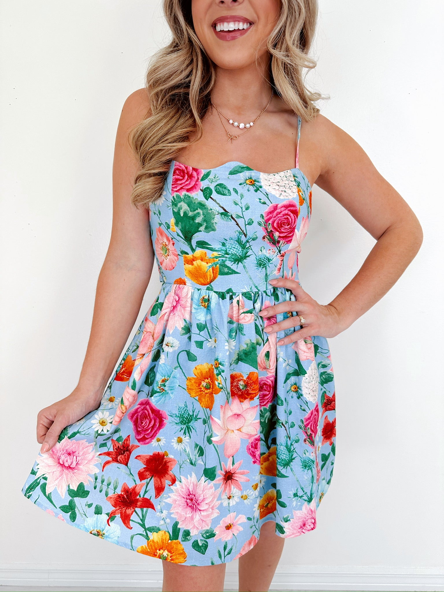 - This dress features a bright floral print fabric, a scalloped square neck, an open back with elastic waist and self-tie bow, an A-line skirt with pleated waist, and is fully lined.