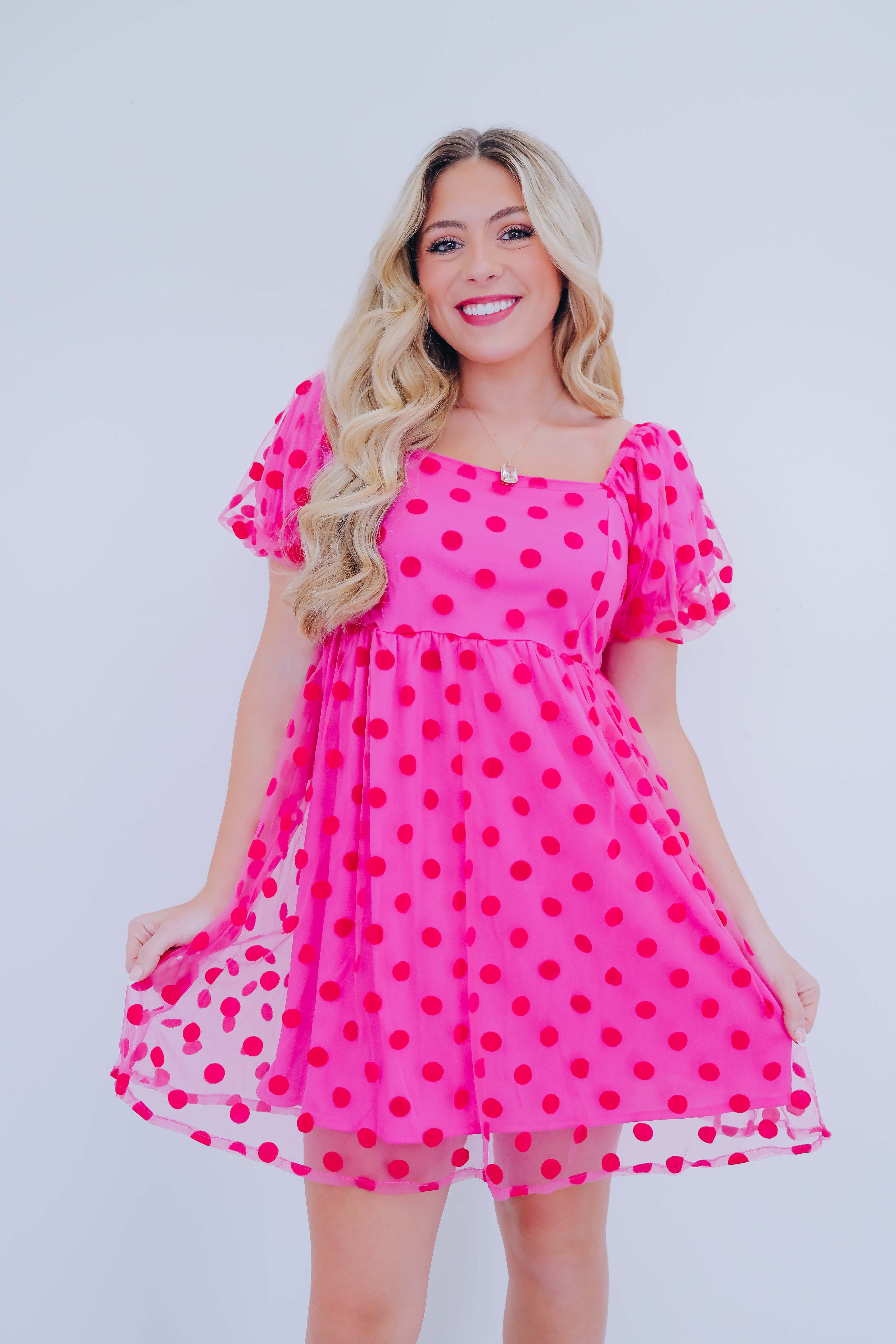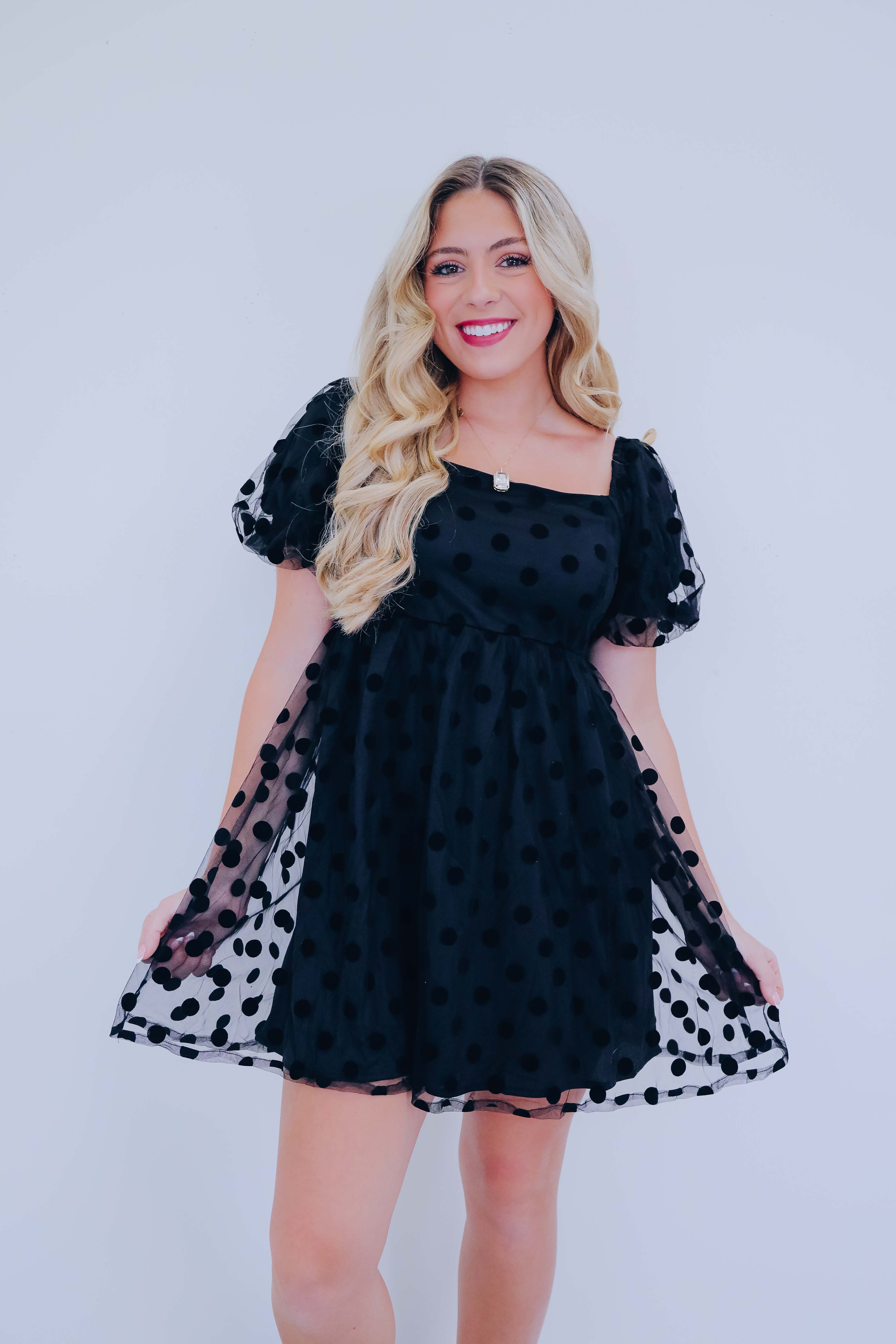 - This cutie is an add to cart must have. The trendy mesh dotted fabric adds a touch of femininity and a playful silhouette. Pair with kitten heels and add a chic clutch to complete your look.