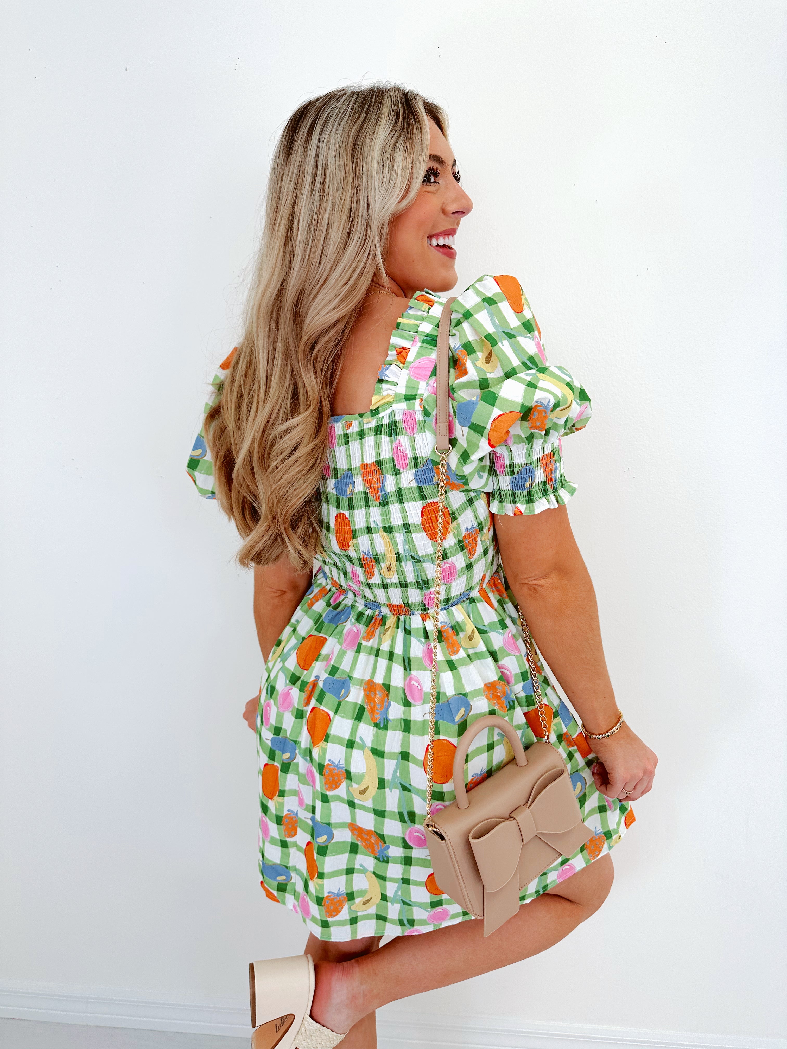- Features a hand drawn fruit design over a gingham plaid, this square neck mini dress has a smocked bodice, puff sleeves, an A-line hem and side slit pockets.