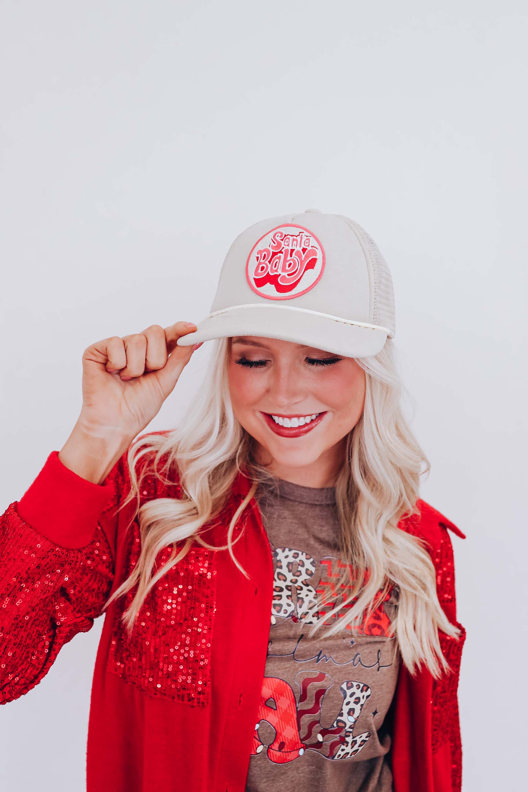 - Our Santa Baby Patch Trucker Hat is a great errand day accessory. Style with a graphic tee for a day of shopping with your besties.