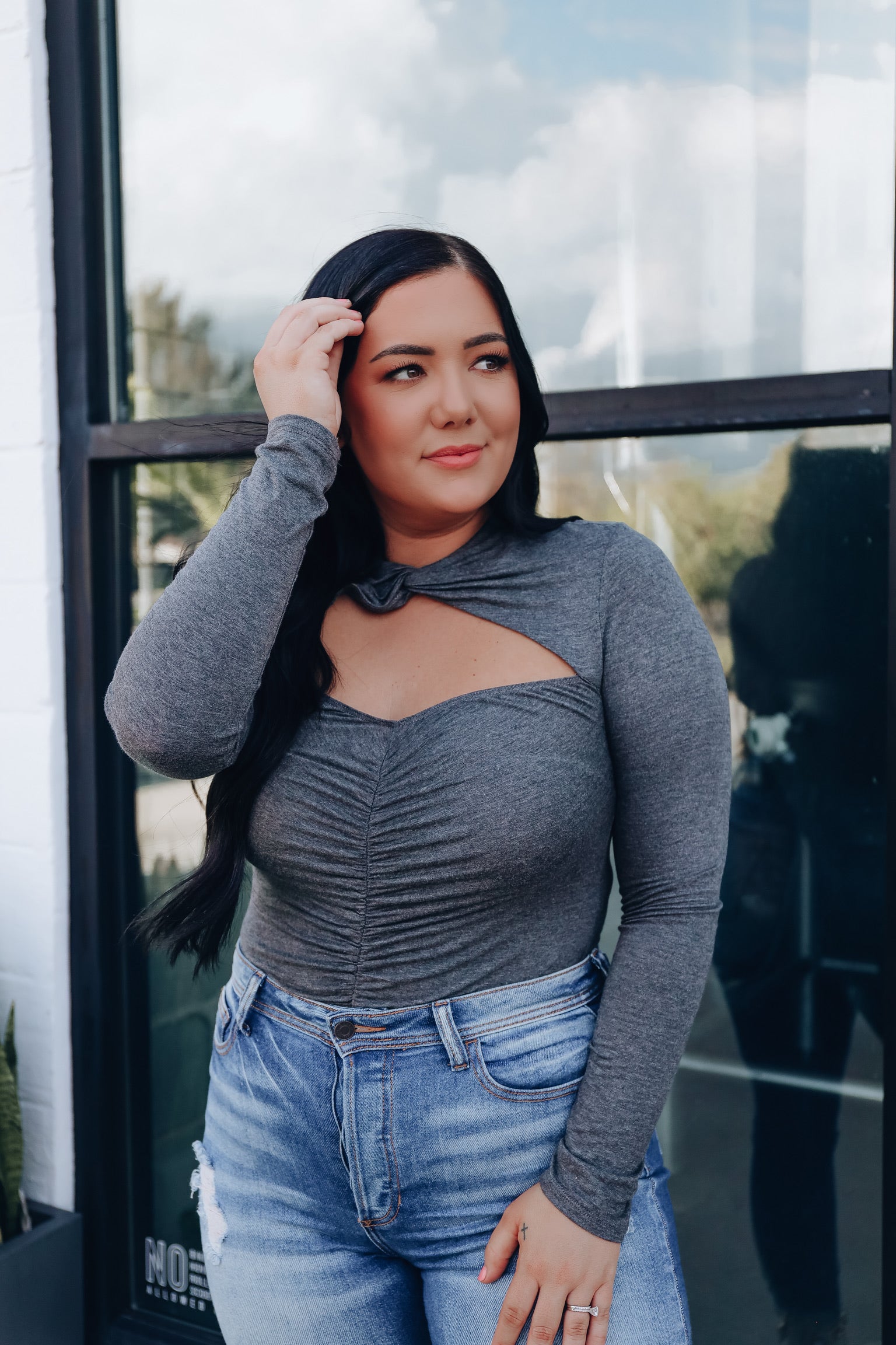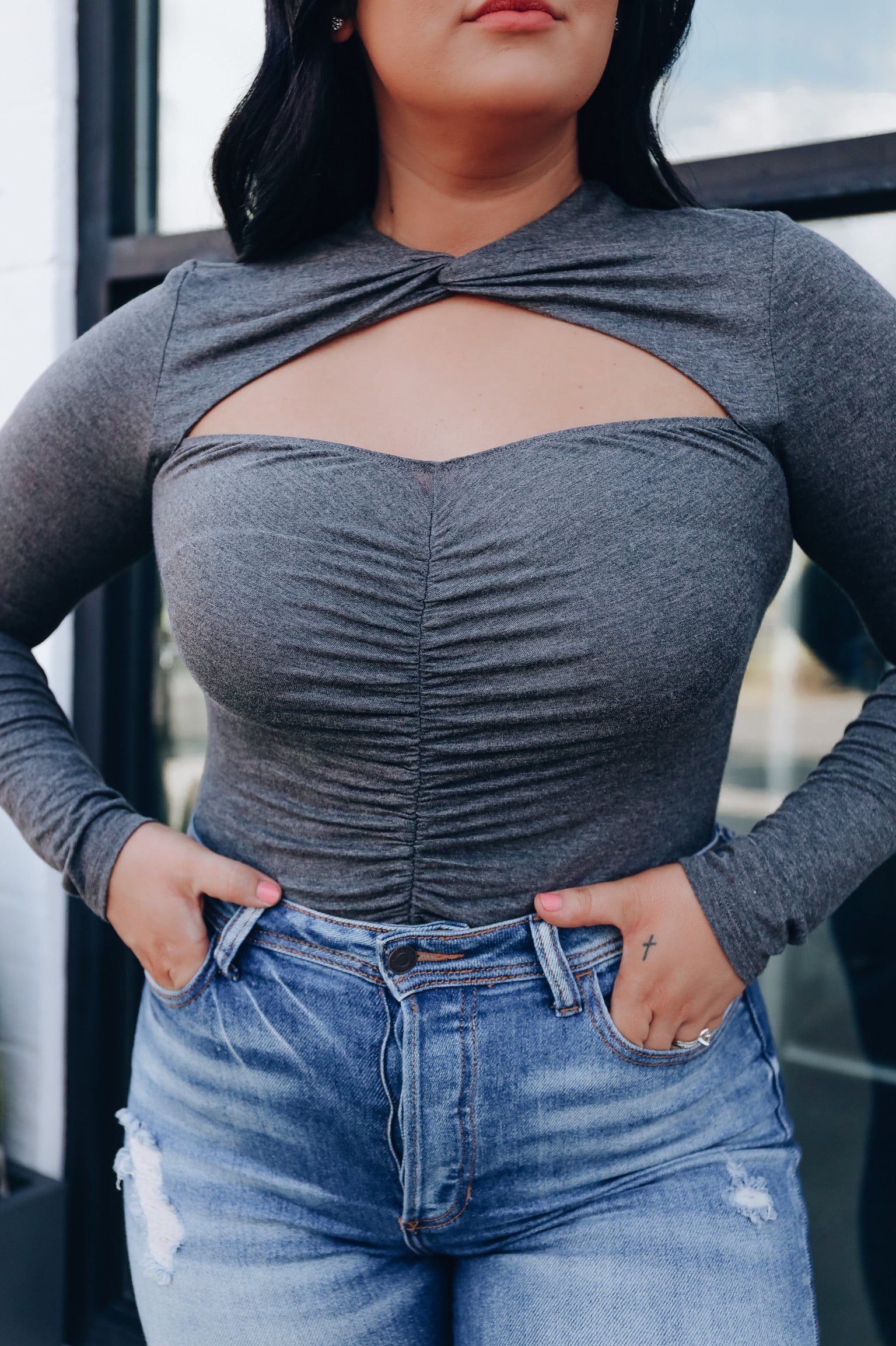 • Features a soft stretchy fabric, with a peekaboo bodice and twisted detail round neck, center ruching on the front for a flattering fit, long sleeves, and a cheeky bottom with snap closure.