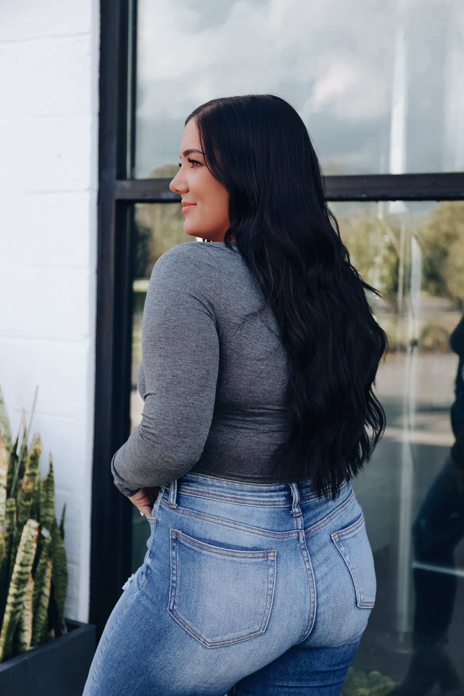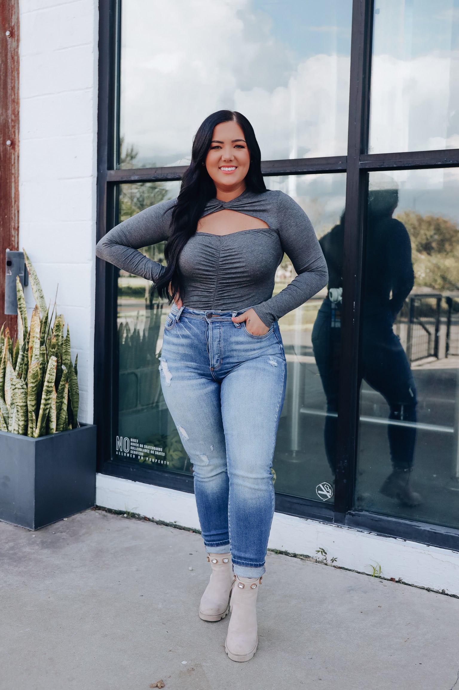 • How cute is our newest bodysuit with its feminine and flirty details? Style with a faux leather skirt and heels for a super confident and trendy style.