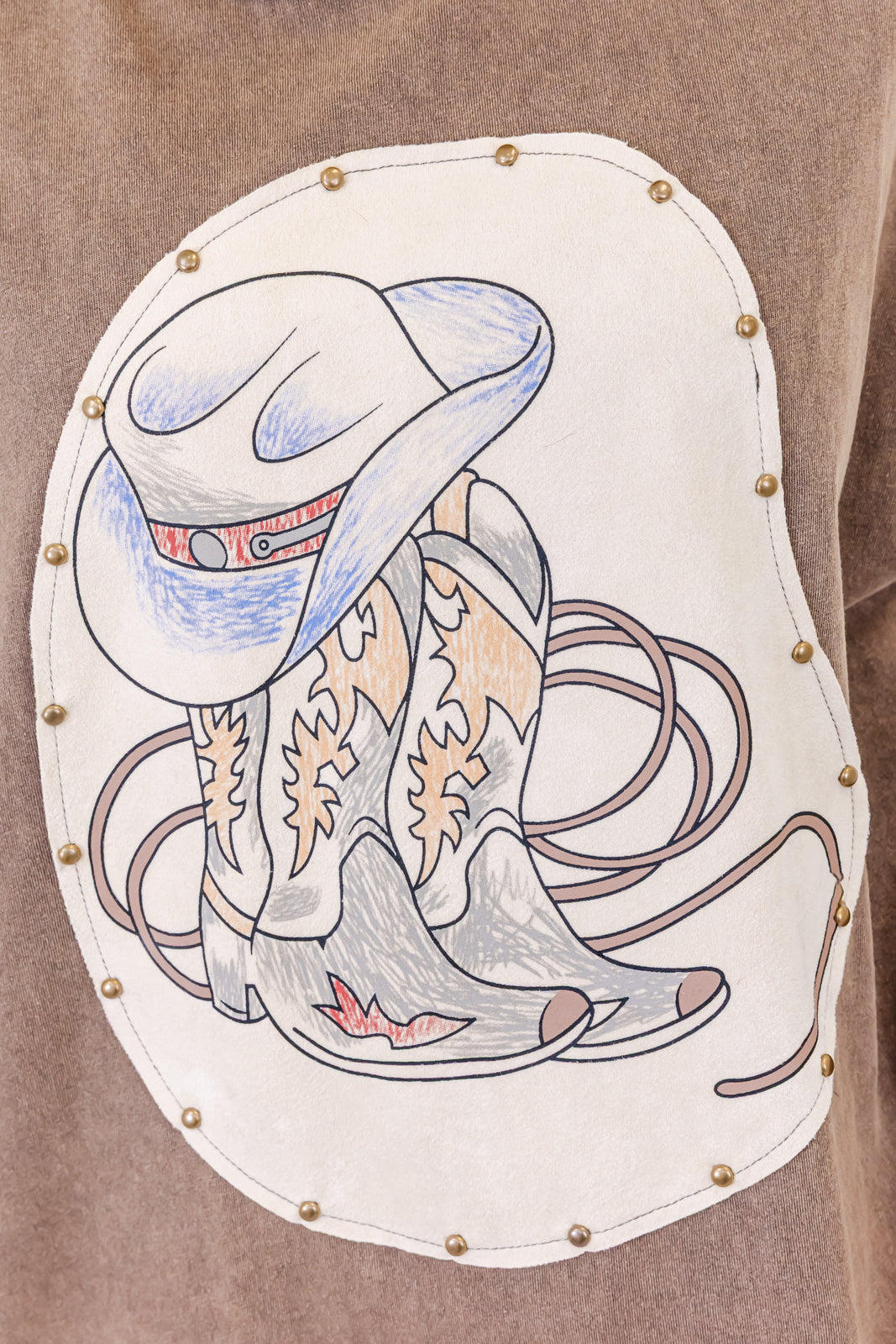- Features include a super soft mineral wash cotton fabric with a round neck, short drop shoulder sleeves, a hi-lo rounded back hem with an outseam center detail, and a unique faux suede western patch graphic secured with studs and featuring a crayon colored western hat, boots, and rope.