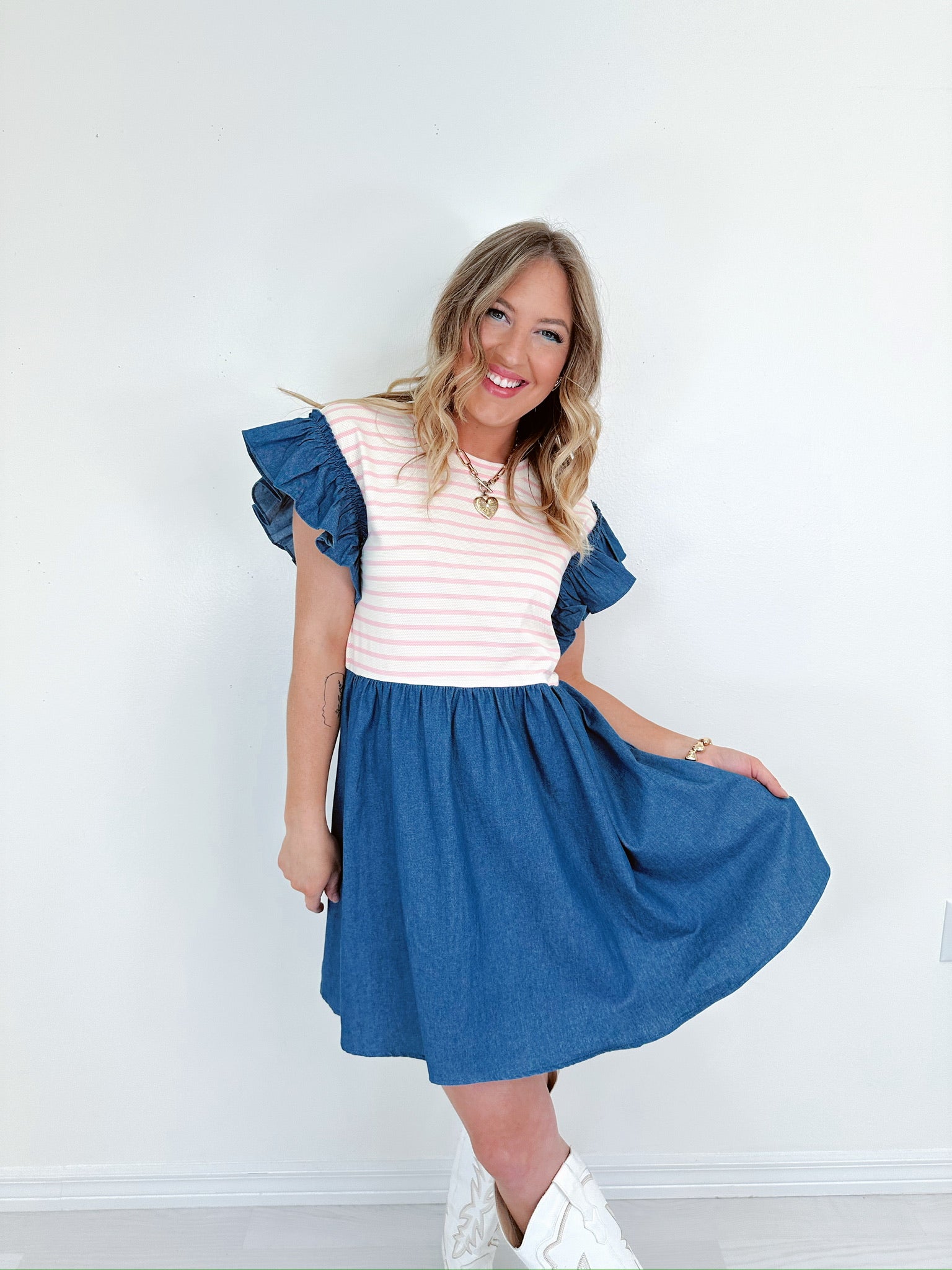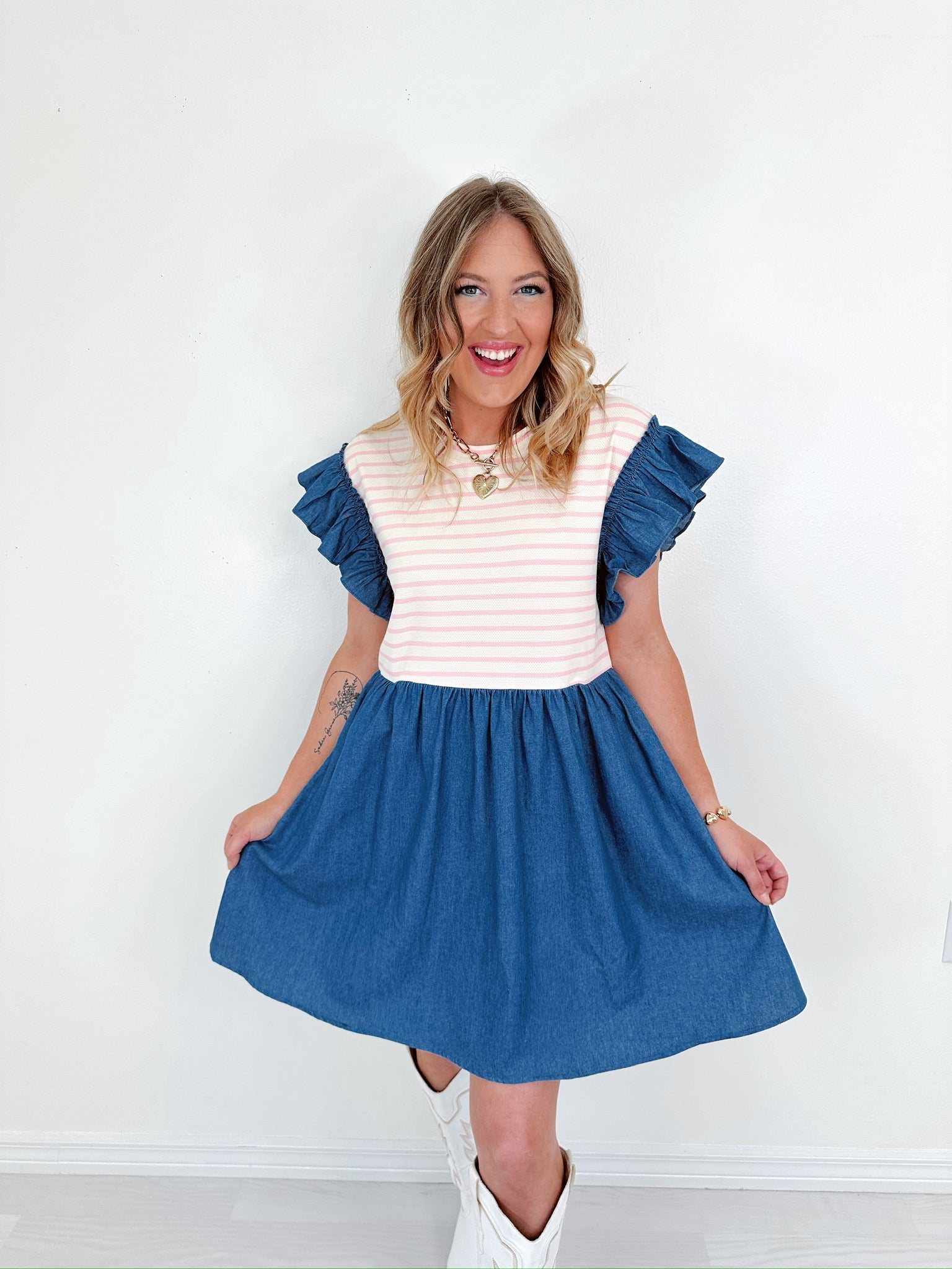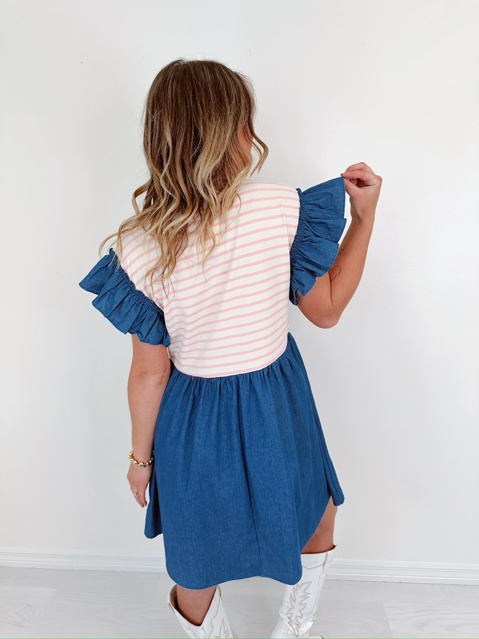 - Features a mix fabric design consisting of a striped bodice and denim skirt, a round neck, a frilly ruffle cap sleeve, and a relaxed loose fit.