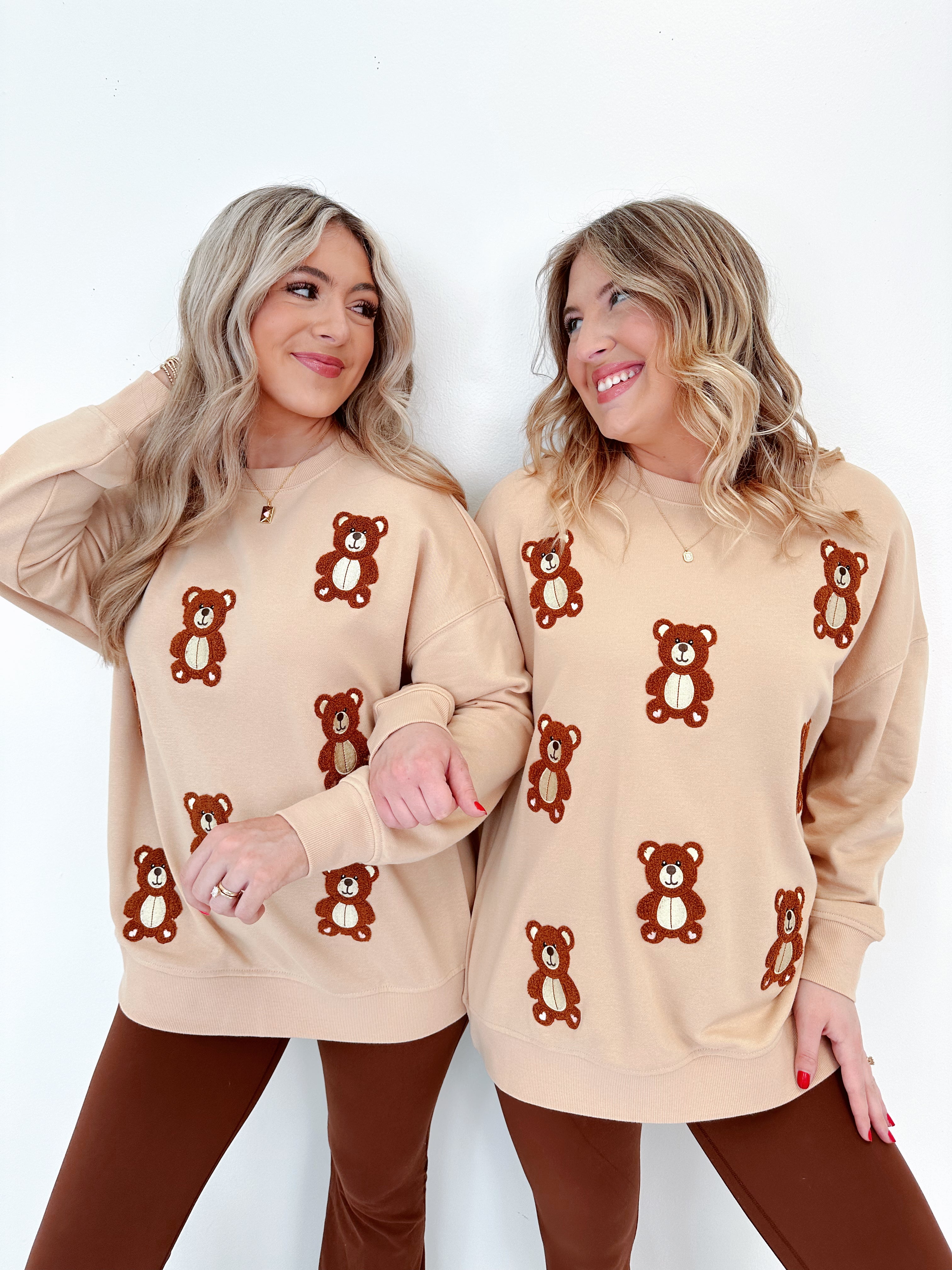 - Features a super soft fabric, a crew neck, full length drop shoulder sleeves with ribbed cuff, a straight him with ribbed band, and is completed with embroidered chenille bear patches with pink heart pads on the feet.