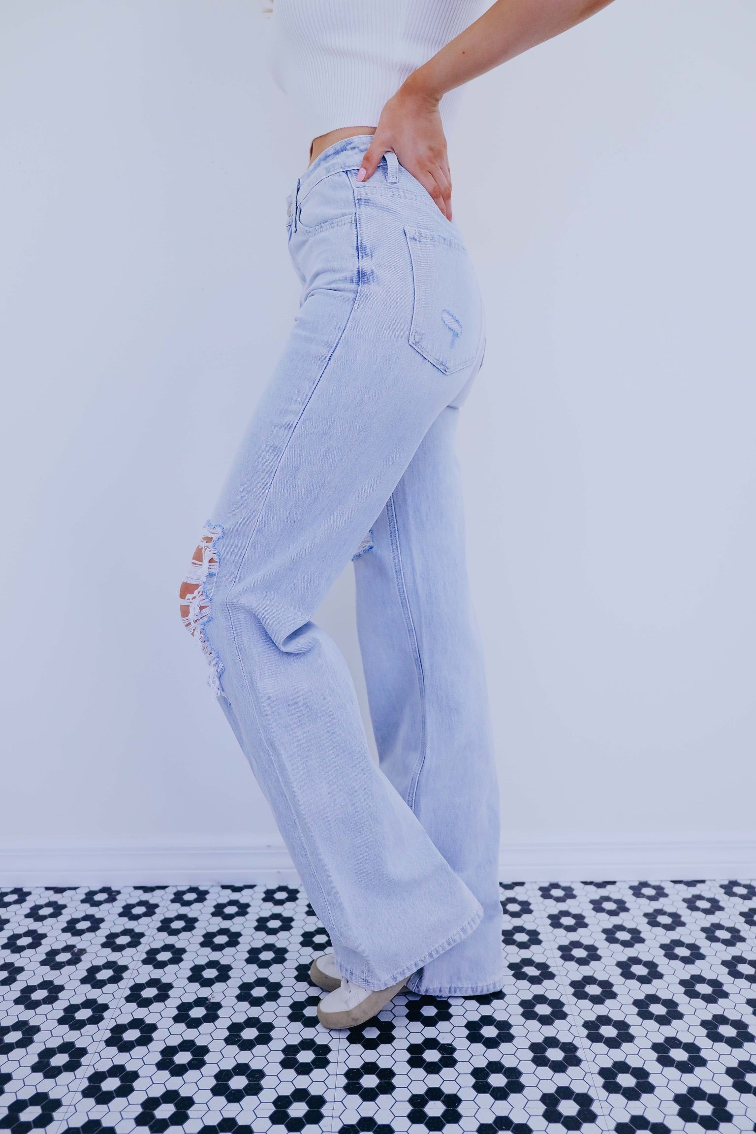 - Features include a light wash denim with destroyed knees, a super high waist, a button and zip closure, five pocket design, and a flare hem. These jeans have no stretch.