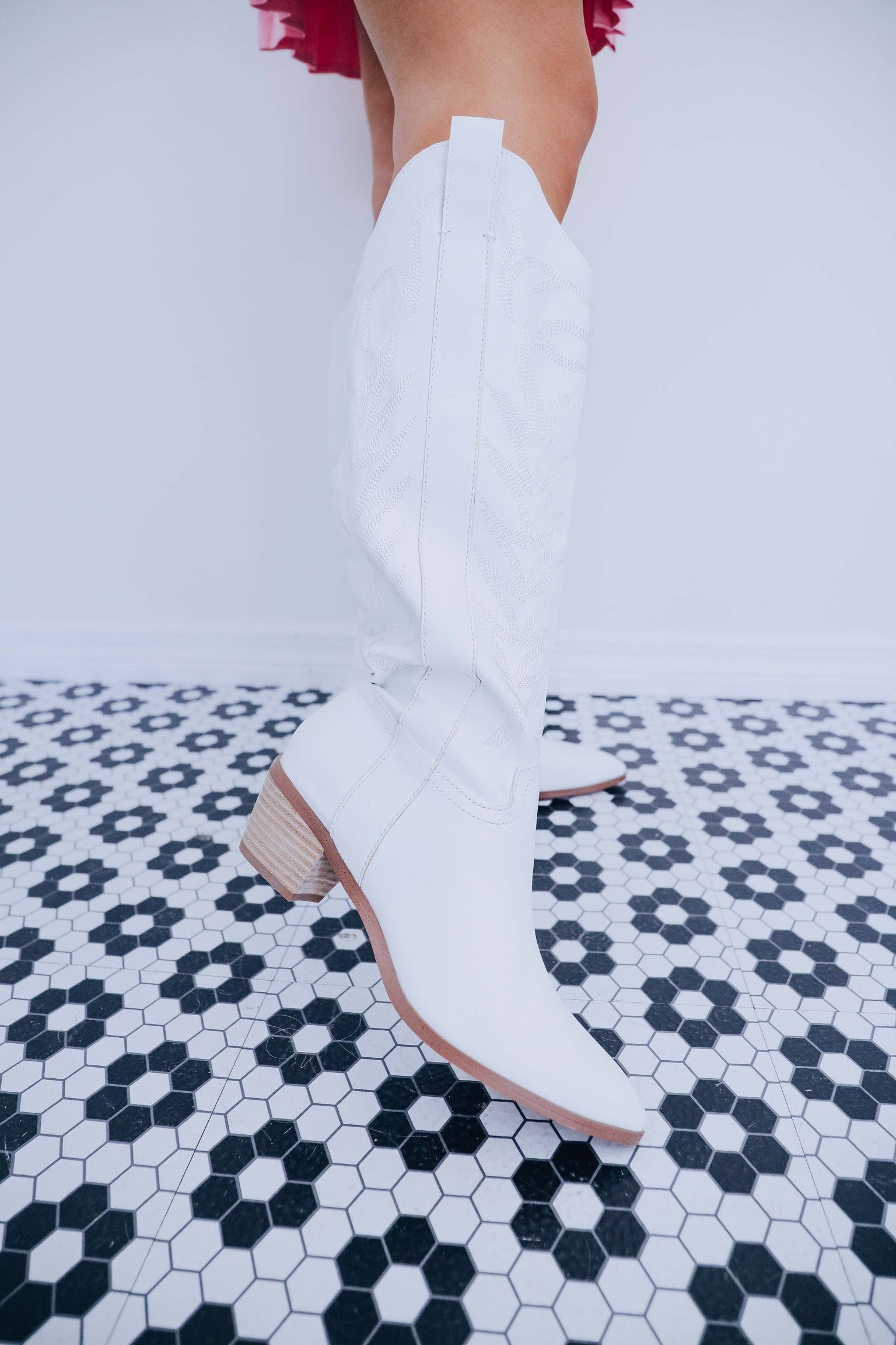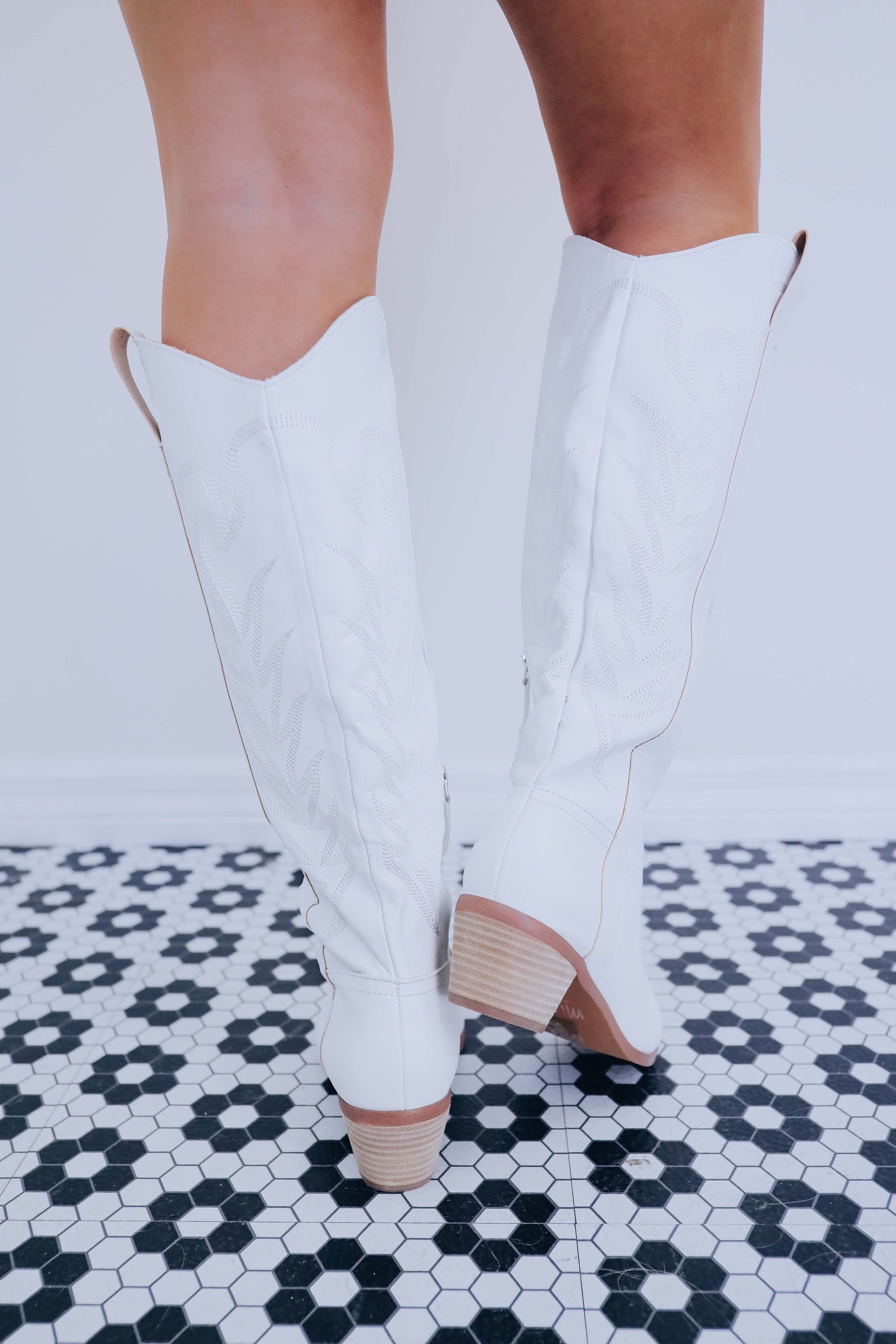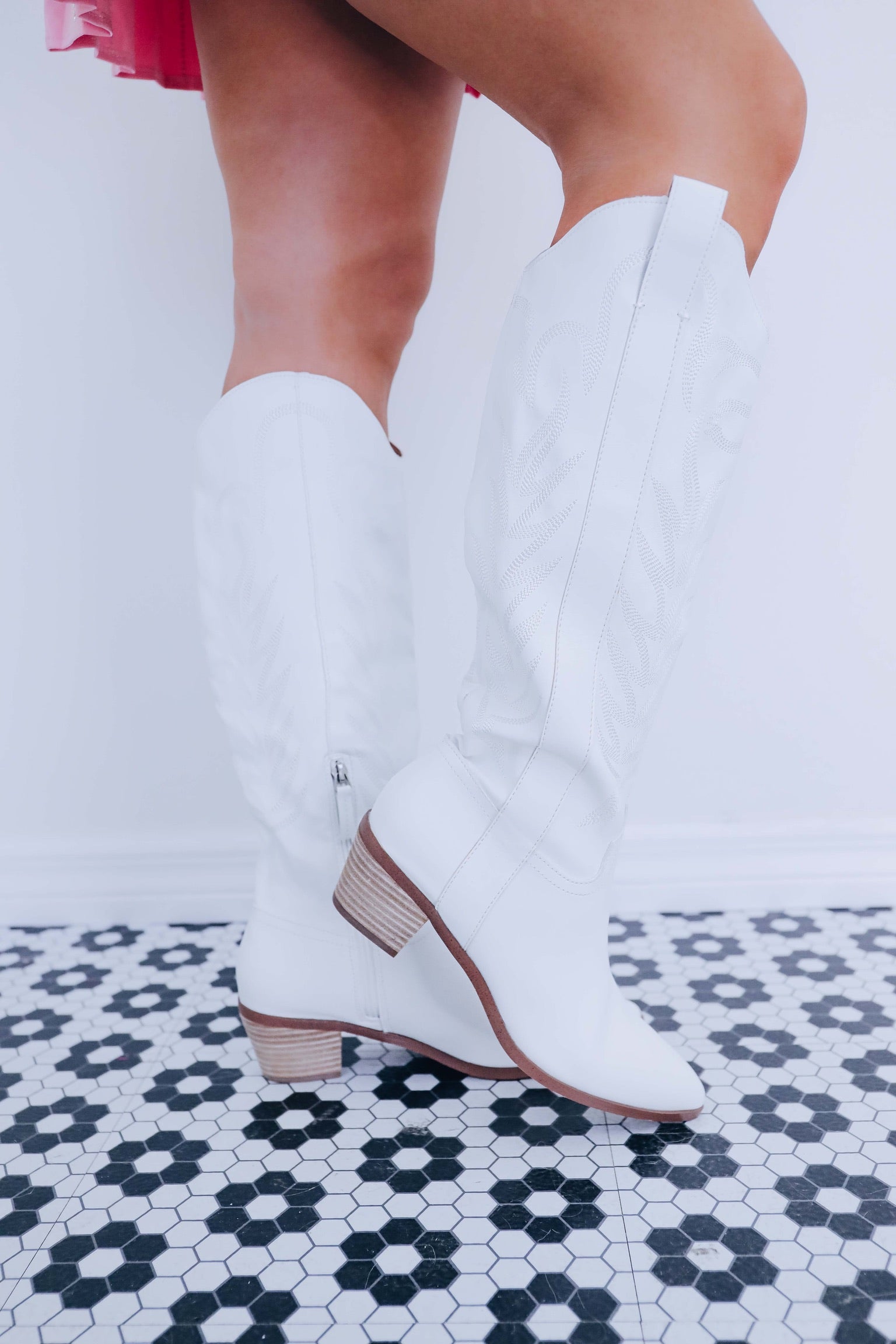 - Features a high quality vegan leather white boot, pointed toe, western inspired white embroidery, wide fit long shaft, low stacked block heel, and outside pull tab.
