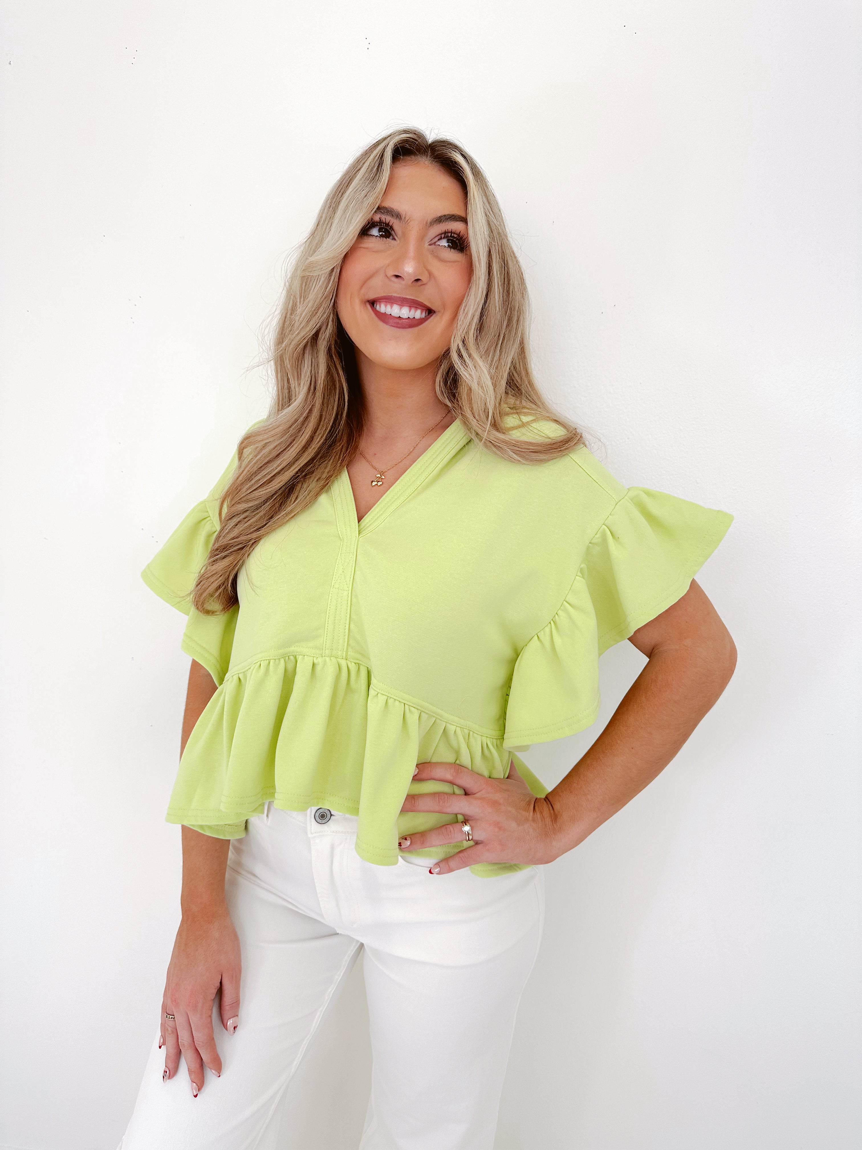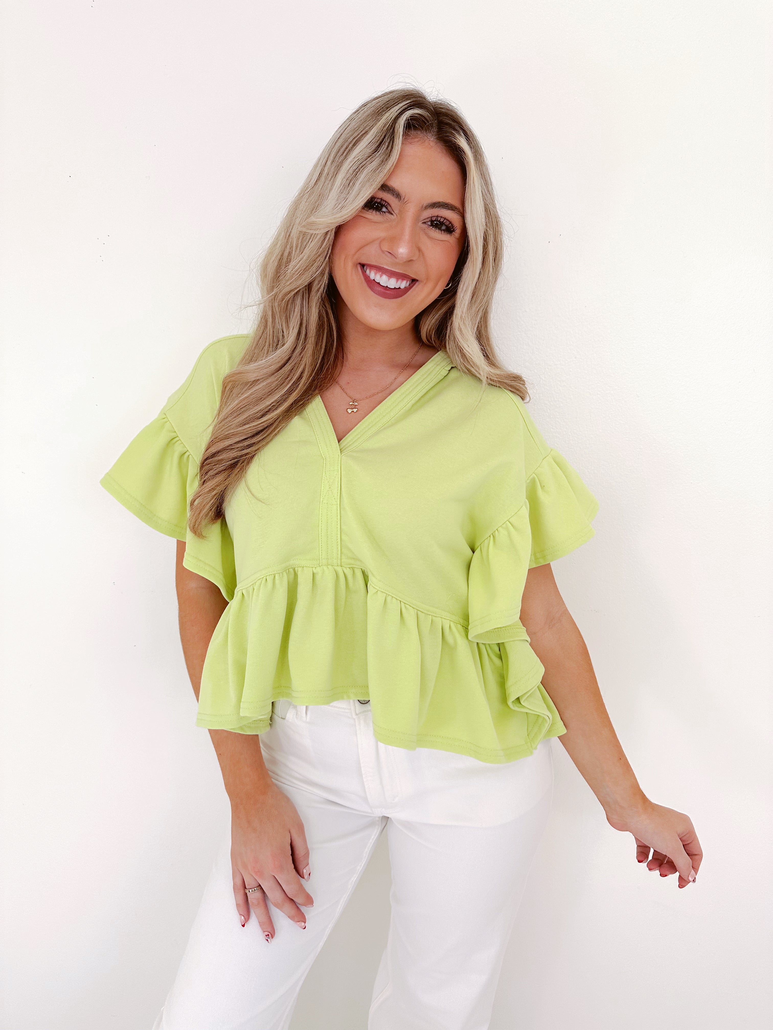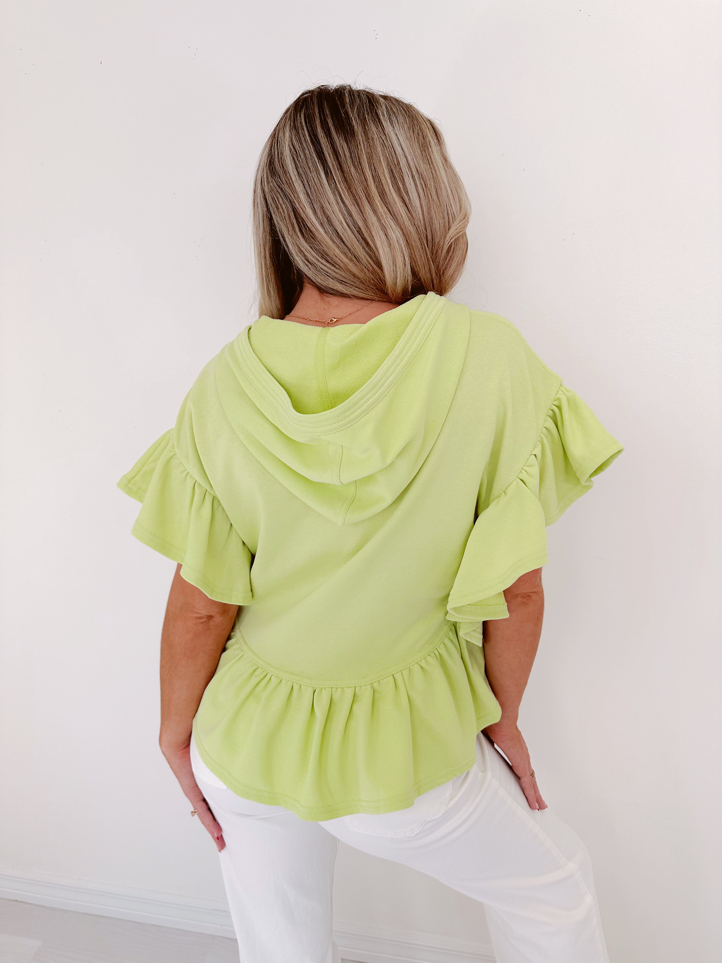Frilly Flutter Sleeve Cropped Hoodie - Pale Lime Green
