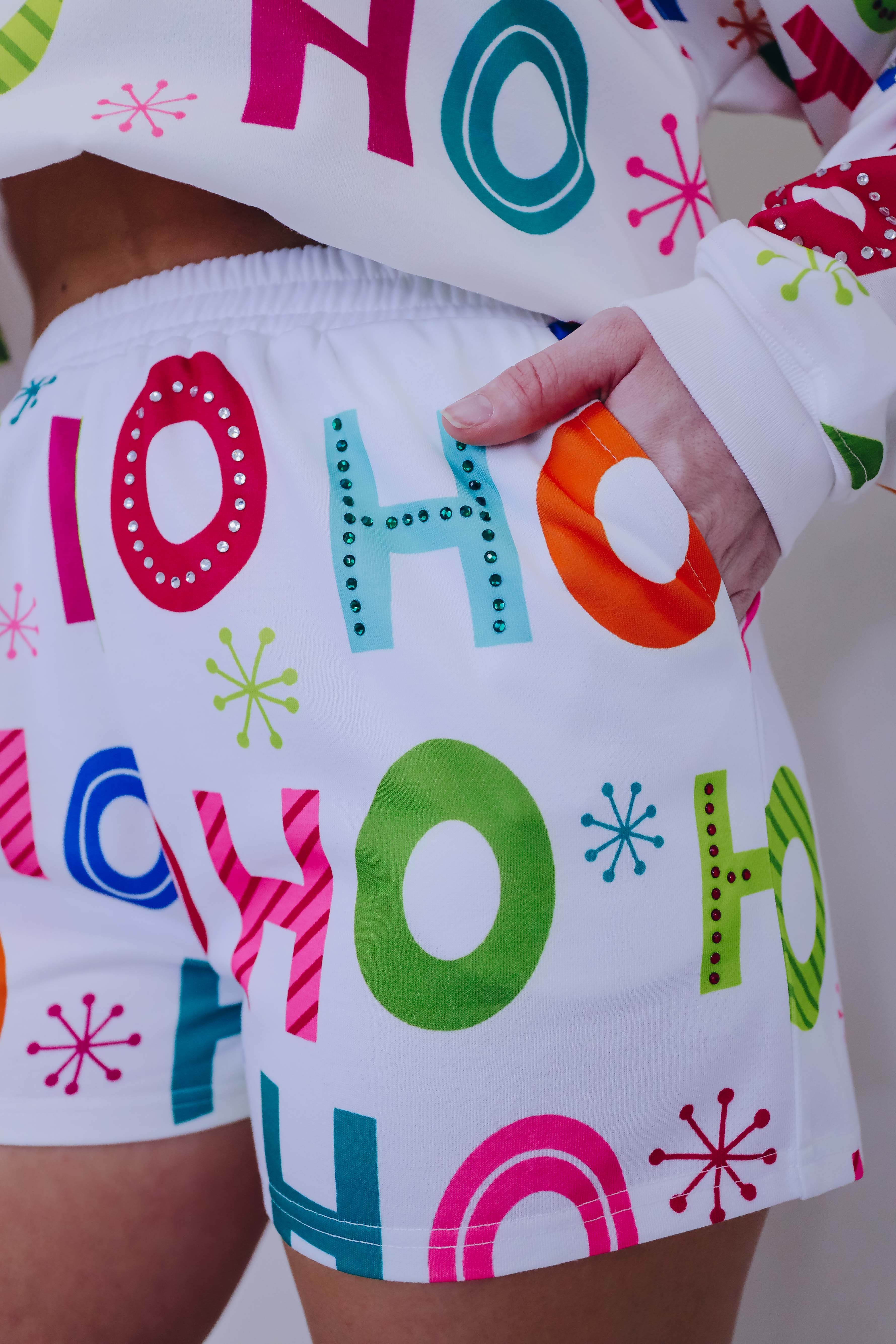Features a super soft fabric with a high waist, and is completed with multi-color HO HO HO and snowflake graphics embellished with rhinestones.