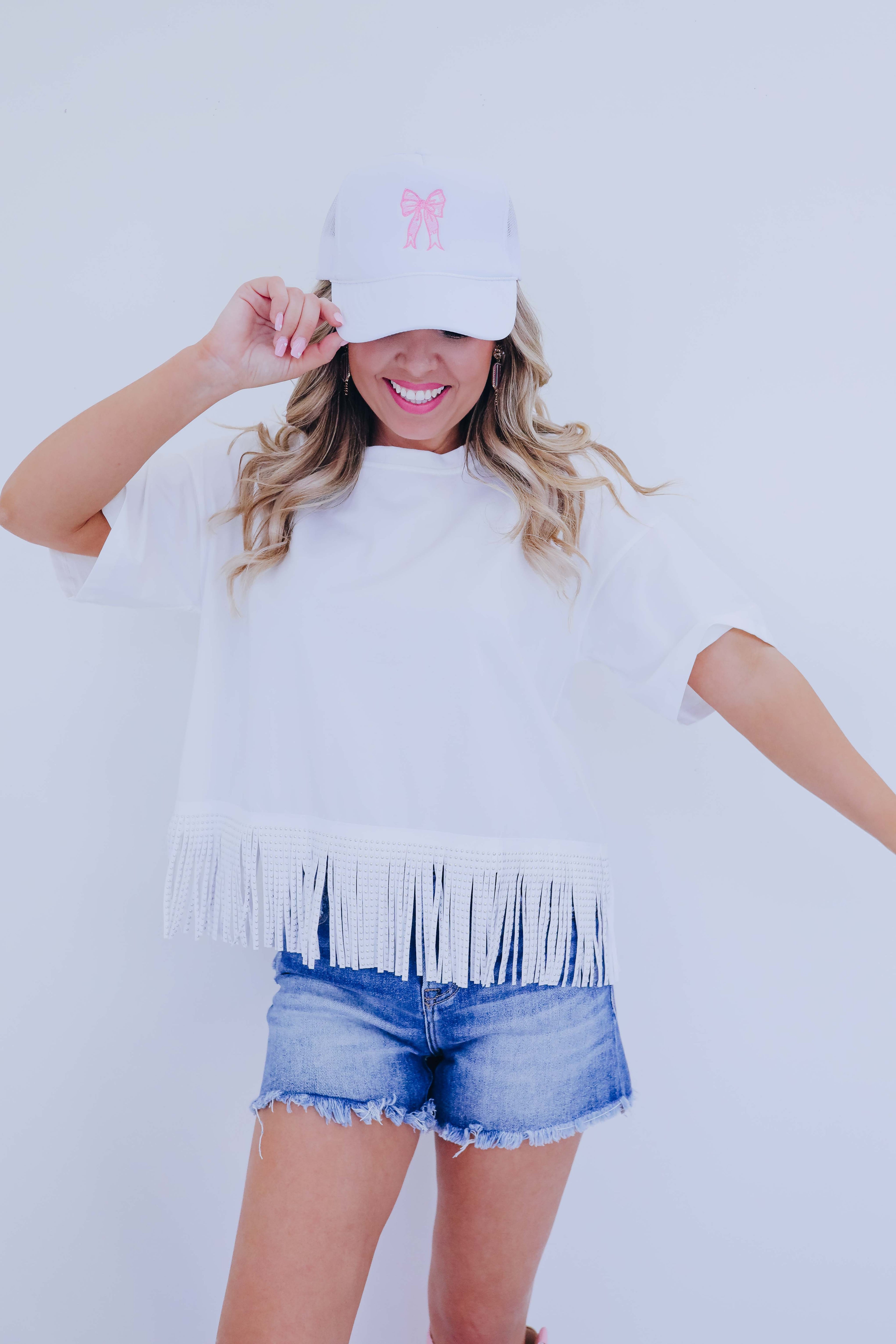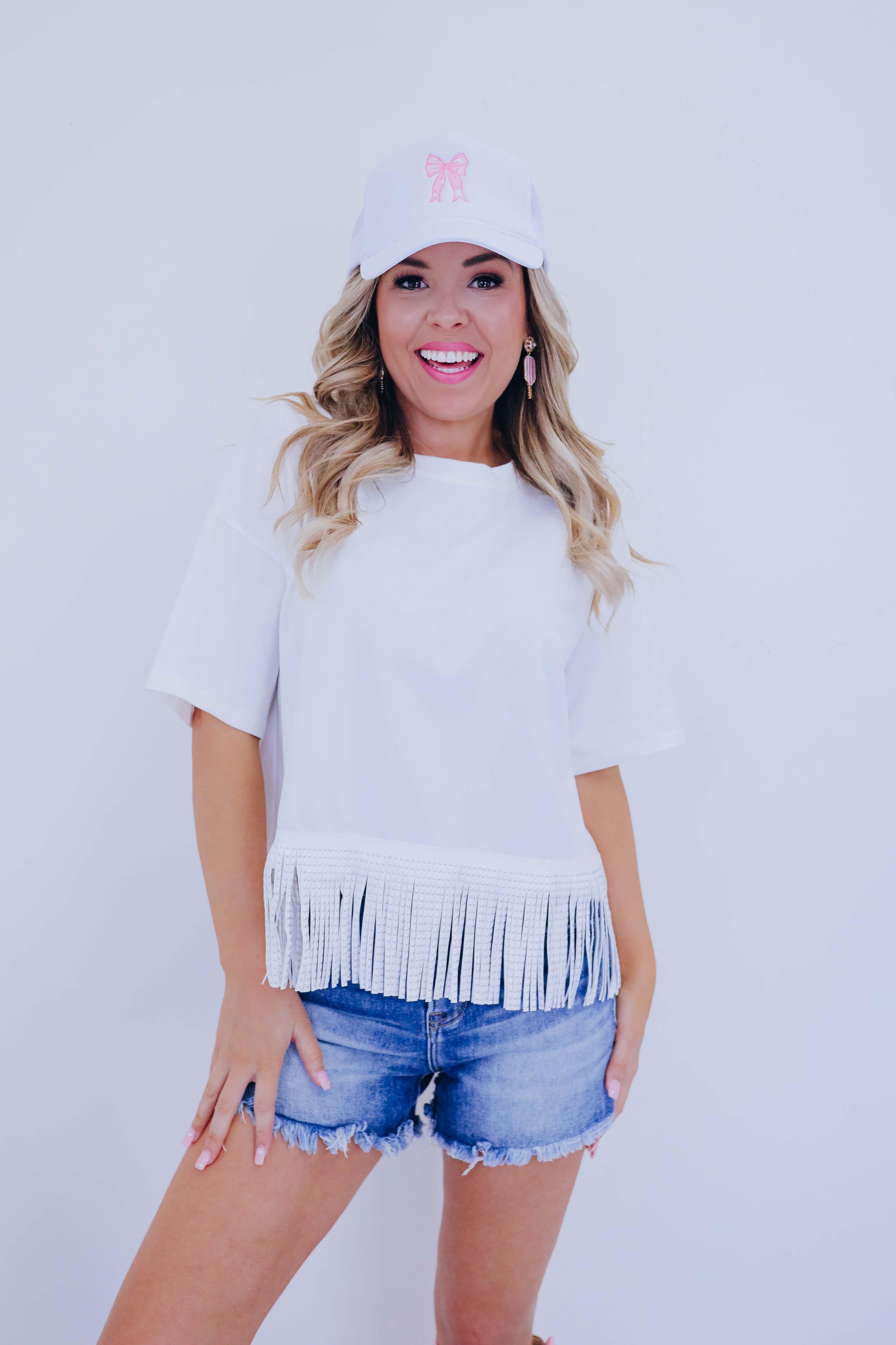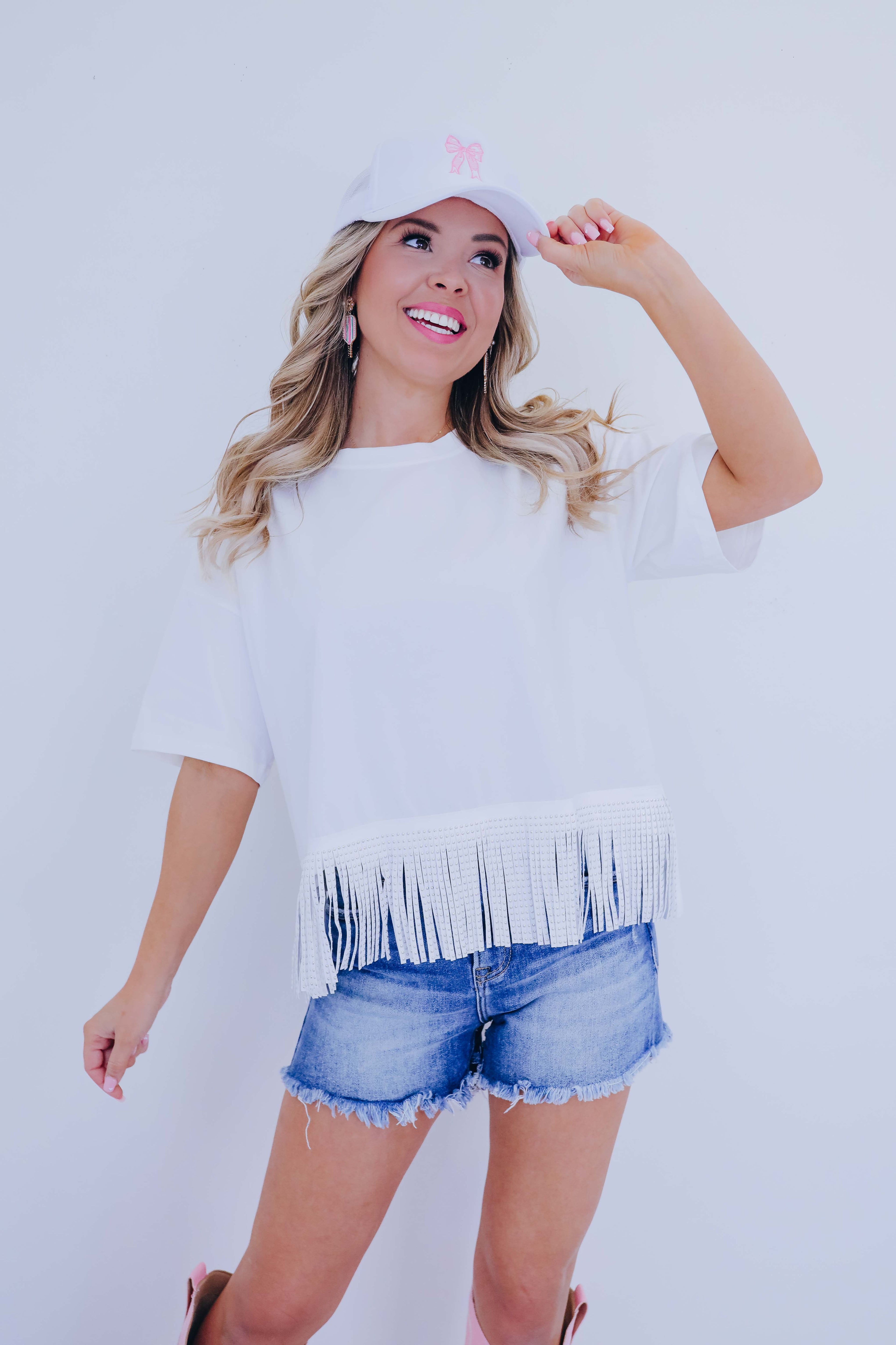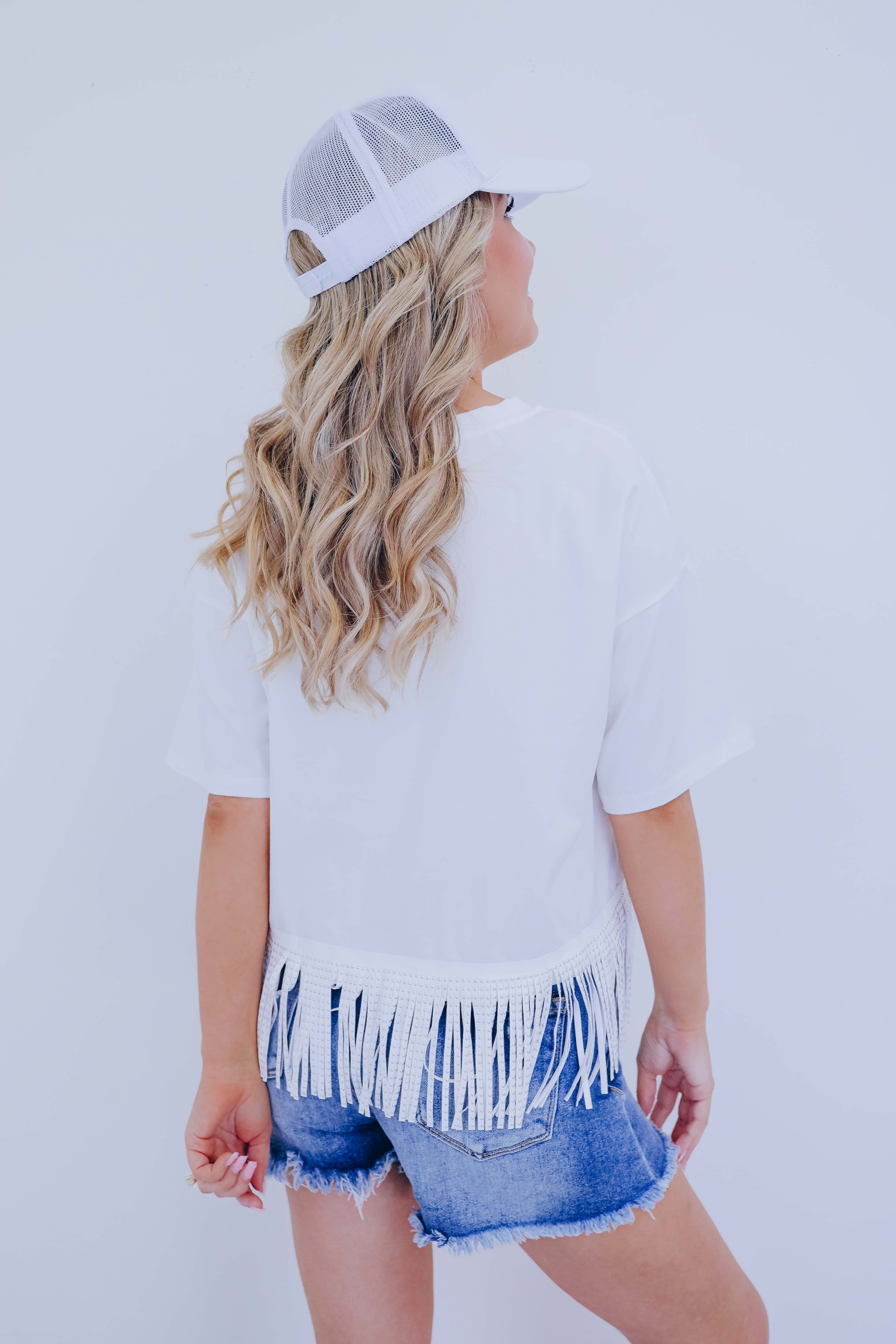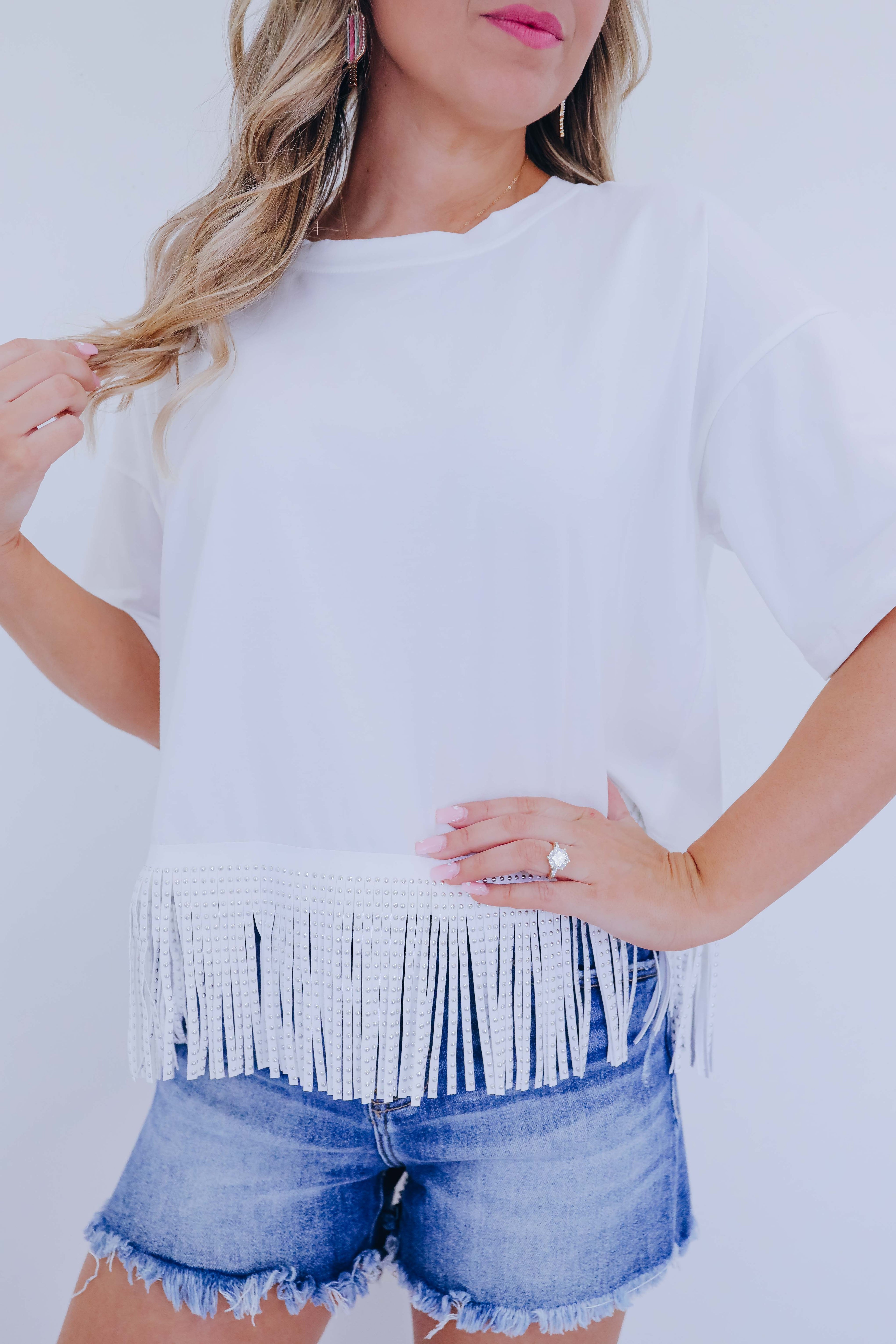 - Features a soft solid white fabric, crew neck, short sleeves, and a studded fringe cropped hem.