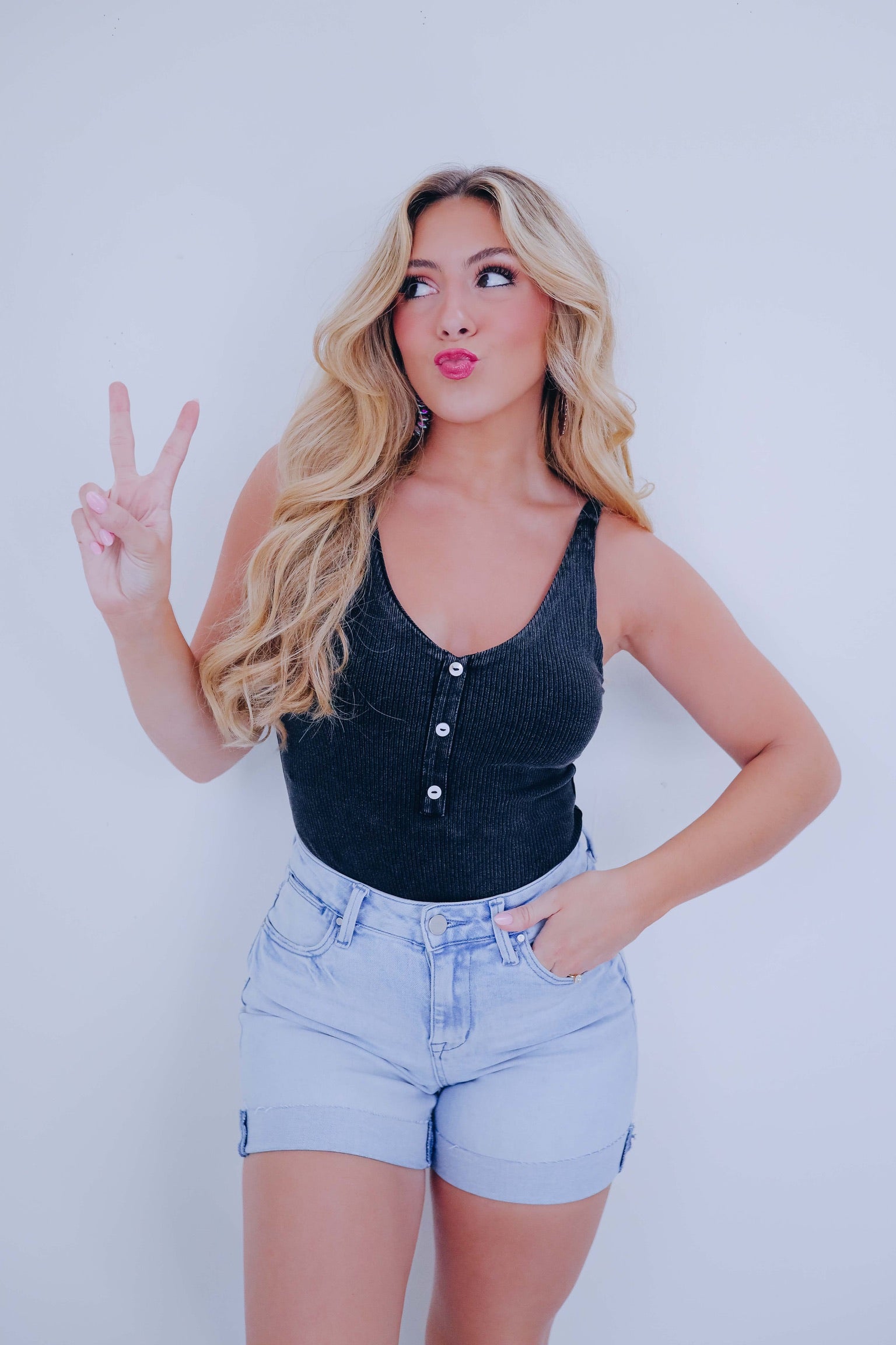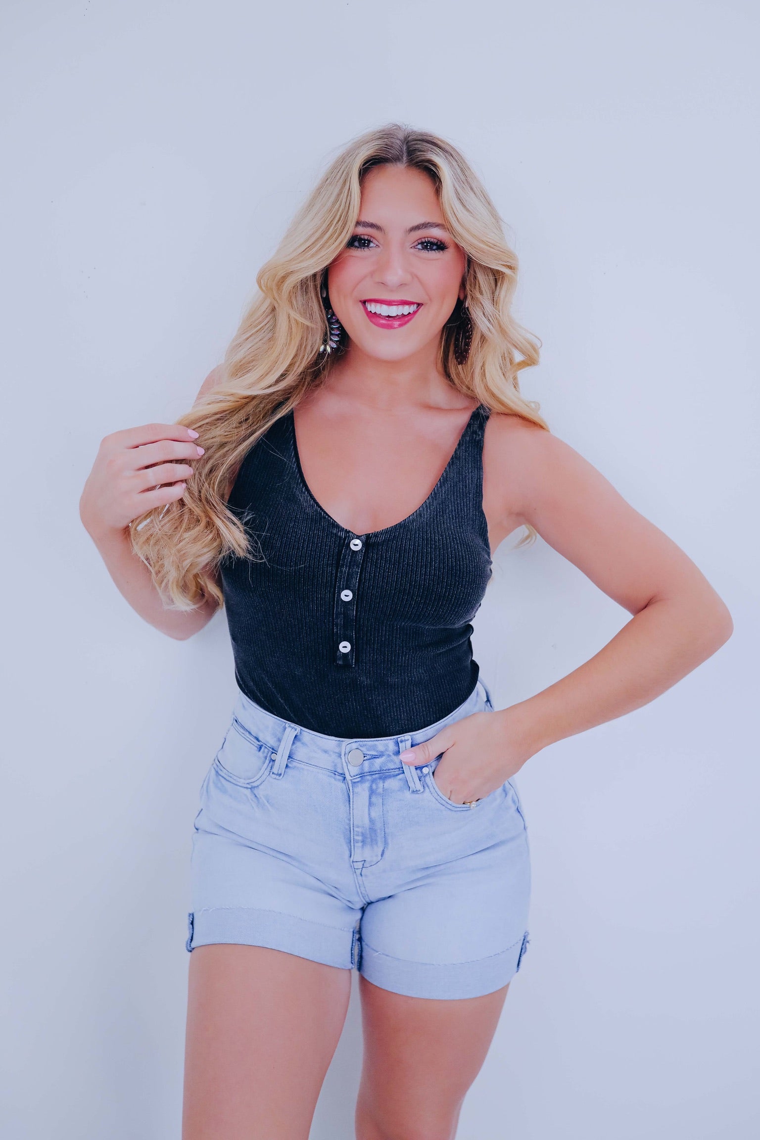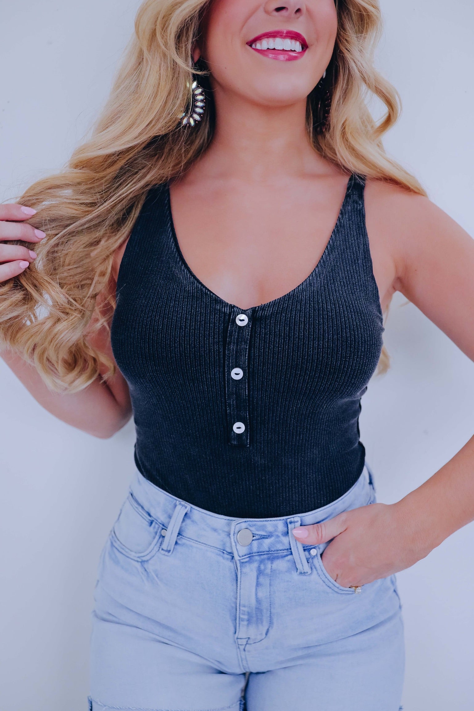 • Prioritize comfort with our trendy must have Henley Cross Back Strap Bodysuit! From errand day to date night this versatile piece pairs perfectly with a variety of bottoms to create a super cute fit.