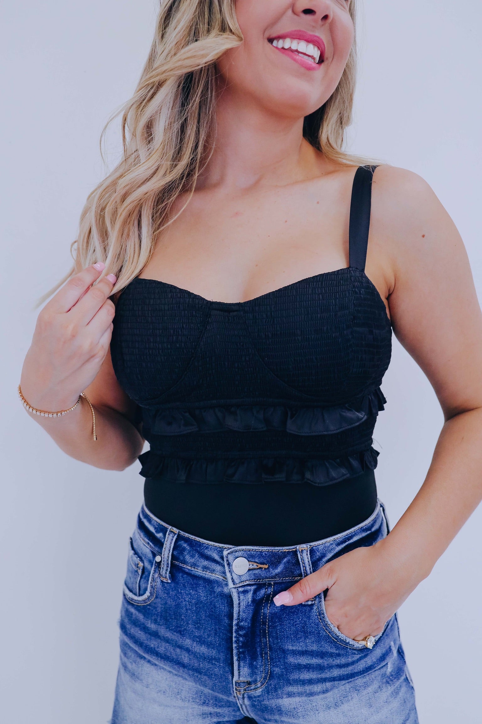 Sana Smocked Ruffle Trim Bodysuit - Black