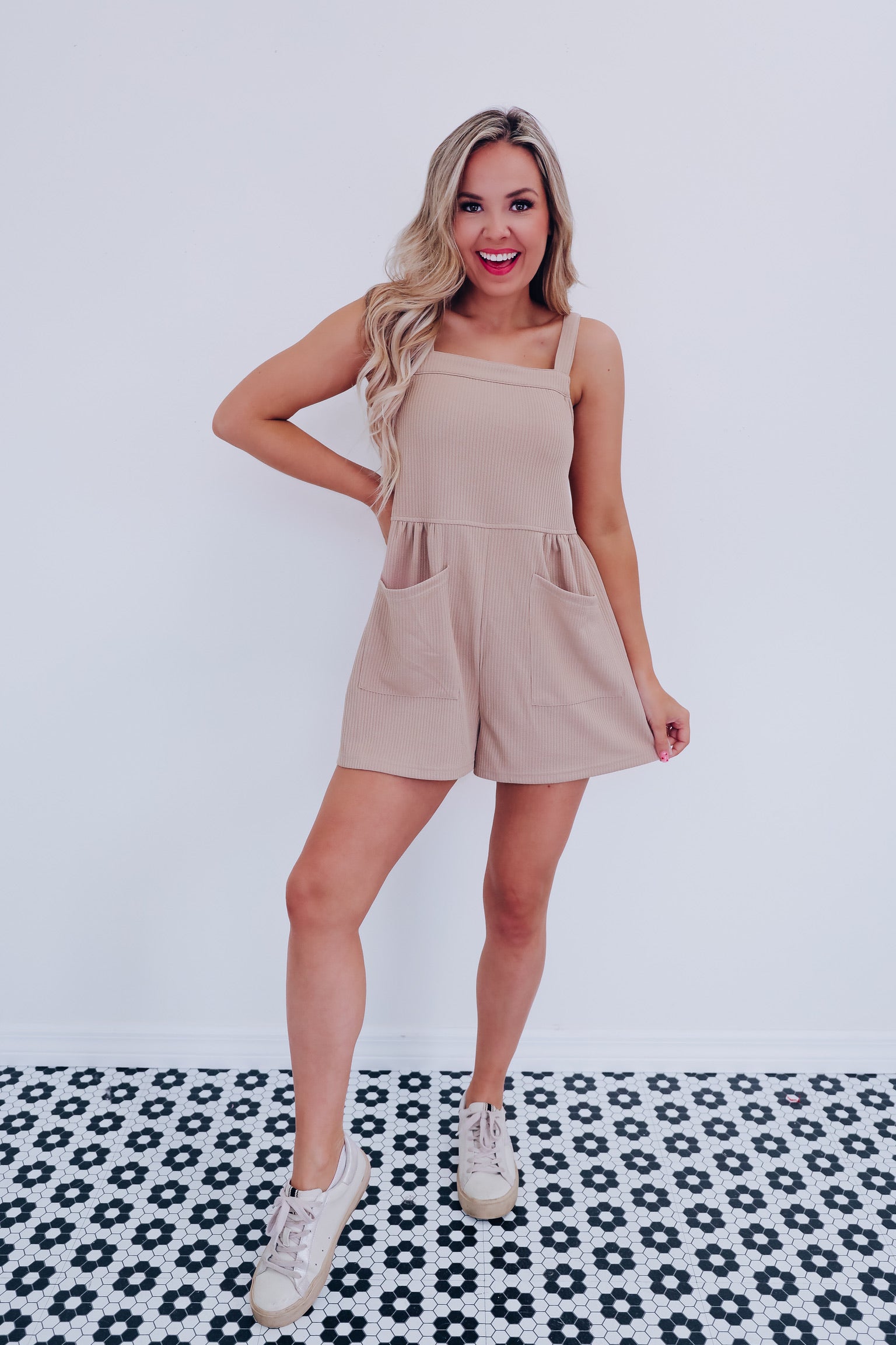 Bobi Ribbed Pocketed Romper- Taupe