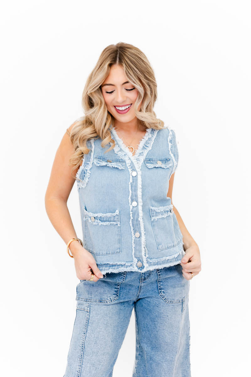 Meet your new layering obsession. The Frayed & Fabulous Denim Vest brings the perfect mix of chic, casual, and a little bit edgy. Designed with soft light-wash denim and finished with frayed trim throughout, this vest adds effortless texture and style to any look.