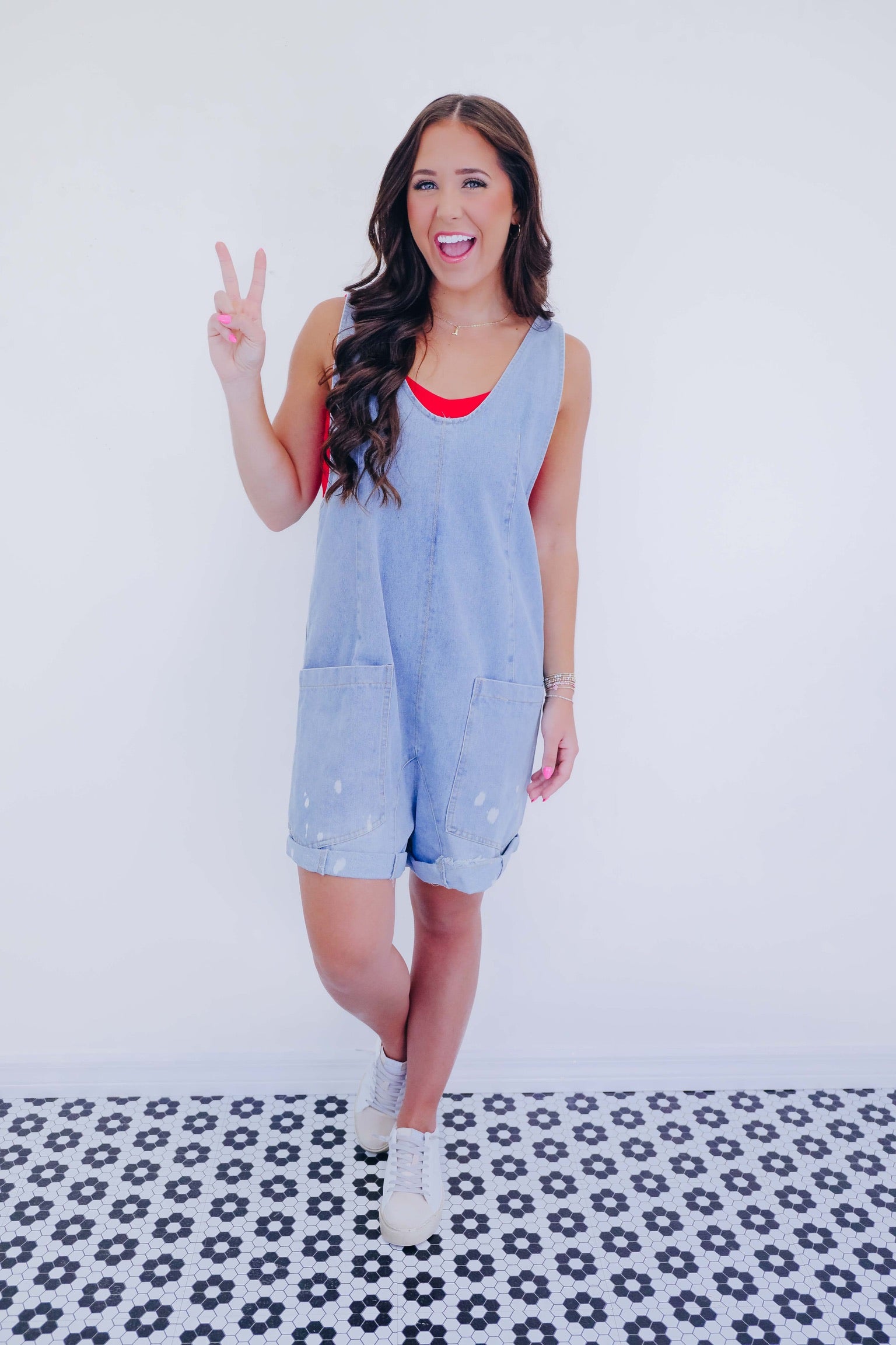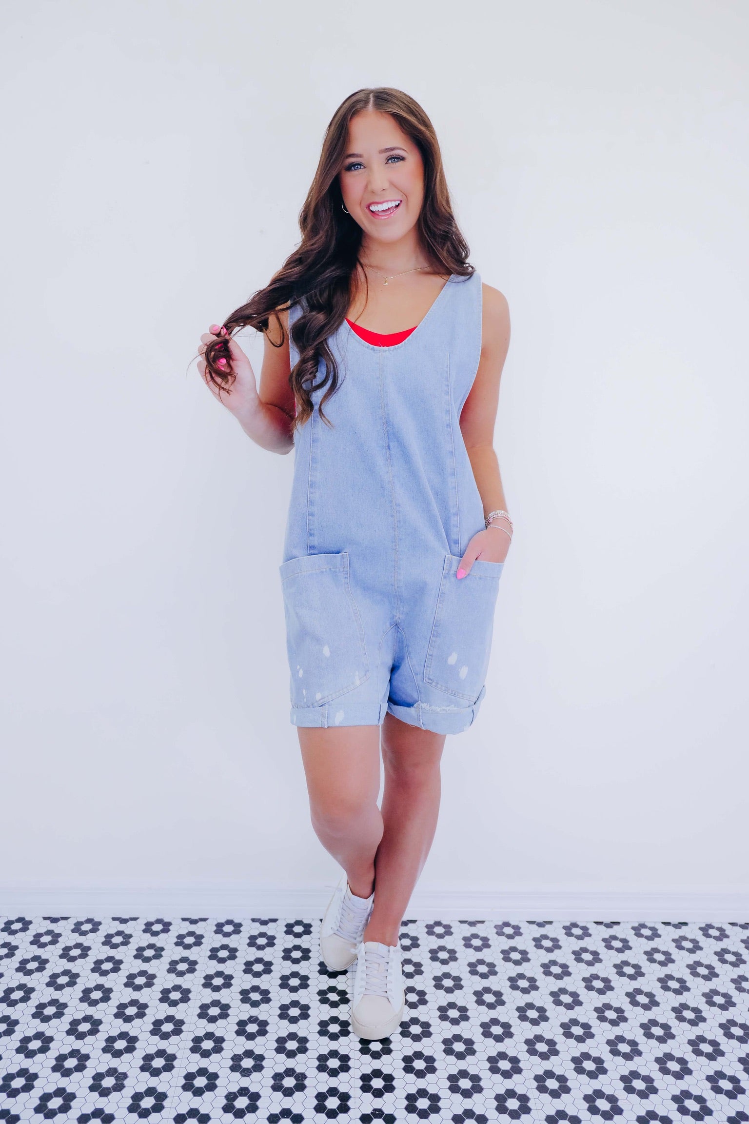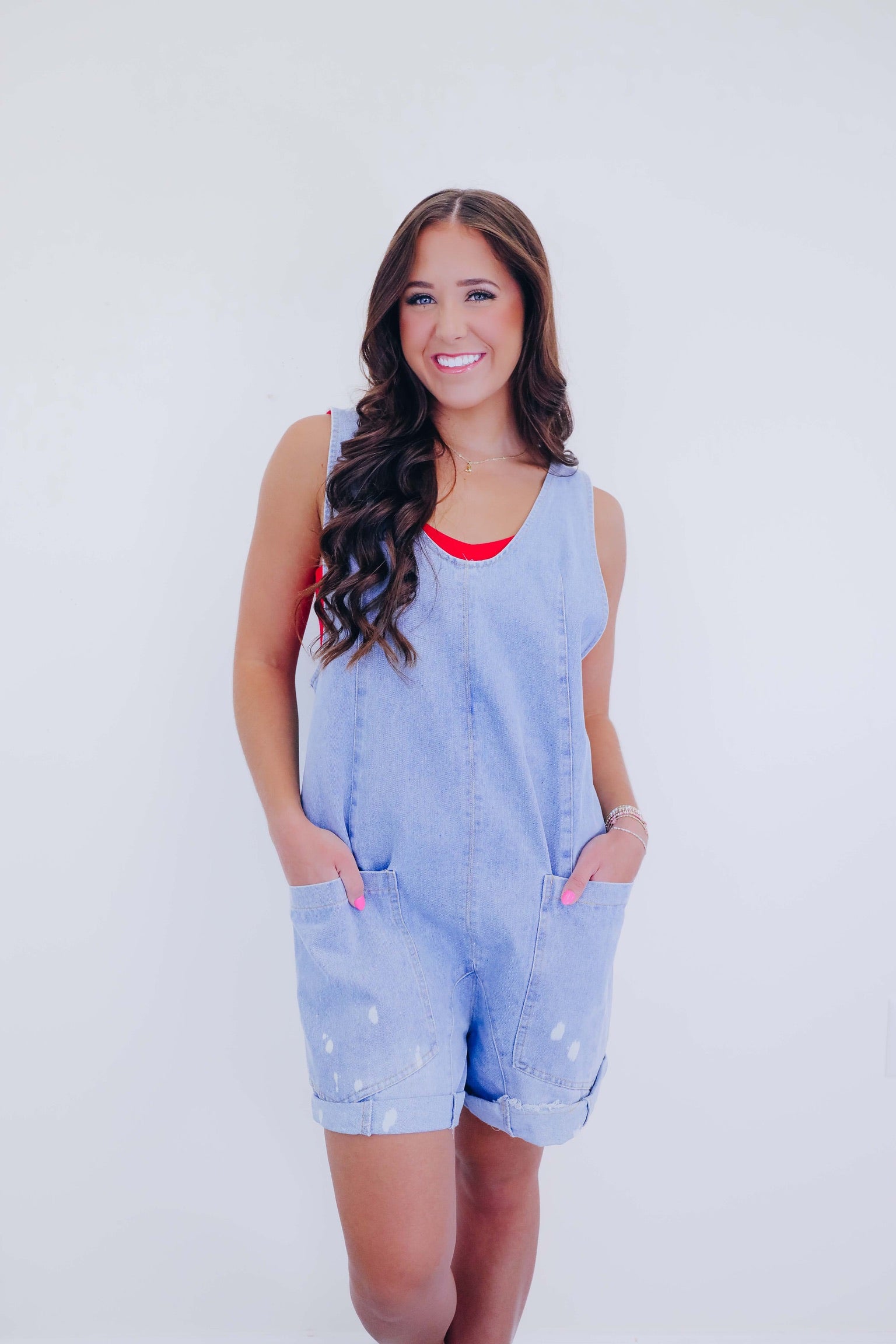 • Your summer wardrobe needs our new Scottie Scoop Neck Denim Shortalls. This comfy piece is perfect for pairing with your favorite boots for a country concert or style with a bralette and sneakers for a cute OOTD.