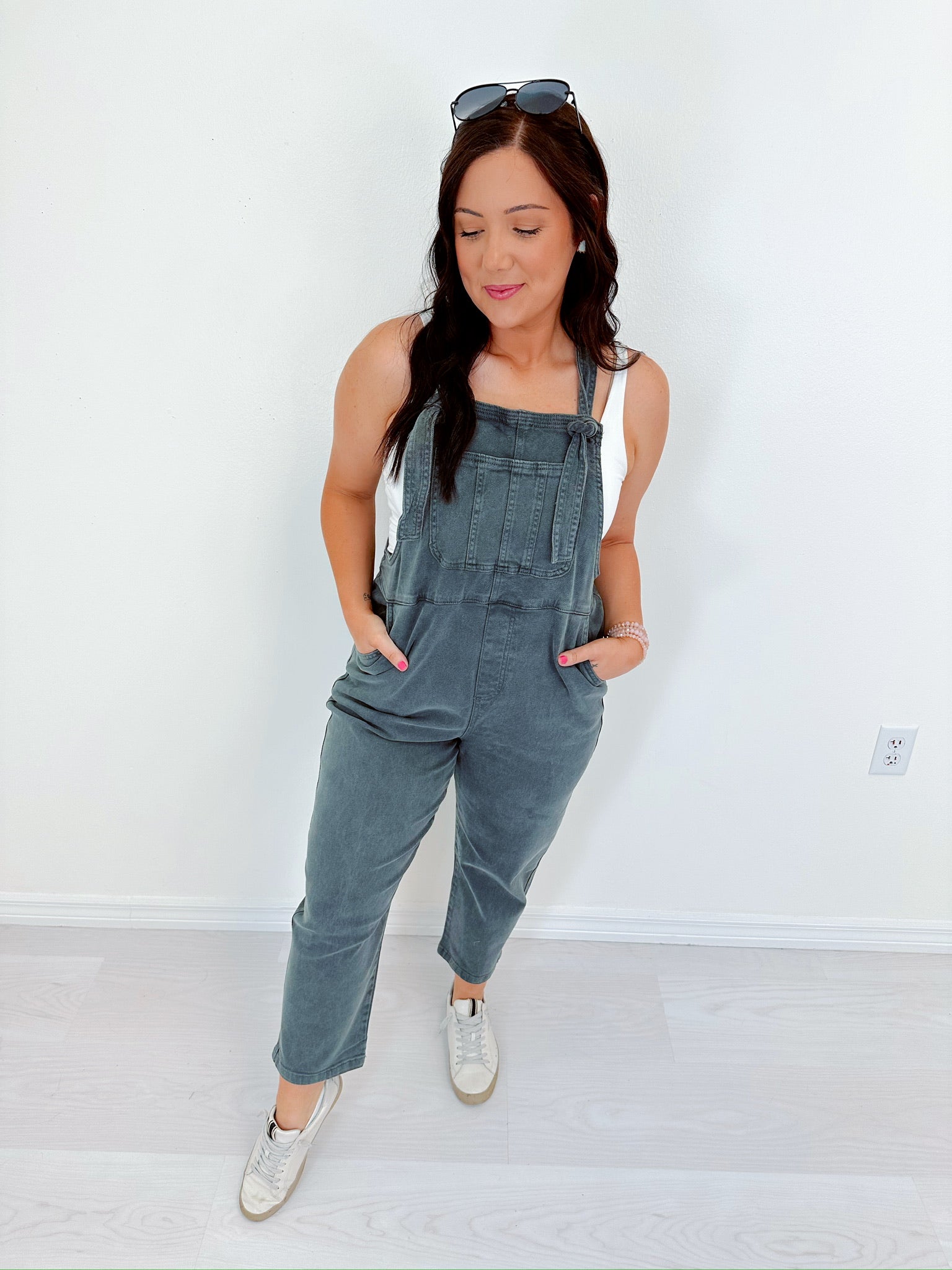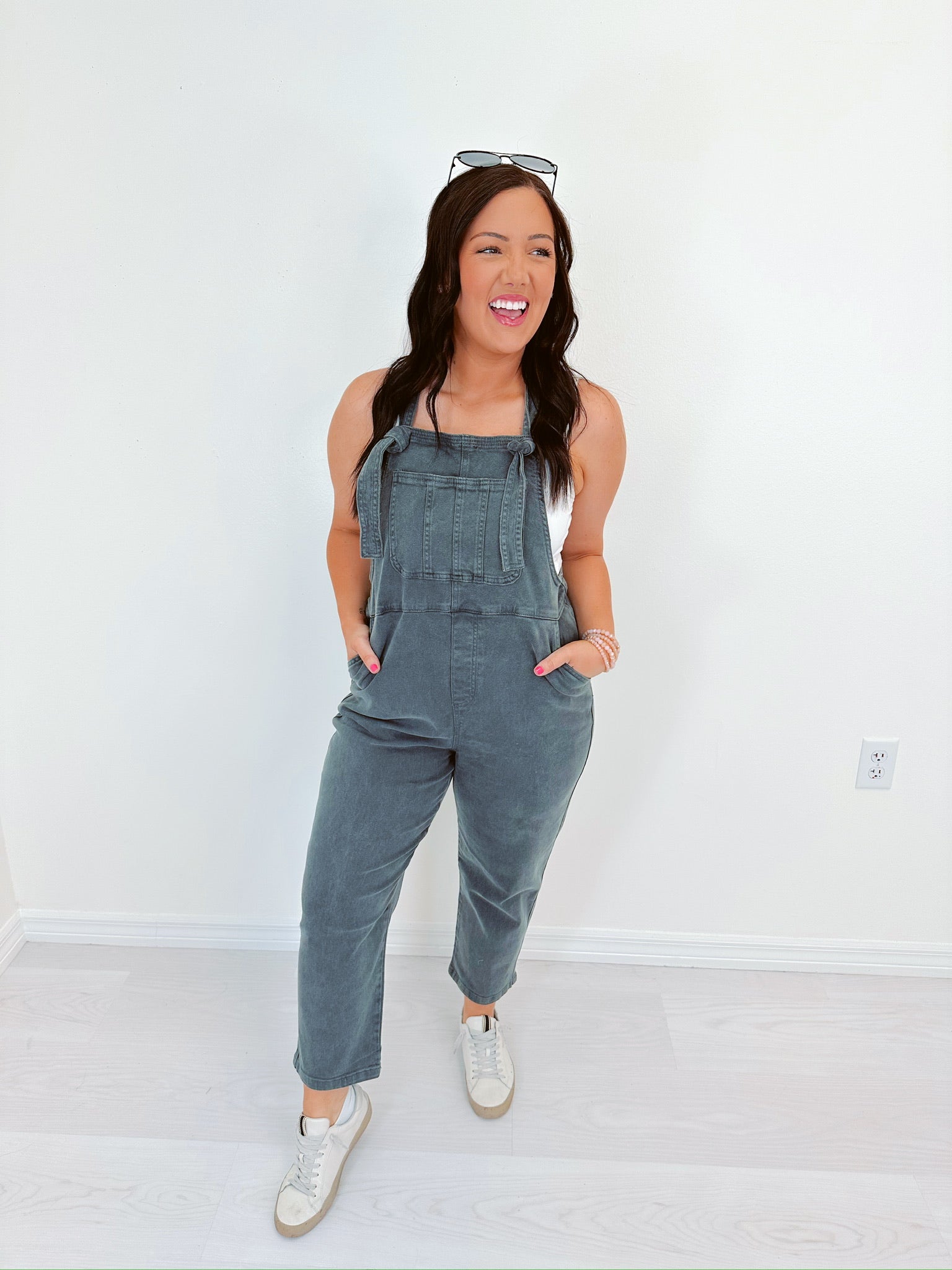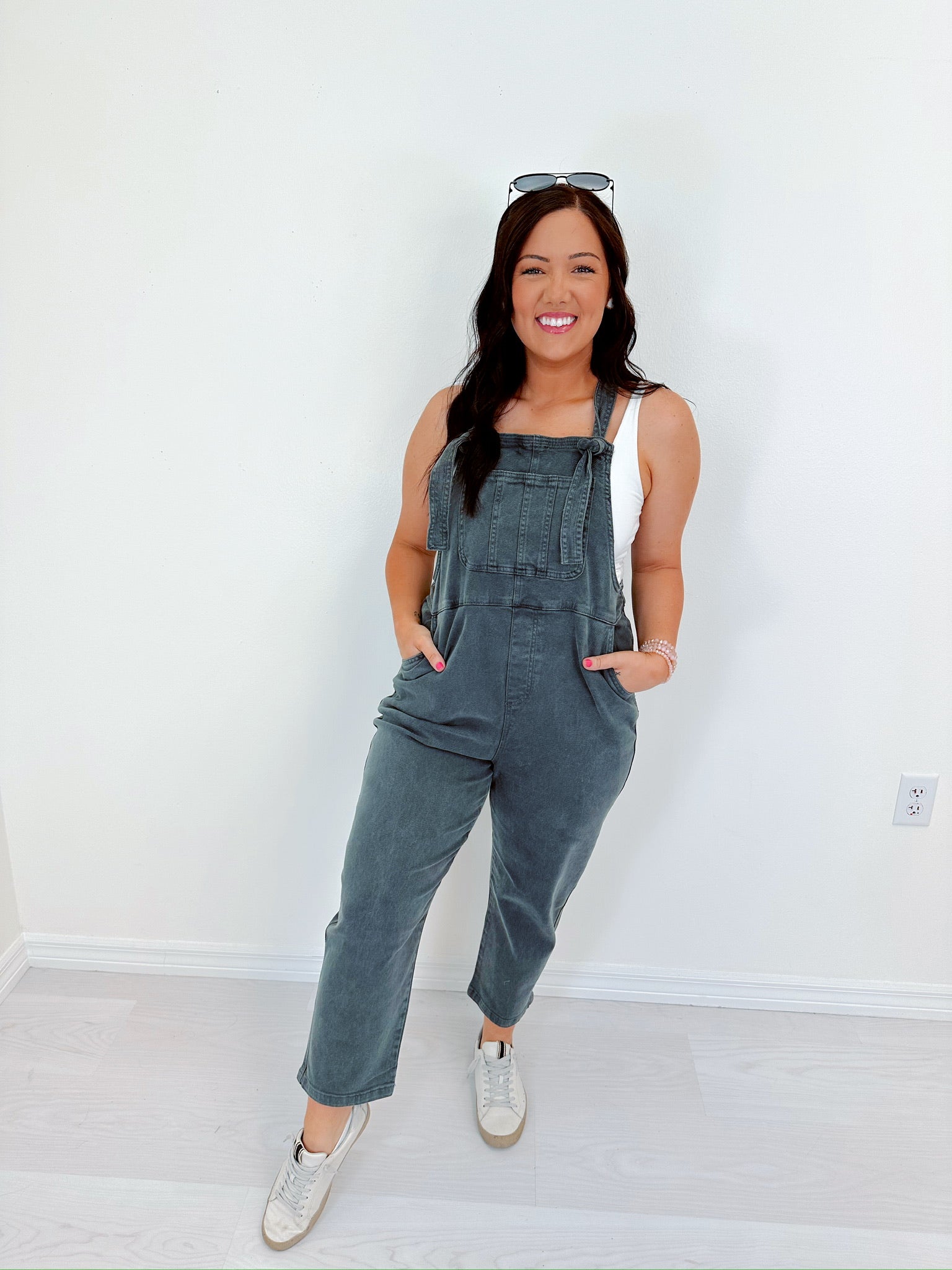 Kamryn Comfy Cropped Tie Knot Overalls - Ash Black