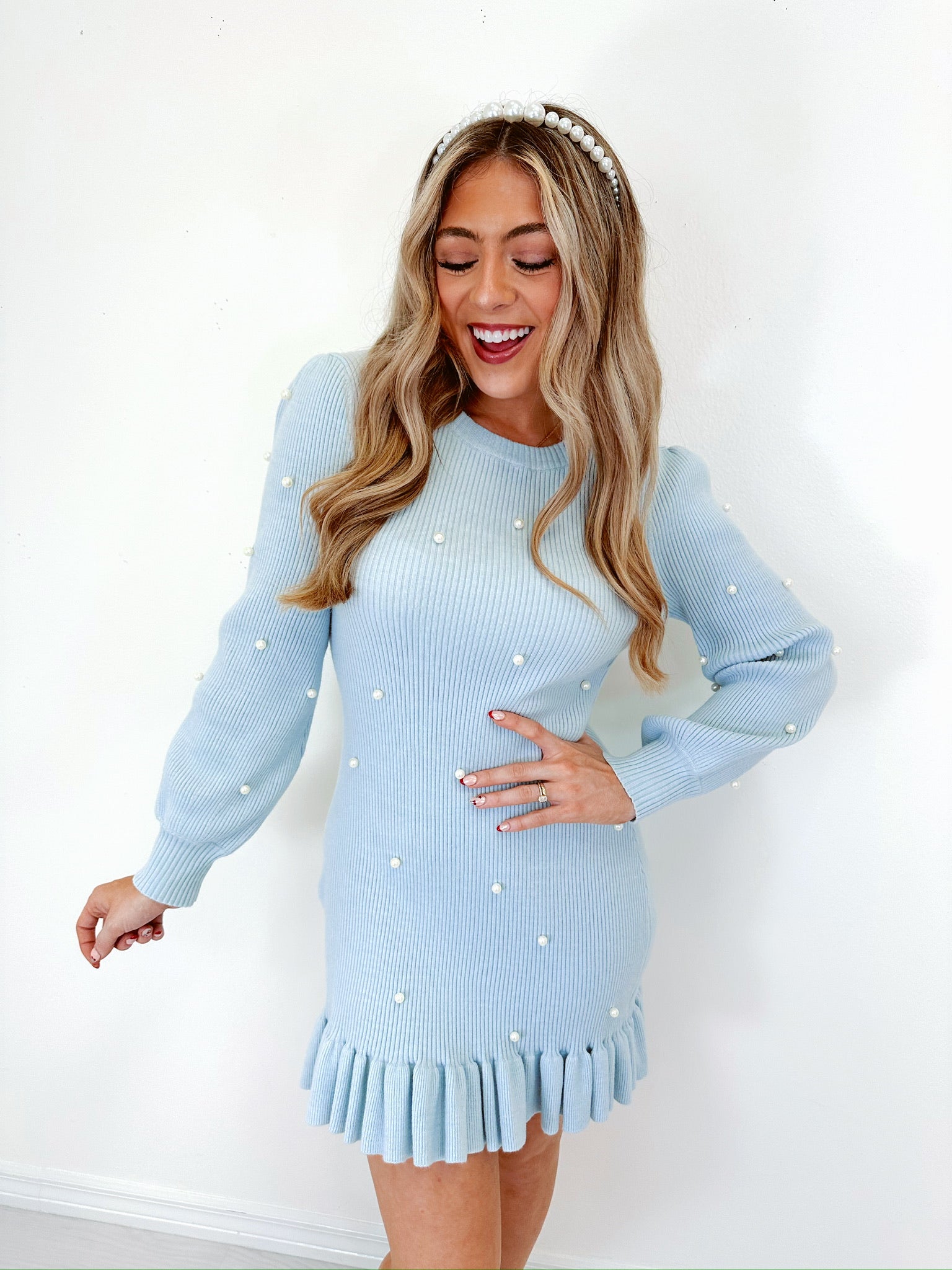Gracefully Chic Embellished Mini Sweater Dress - Baby Blue