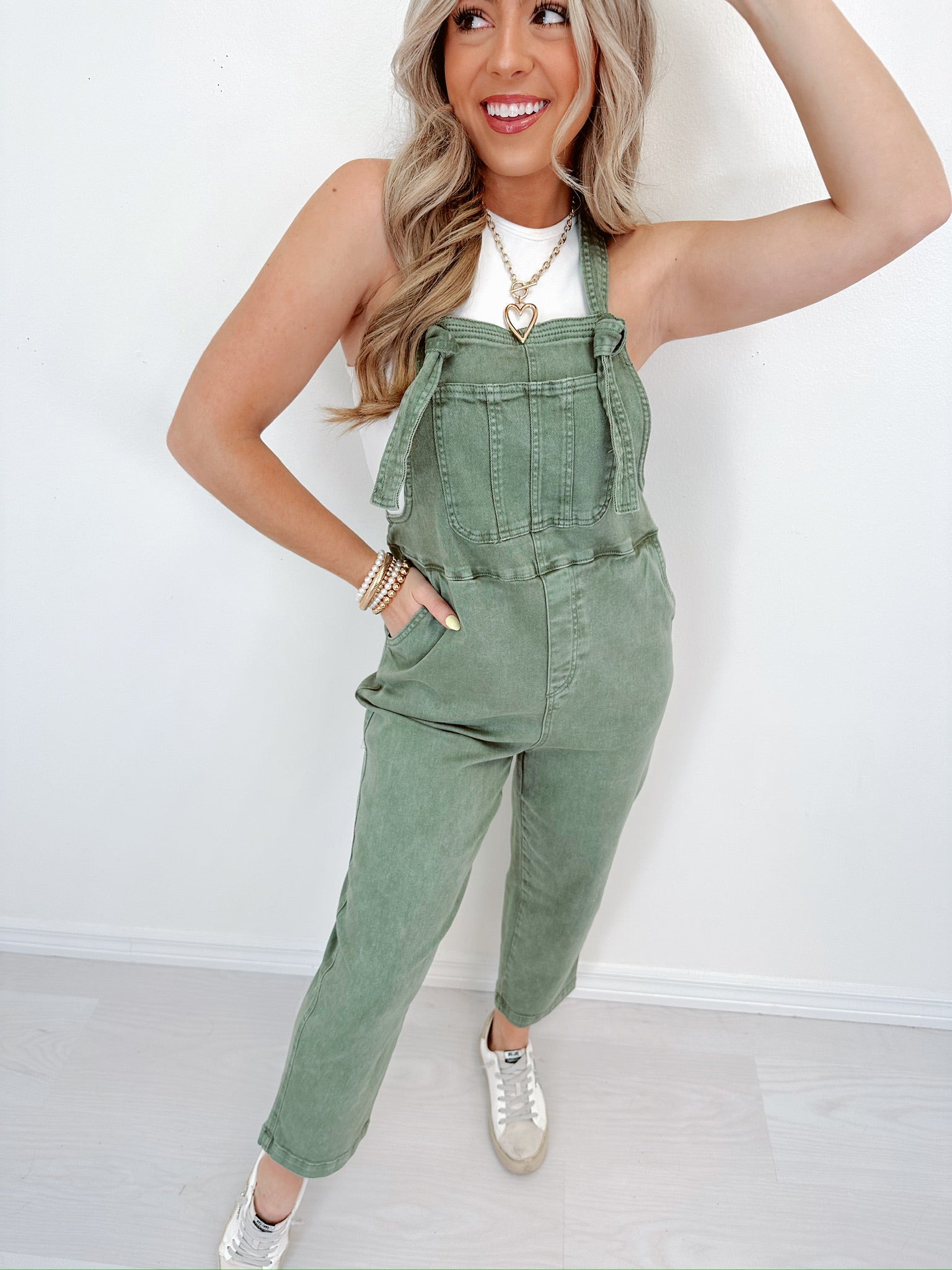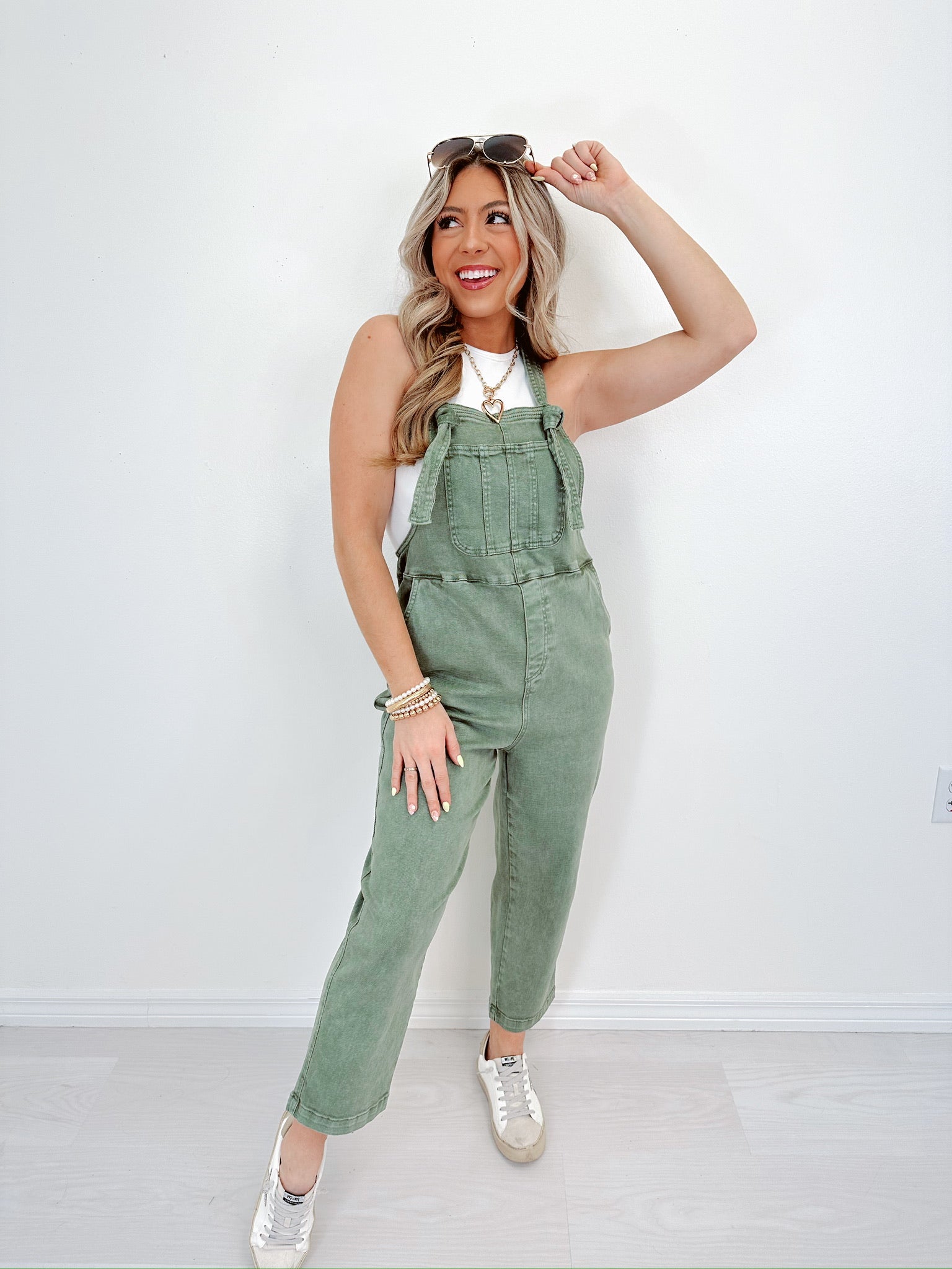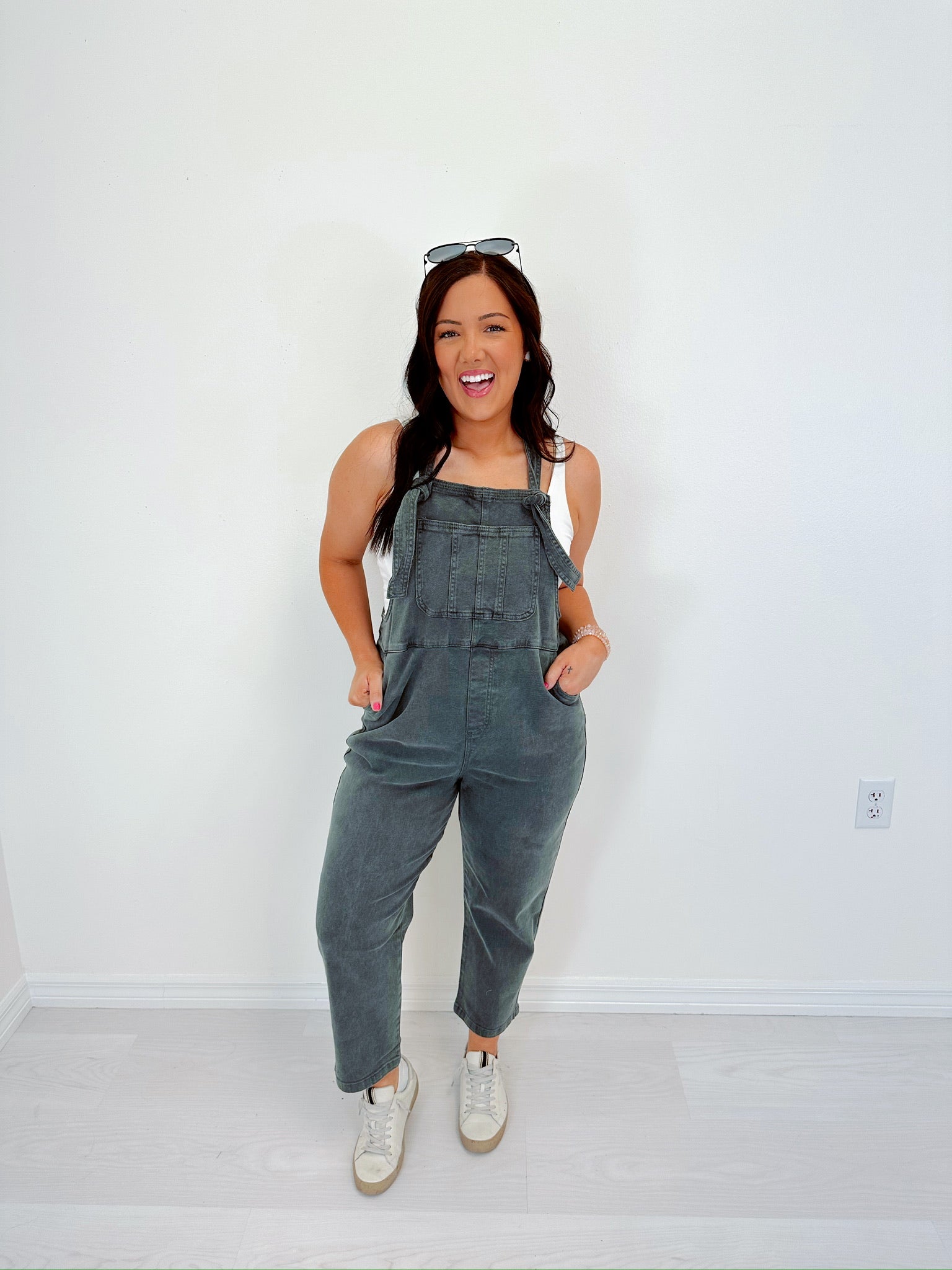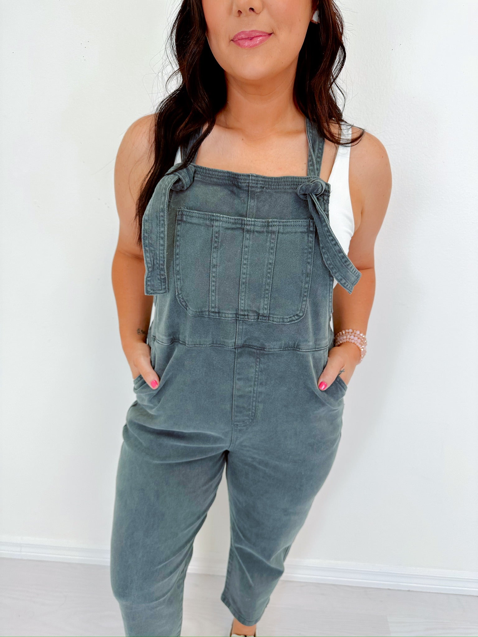 Kamryn Comfy Cropped Tie Knot Overalls - Olive