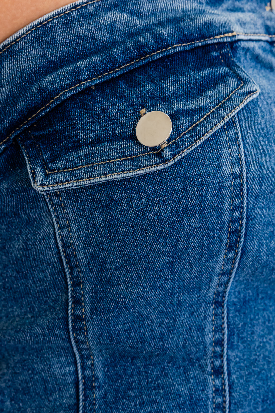 • Featuring a stretch dark denim fabric, a strapless sillouhette with a full length button front, two faux flap button pockets, and a straight mini length hem.
