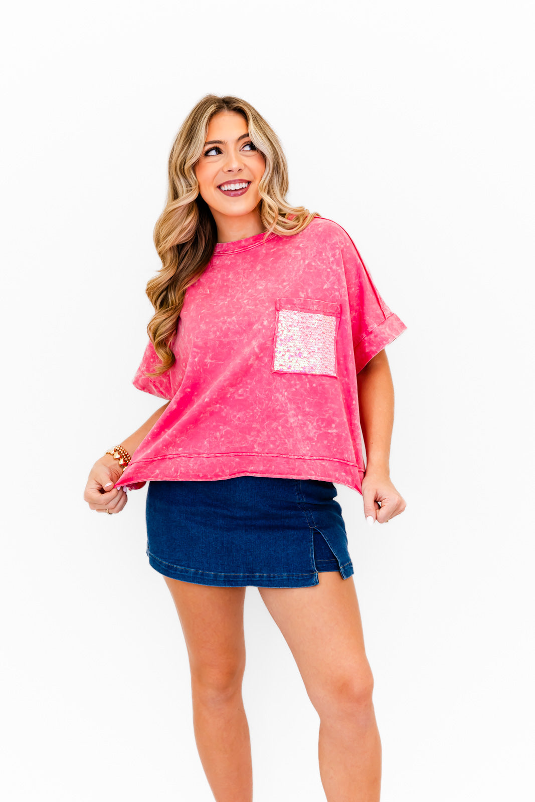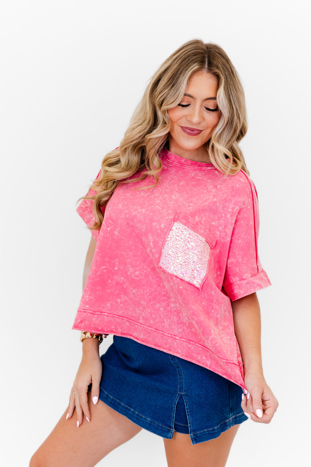 Crafted from soft, lightweight cotton, it features a round neckline, relaxed short dolman sleeves, raw seam details, and a standout front patch pocket embellished with sequins. The unique mineral wash gives it that lived-in, vintage feel you’ll love. No two are exactly alike — each piece is truly one-of-a-kind!