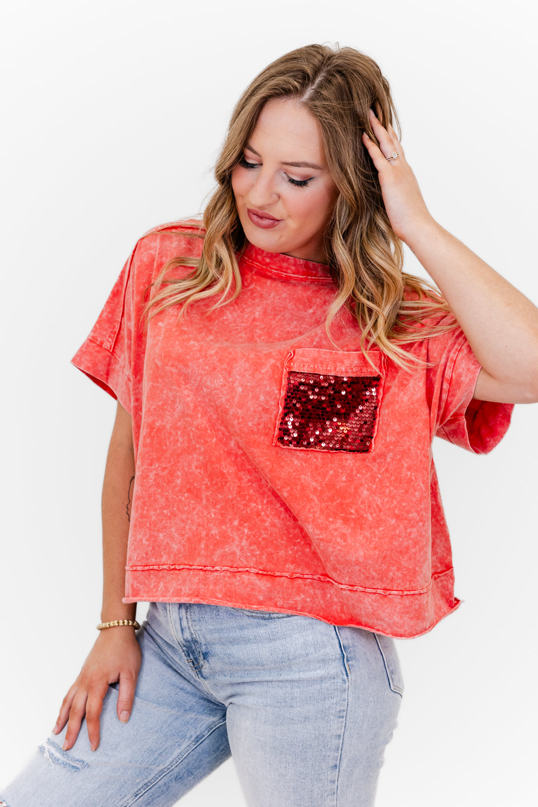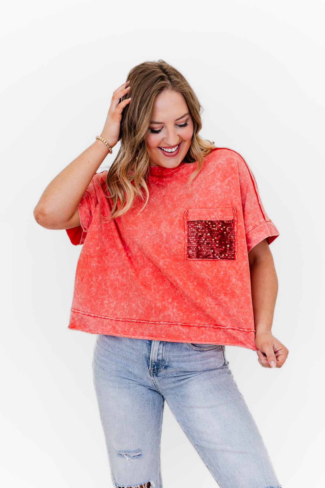 • Crafted from soft, lightweight cotton, it features a round neckline, relaxed short dolman sleeves, raw seam details, and a standout front patch pocket embellished with sequins. The unique mineral wash gives it that lived-in, vintage feel you’ll love. No two are exactly alike — each piece is truly one-of-a-kind!