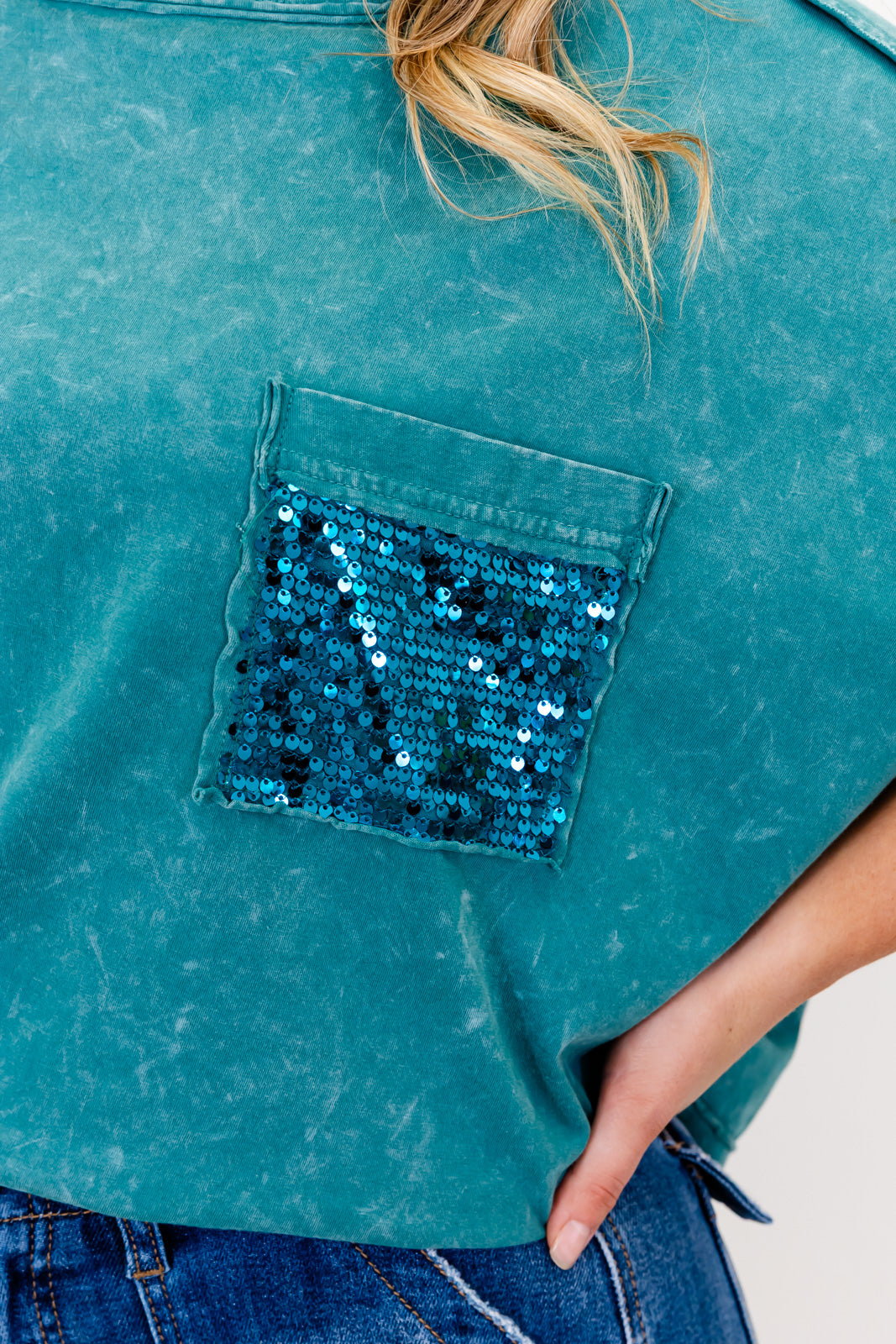 - Crafted from soft, lightweight cotton, it features a round neckline, relaxed short dolman sleeves, raw seam details, and a standout front patch pocket embellished with sequins. The unique mineral wash gives it that lived-in, vintage feel you’ll love. No two are exactly alike — each piece is truly one-of-a-kind!