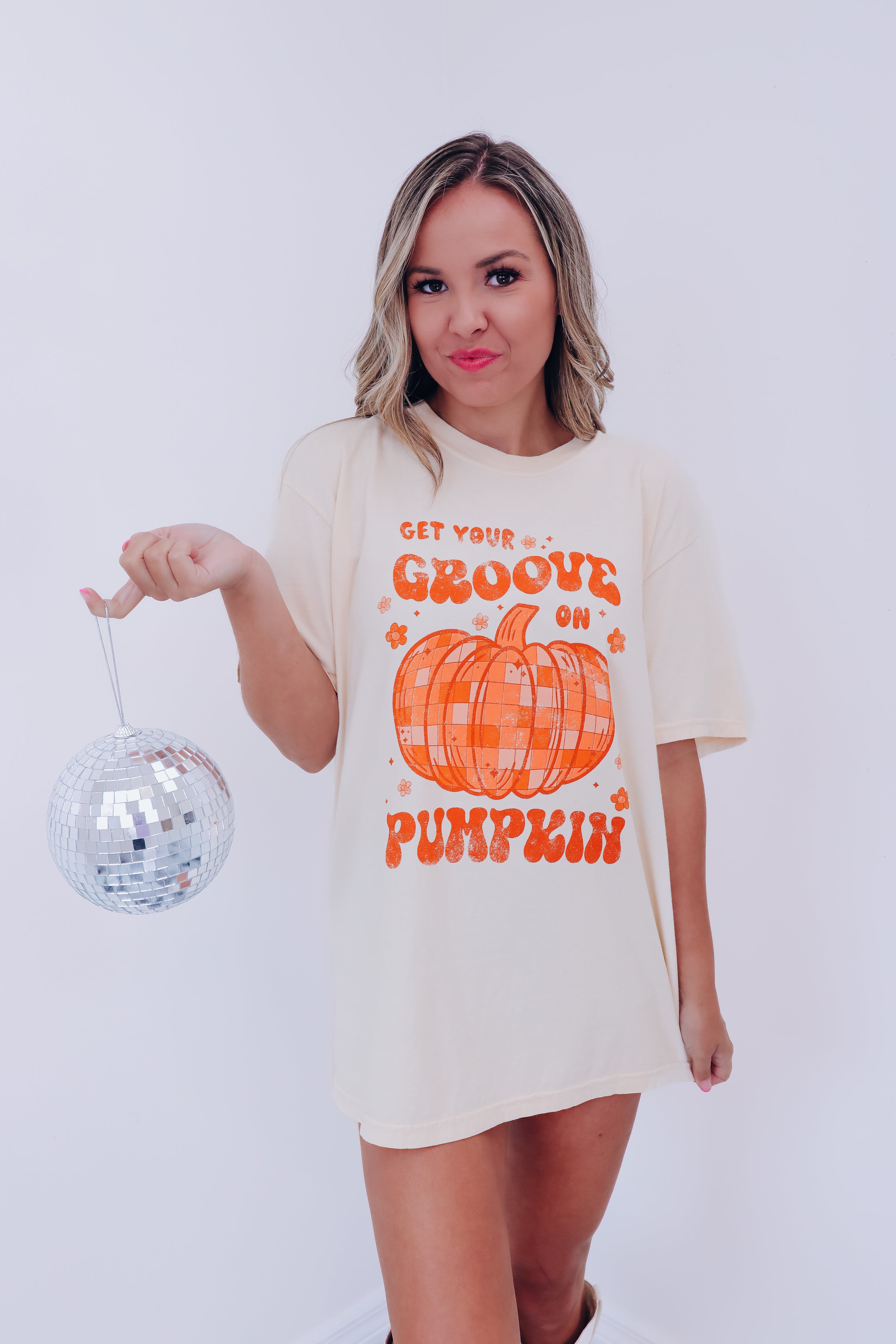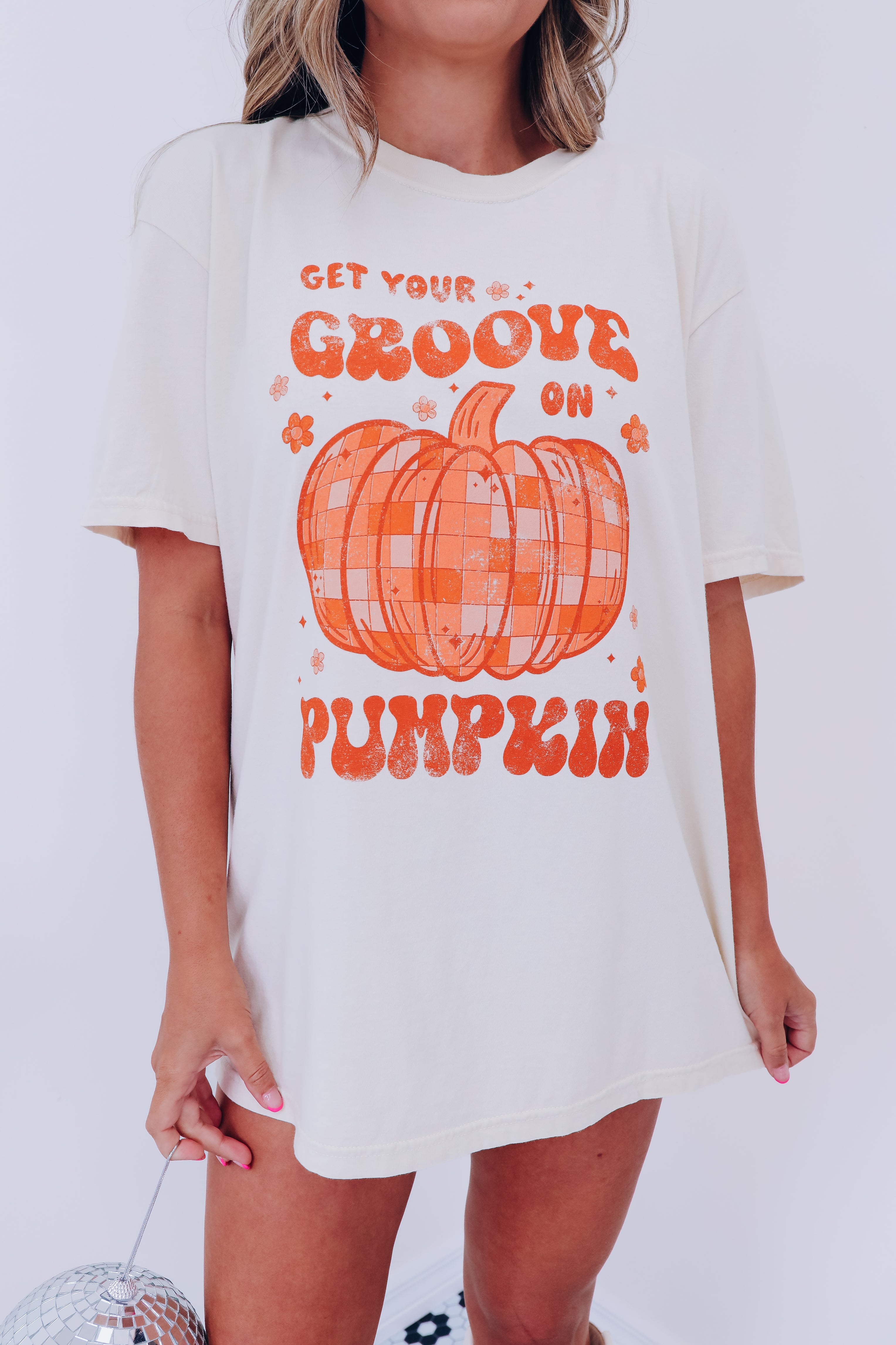- Get your groove on pumpkin! This graphic tee is super cute for the fall time. We love to size up and wear our graphic tees as a dress with boots! The perfect choice for a festival, walking around with trick-or-treaters, or just on a casual day to show off your love for the fall season.