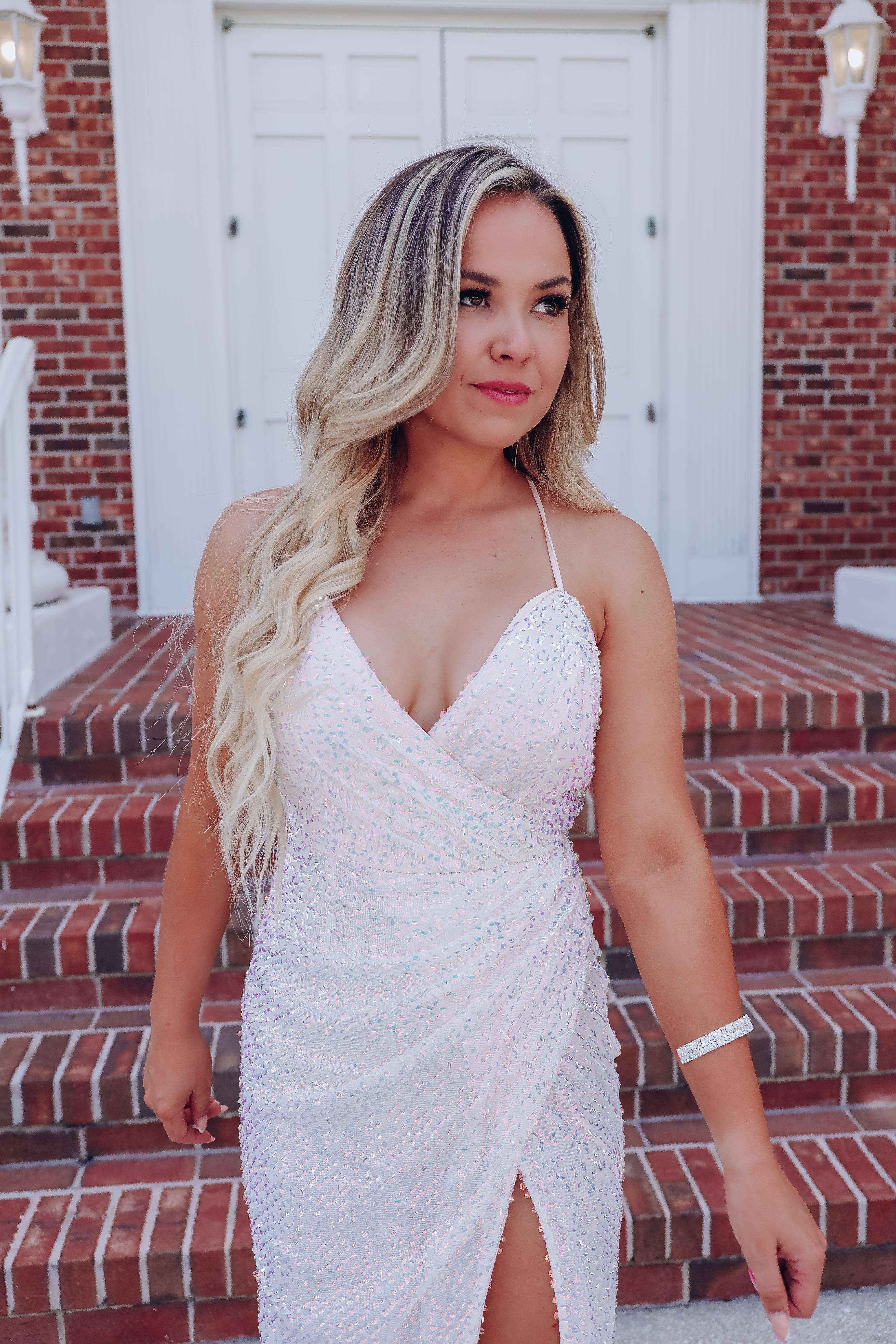 - This gorgeous dress features a fully lined mesh sequined fabric, deep V sweetheart neckline, an invisible zip closure on the back skirt, a ruching detail from the waist to the thigh high side slit, a maxi length hem, and the spaghetti straps that crisscross on the open back are adjustable with a self tie detail.