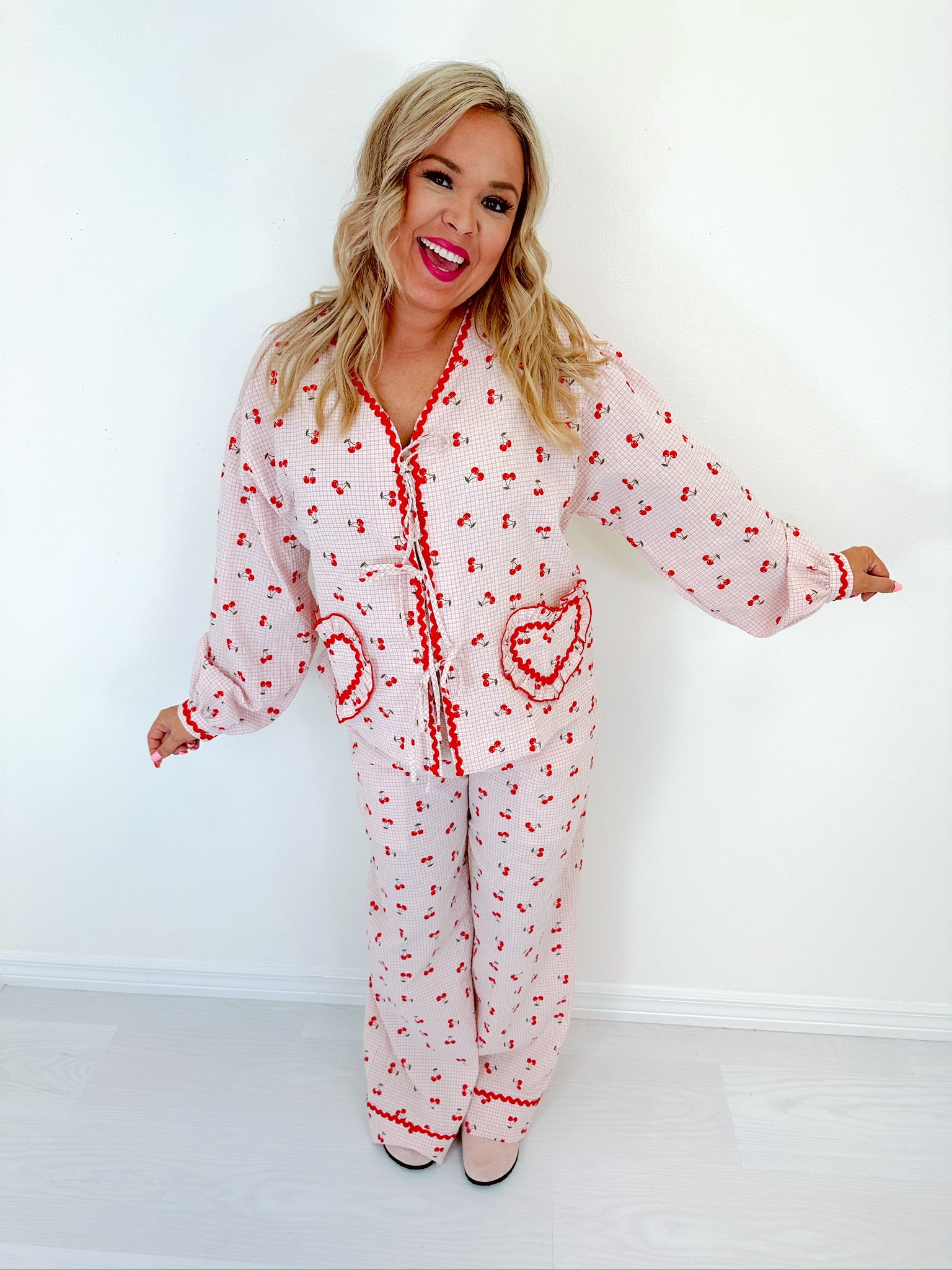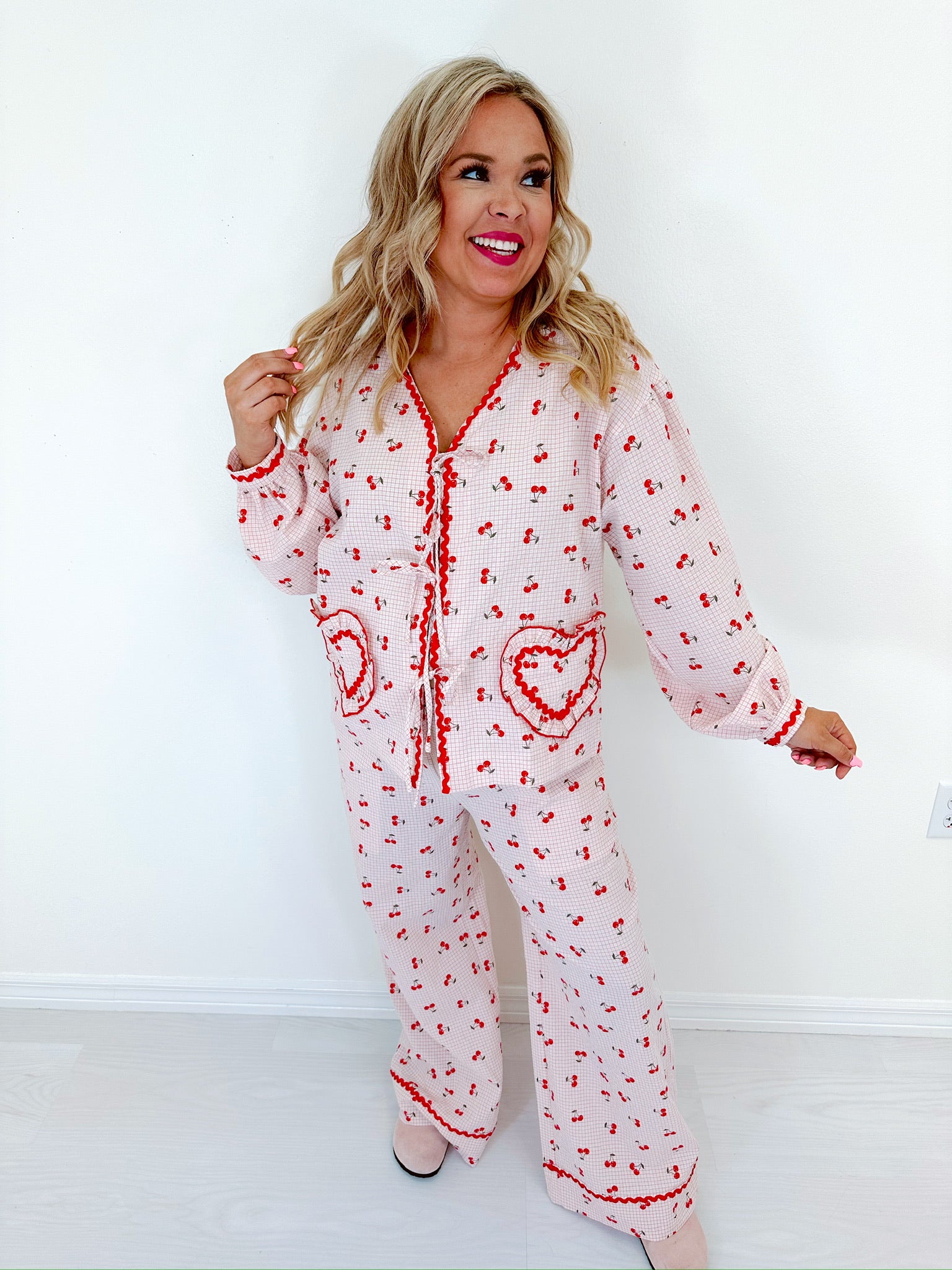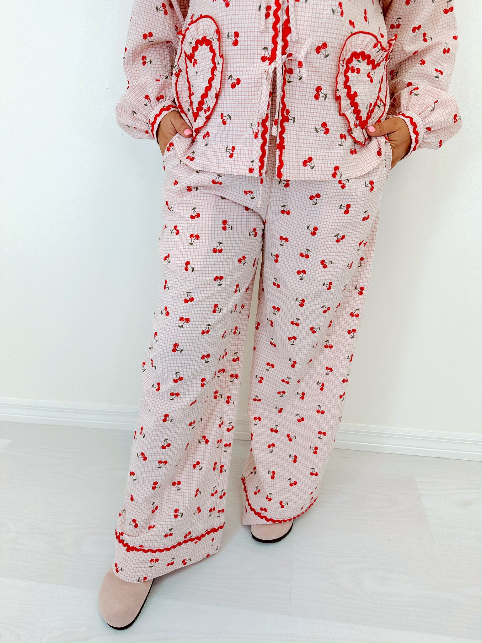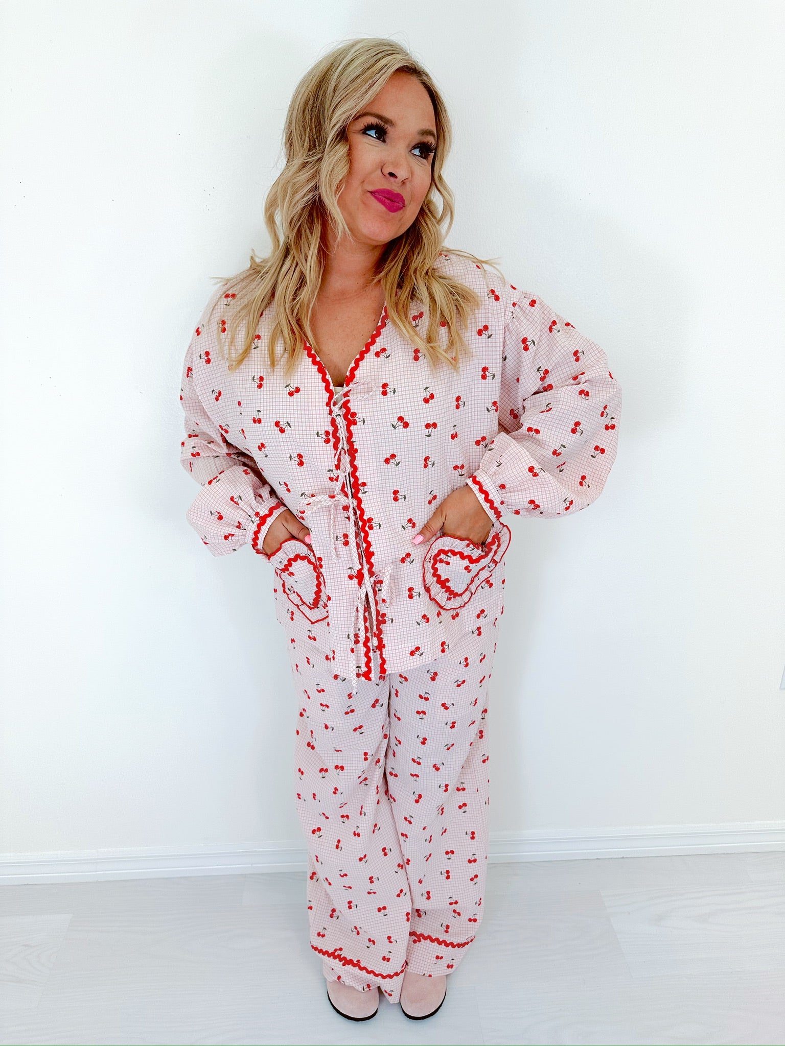Georgie Gingham & Cherry Wide Leg Lounge Set - Pink