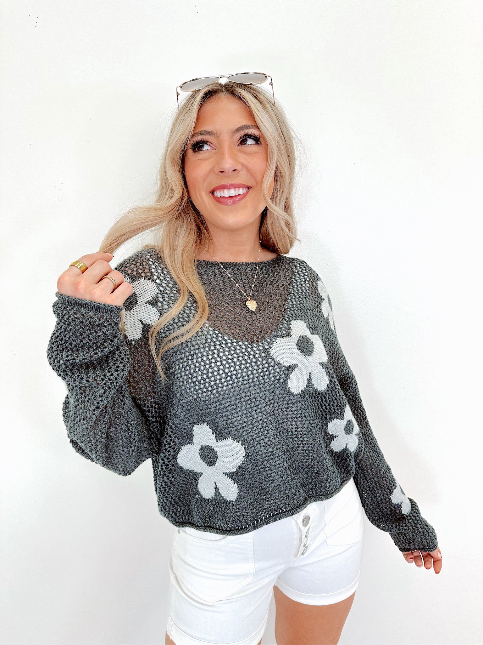 Boho Breezy Floral Crochet Knit Sweater - Charcoal