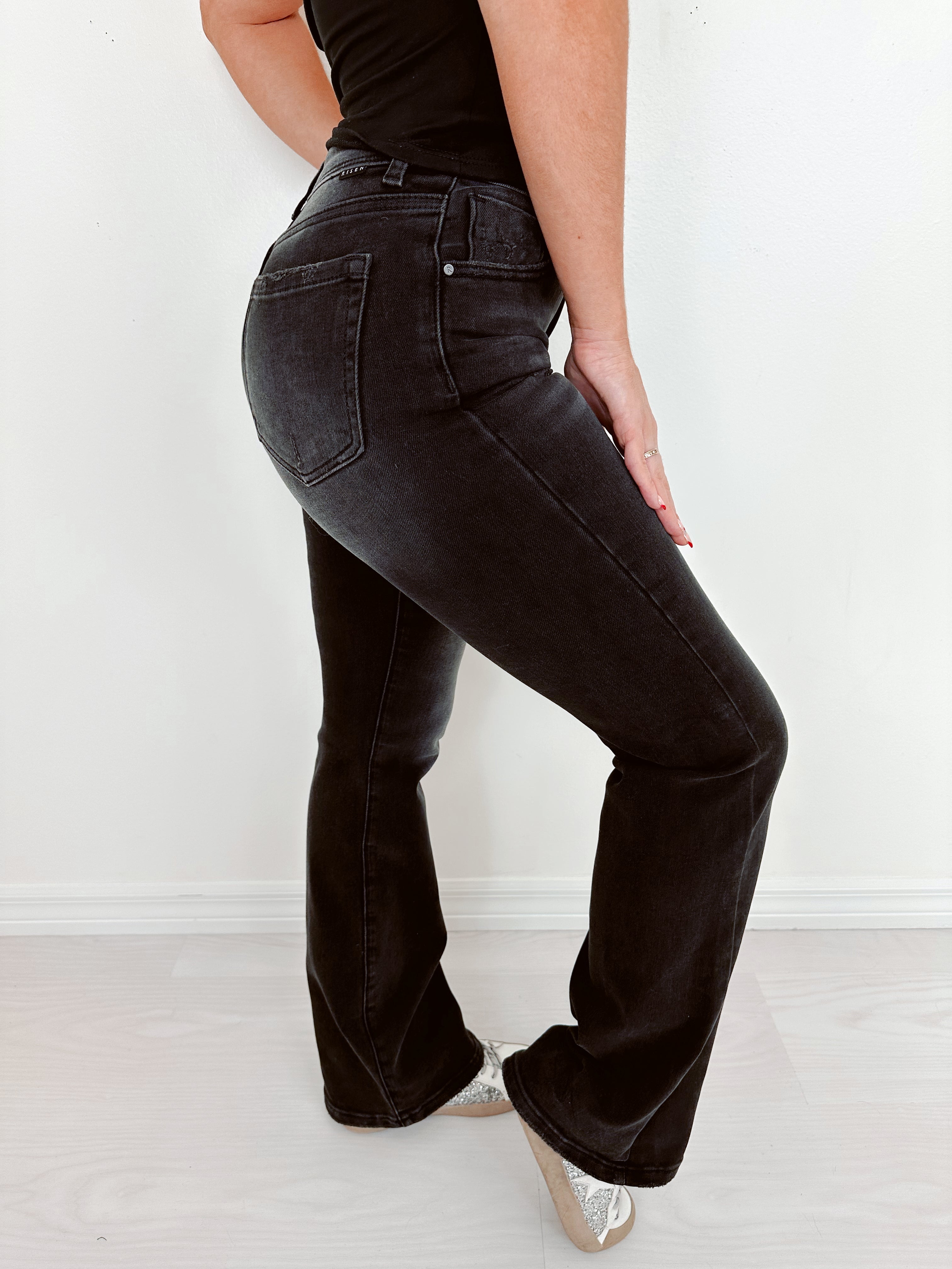 • Our Bruno Bootcut Black Denim Jeans are a timeless and stylish addition to your wardrobe, seamlessly transitioning from a trendy OOTD to a date night fit. These versatile jeans will be a go to time and again.