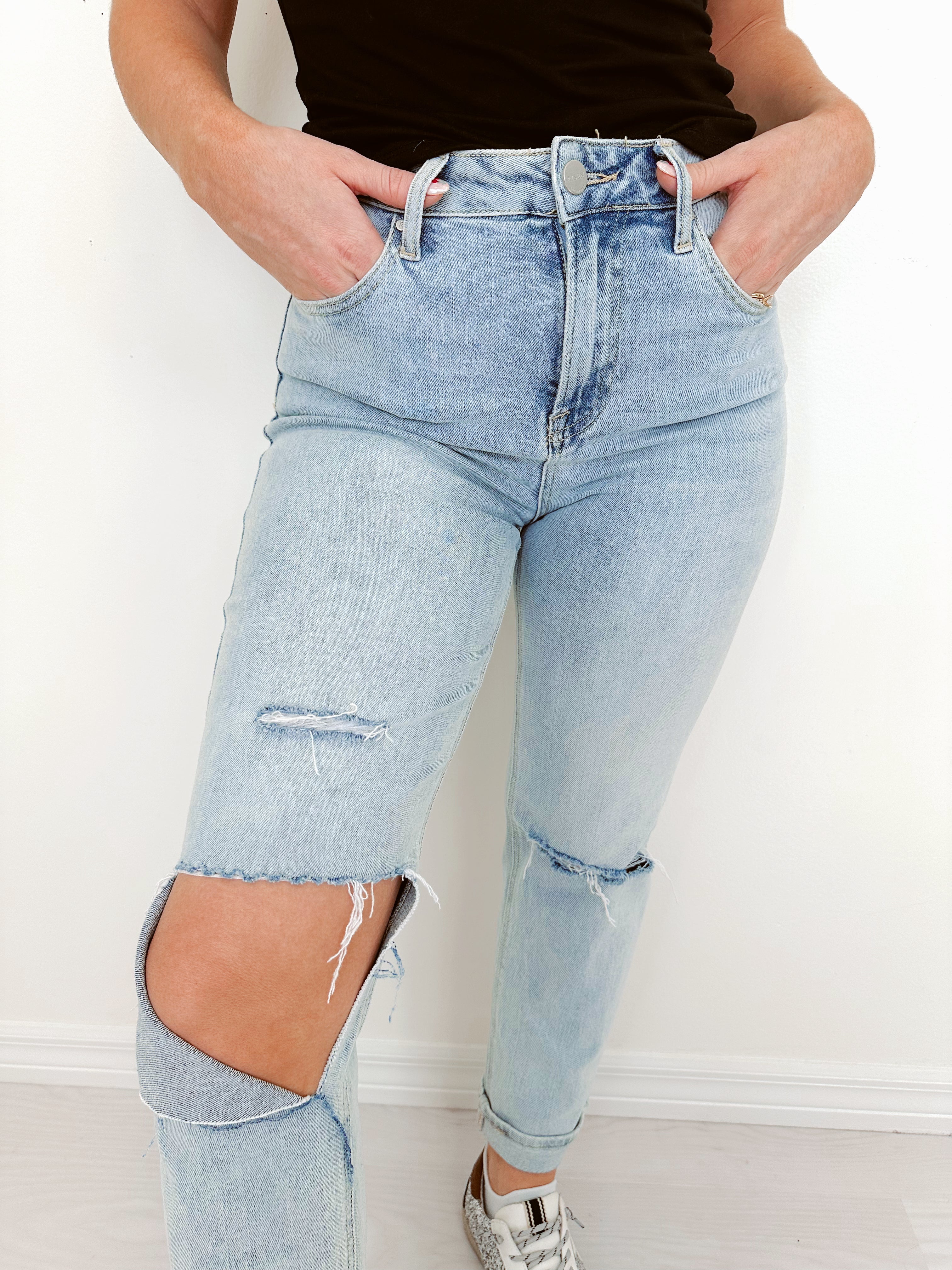 - Features a light wash denim fabric, super high waist, relaxed thigh and hip, button and zip closure, 5 pocket design, and a cut out knee with added distressing.