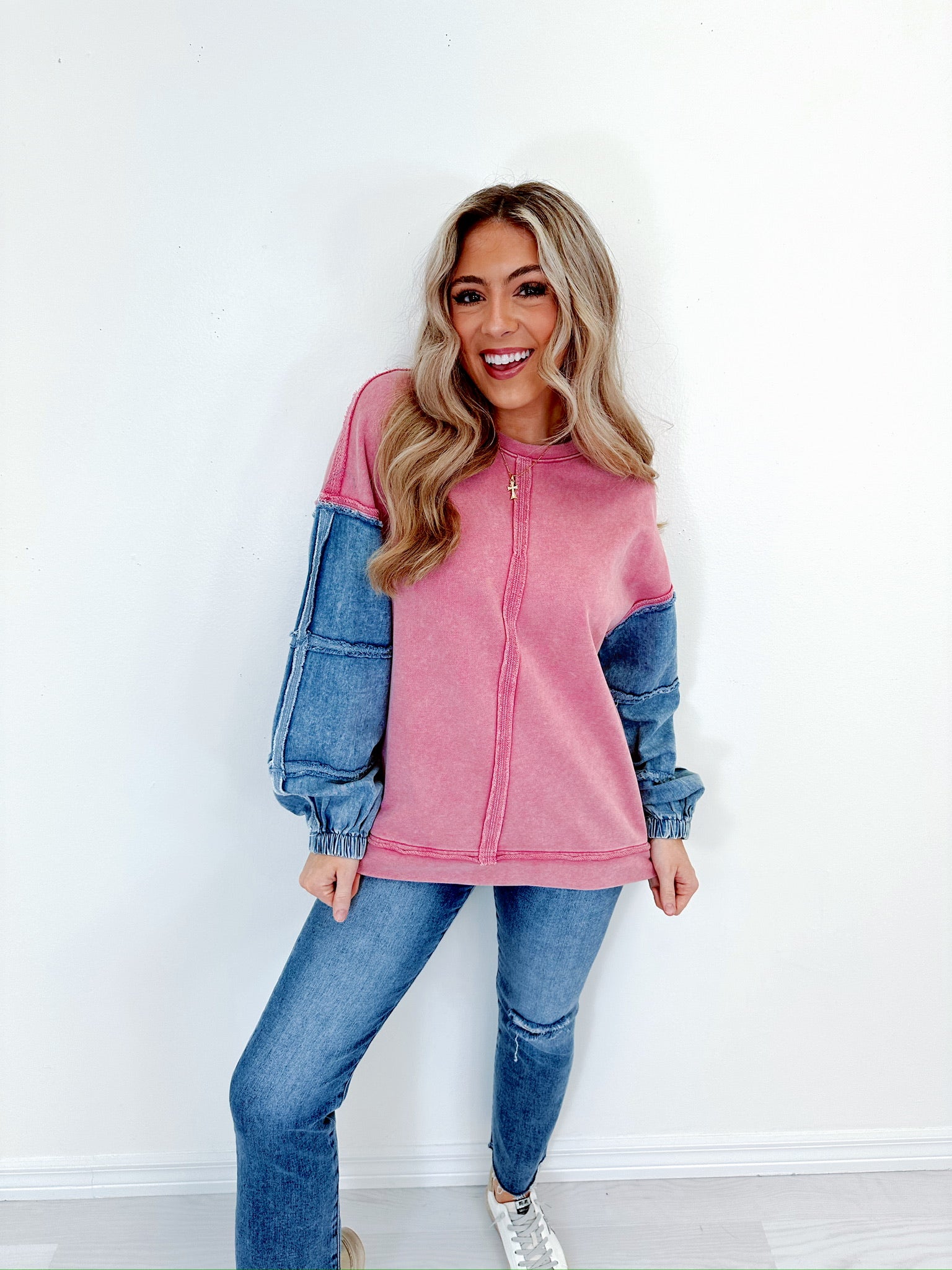 - Featuring a super soft jersey knit fabric body and a chambray fabric full length blocked sleeve with frayed details, a round neck, a drop shoulder, and is completed with outseam frayed detailing throughout and a banded straight hem.